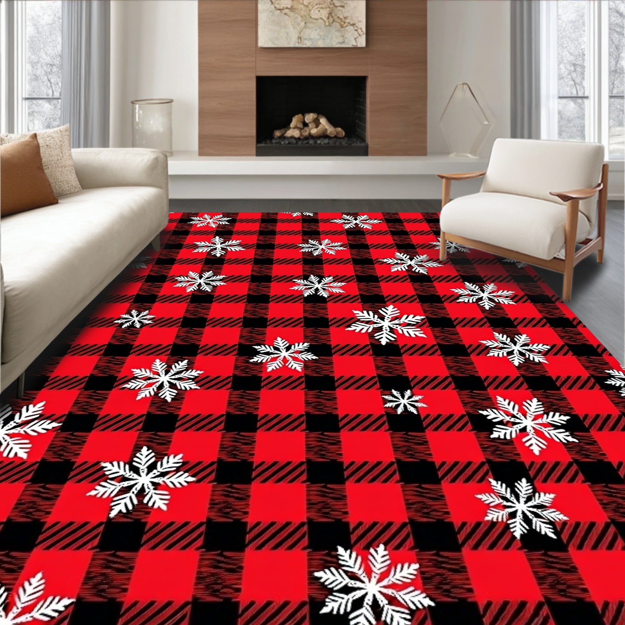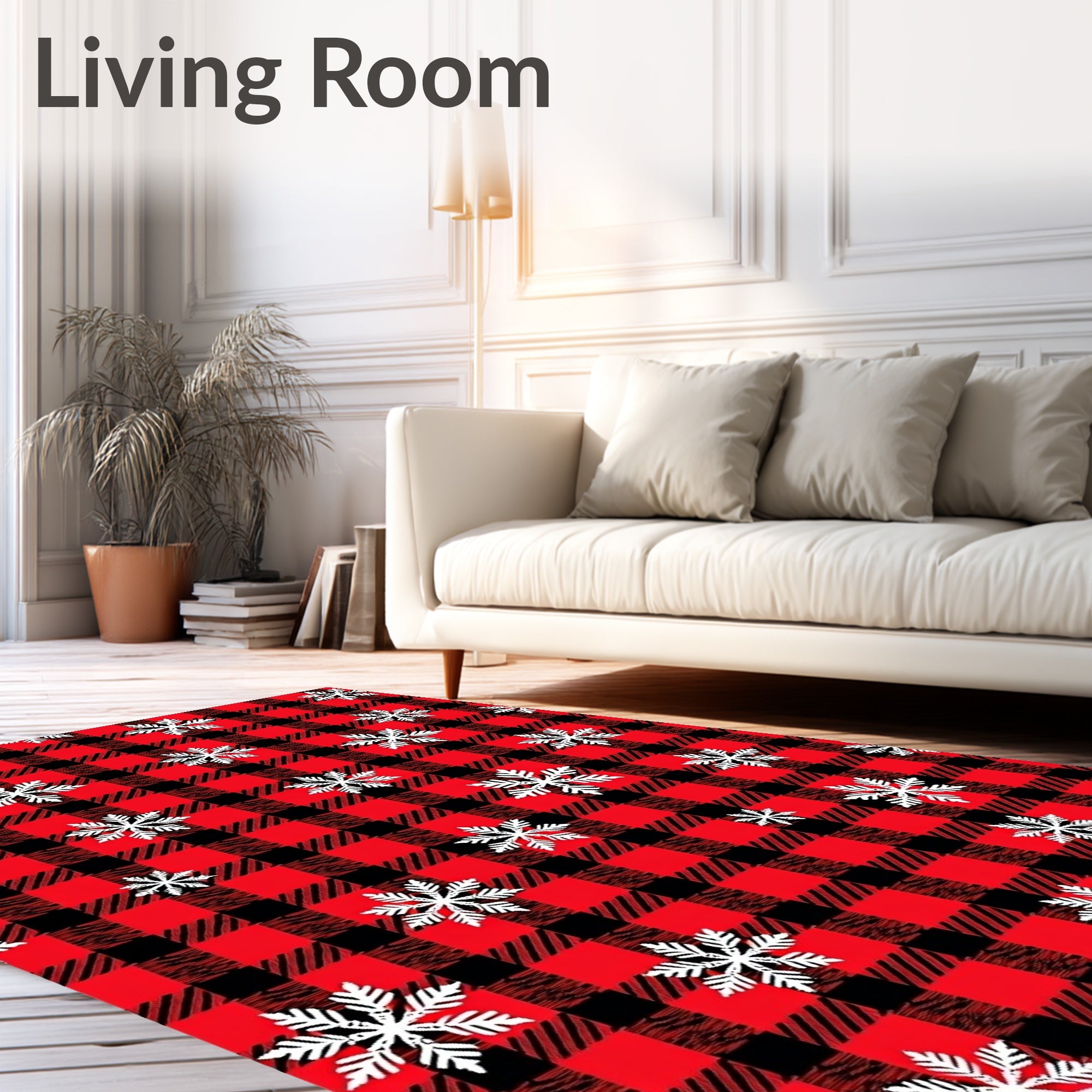 Ultra Soft Area Rug, Non Slip, Stain Resistant, Washable Area Rugs for Living Room, Bedroom, Nordic Snowflake Gingham Featuring Holiday Plaid and Starburst Details(Red) Overview: