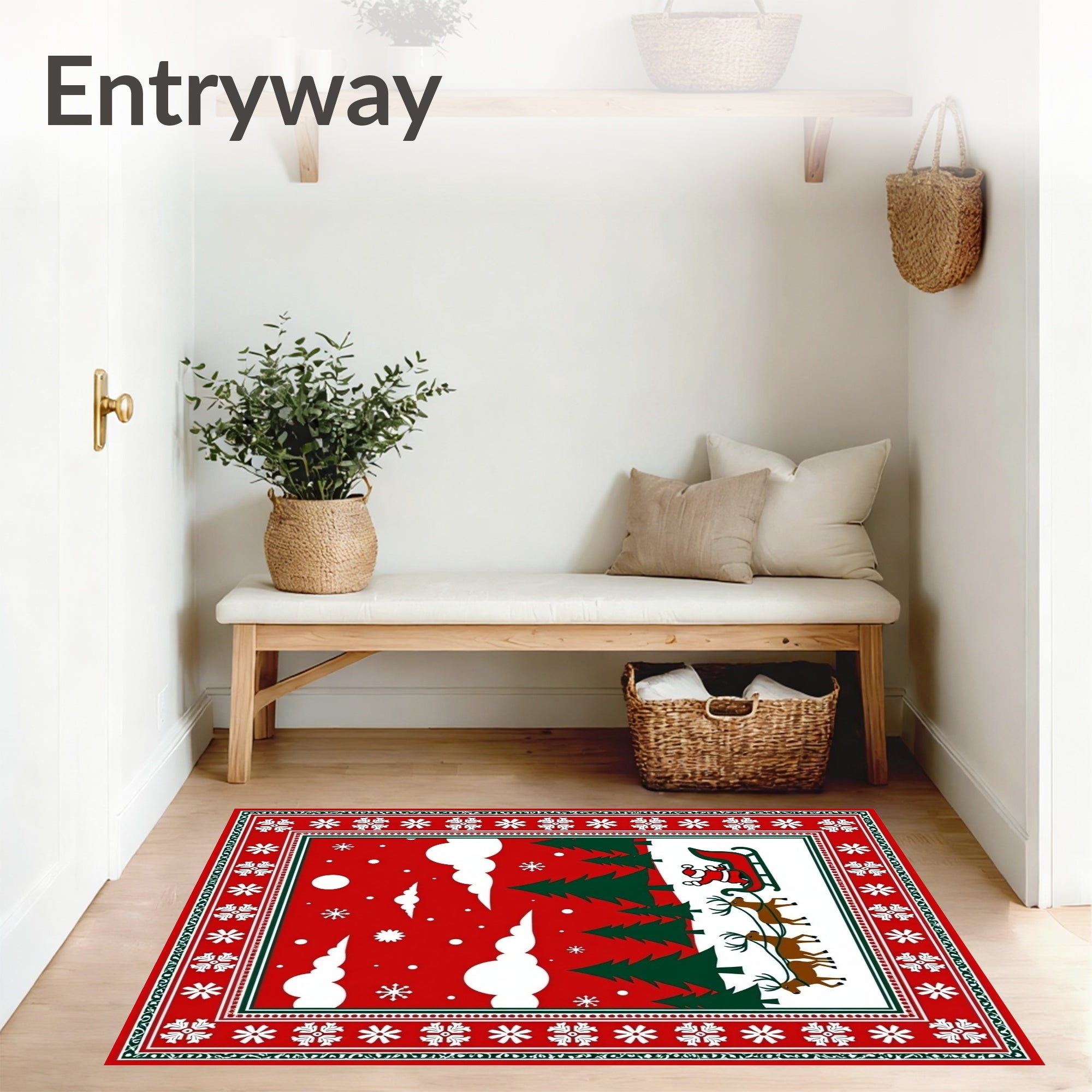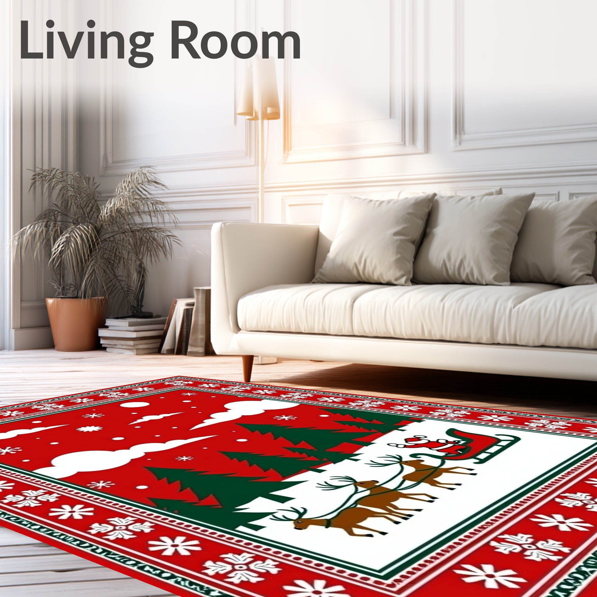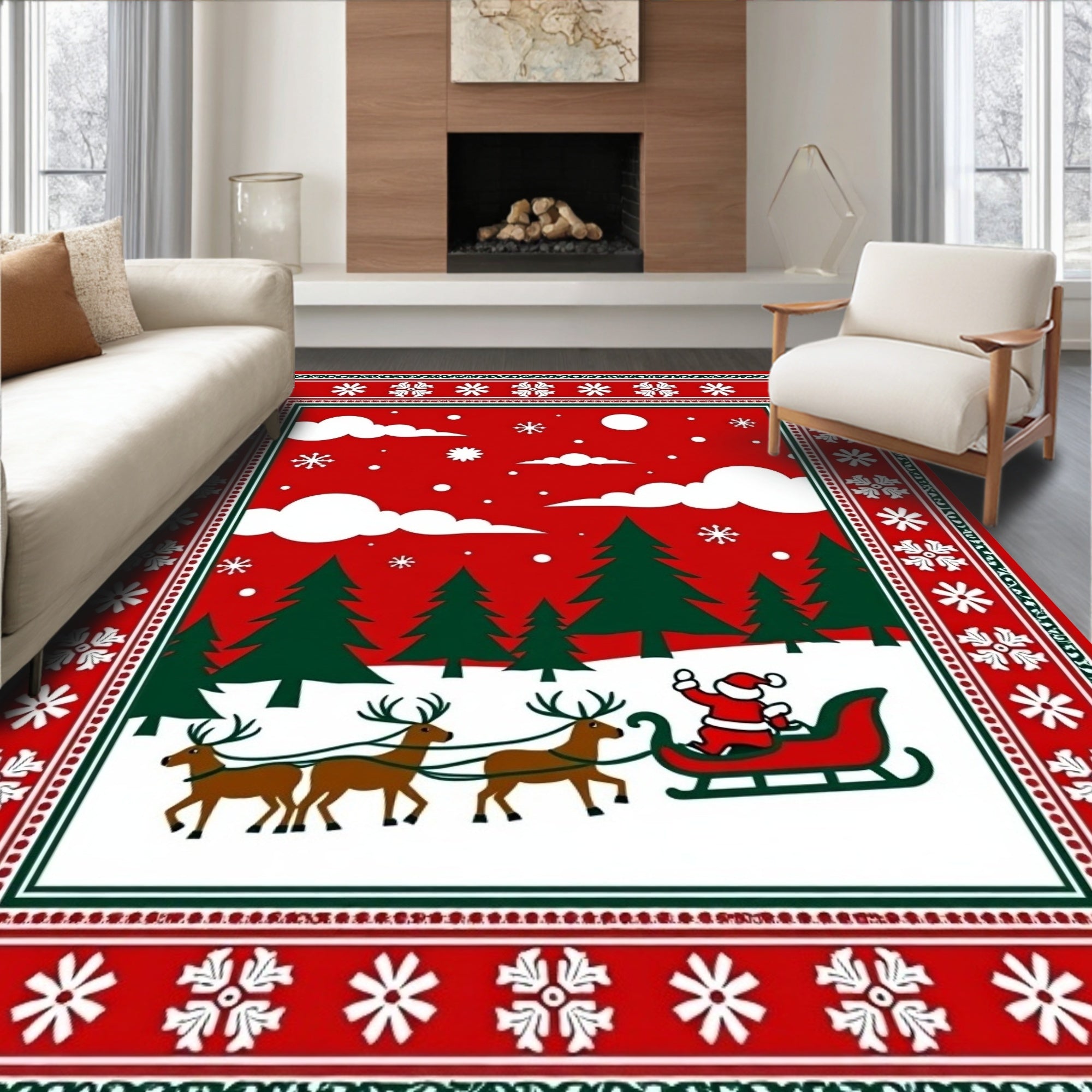 Ultra Soft Area Rug, Non Slip, Stain Resistant, Washable Area Rugs for Living Room, Bedroom, Nordic Winter Forest Scene with Santa Sleigh and Reindeer Motif(Red) Overview: