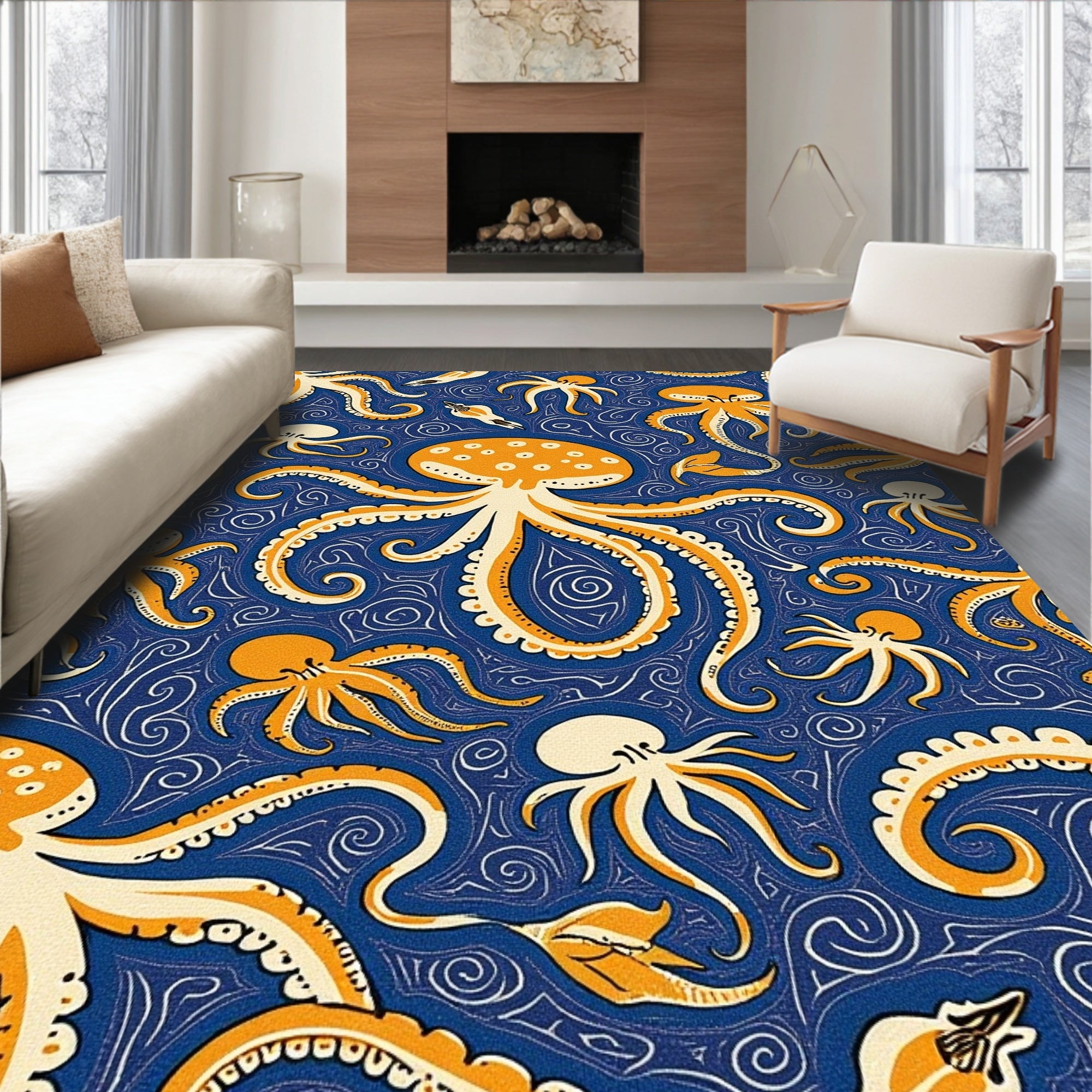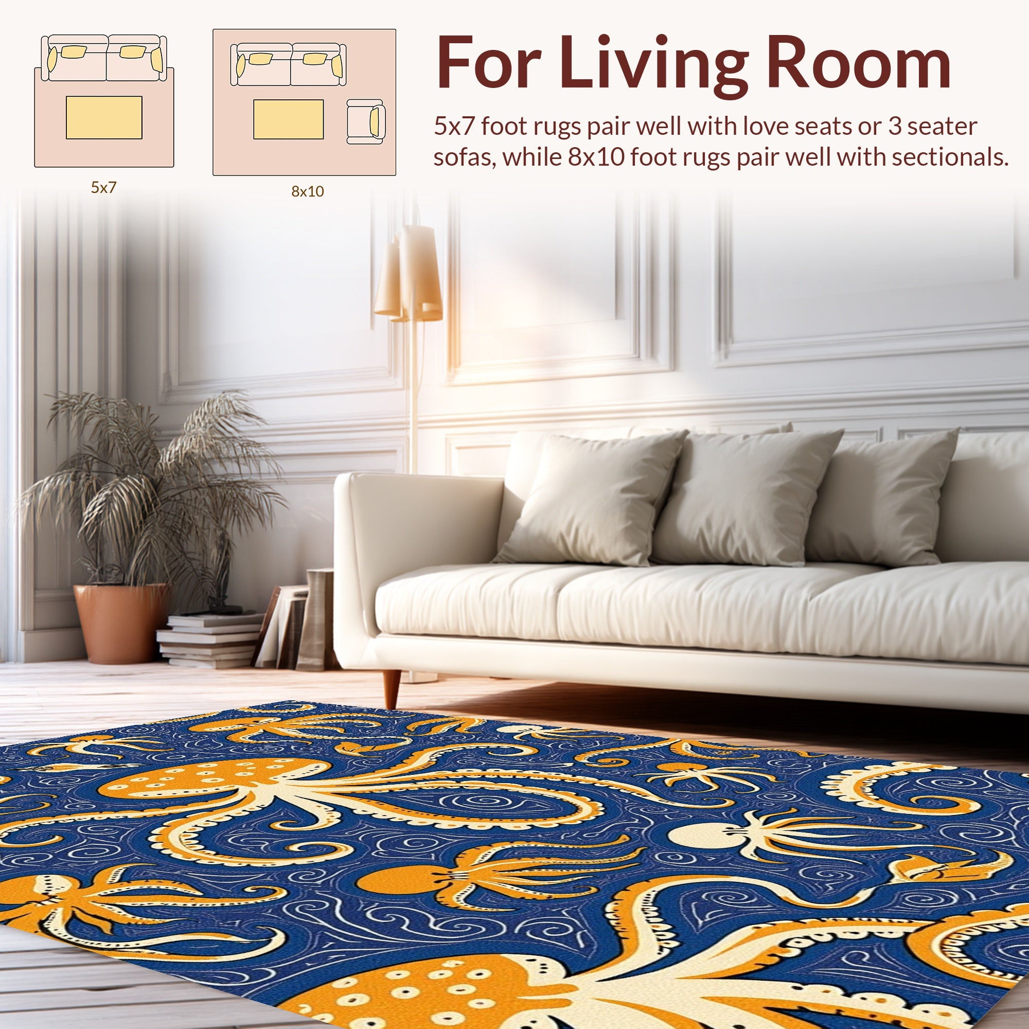 Flatwoven High Traffic Area Rug, Oceanic Creature Graphic, Non Slip, Stain Resistant, Washable Area Rugs for Living Room, Bedroom (Blue) Overview: