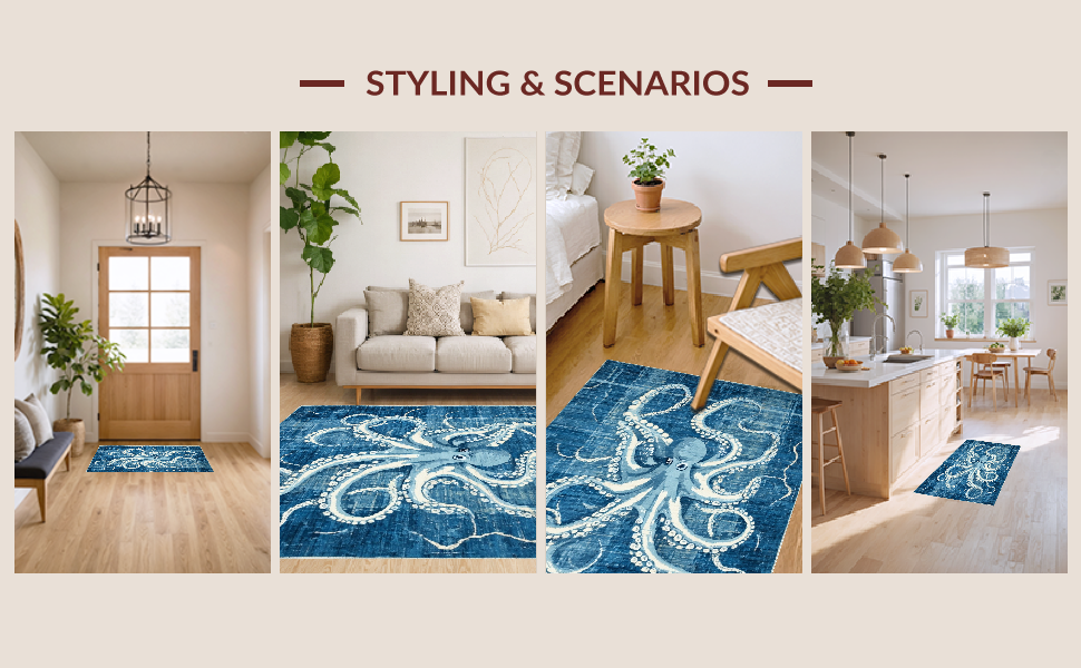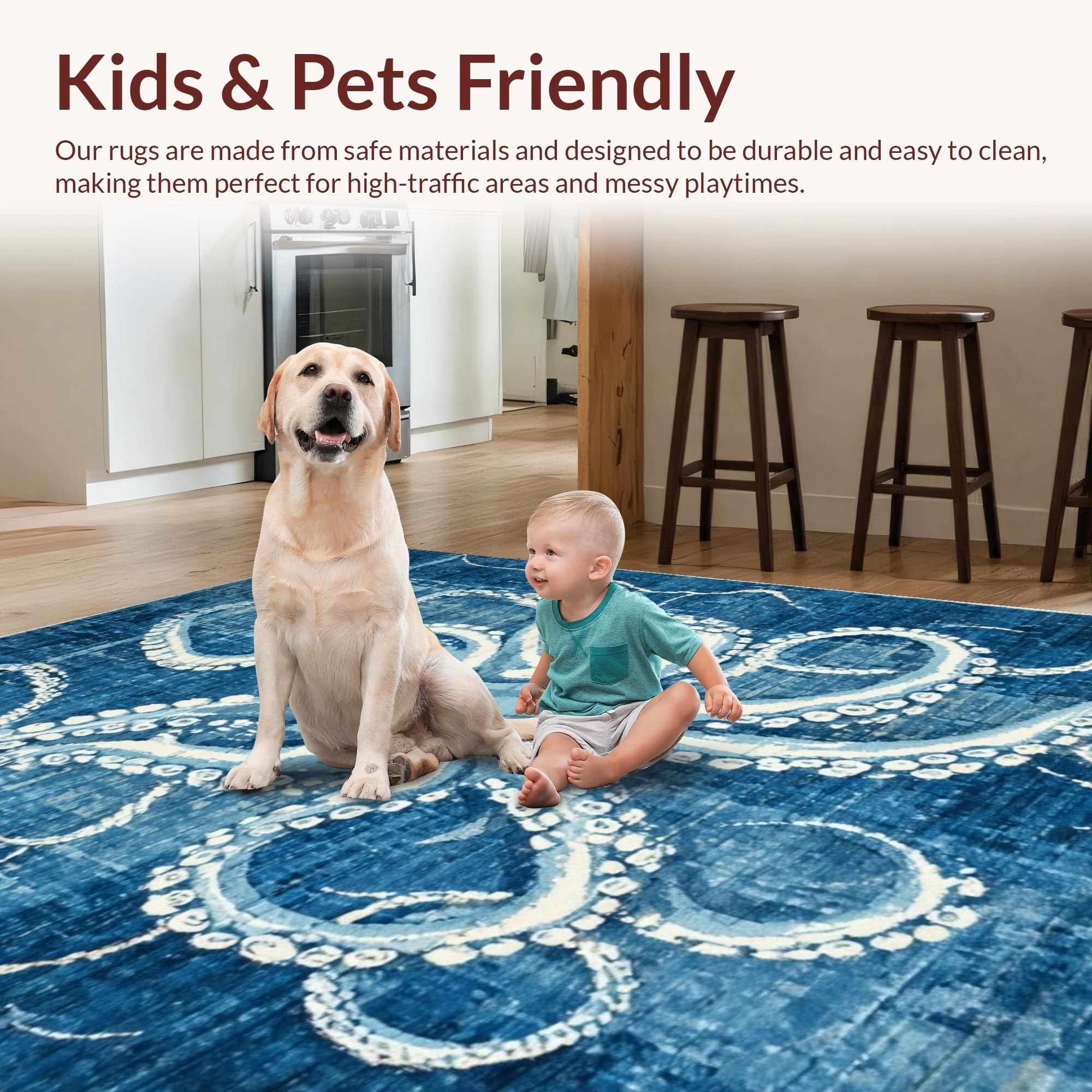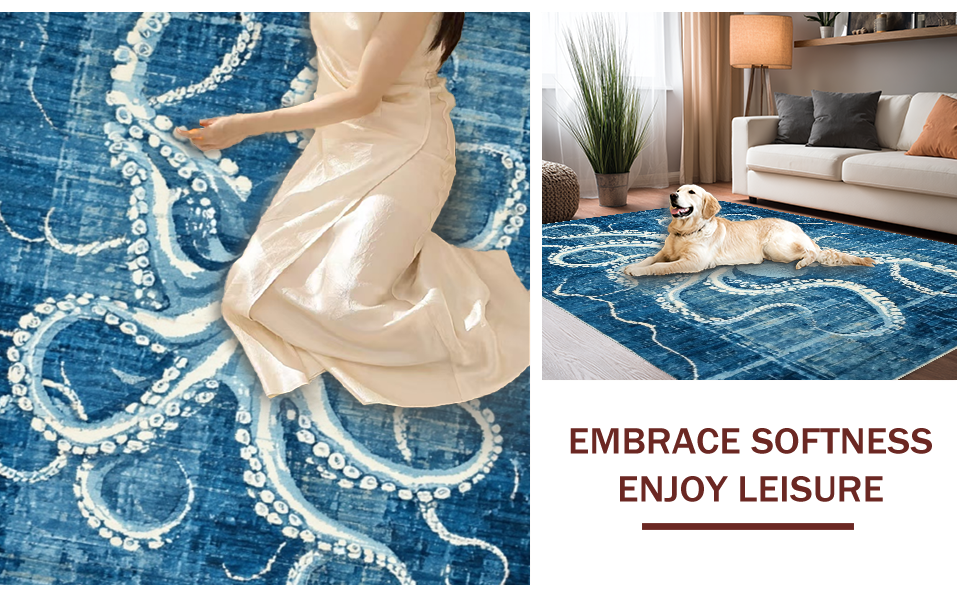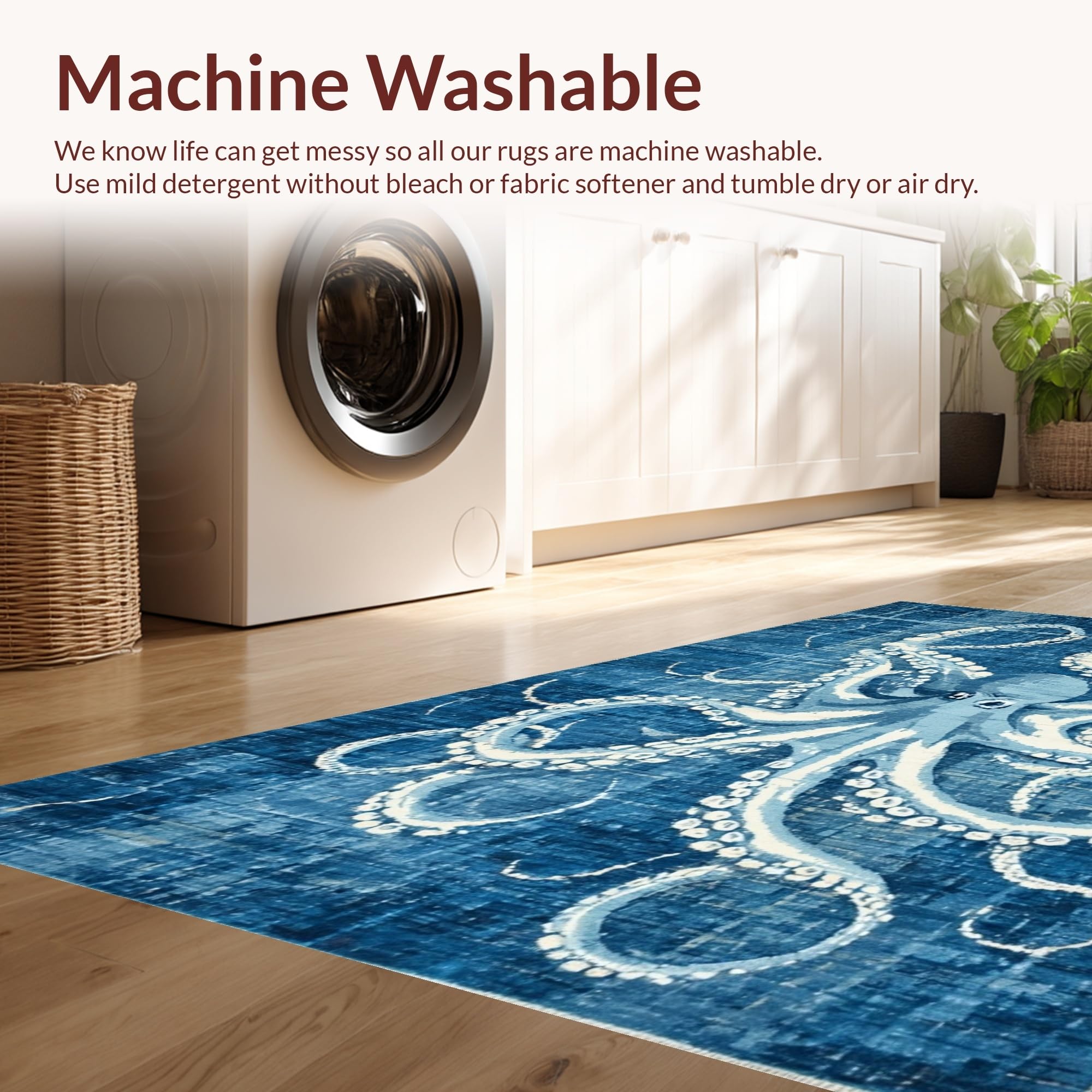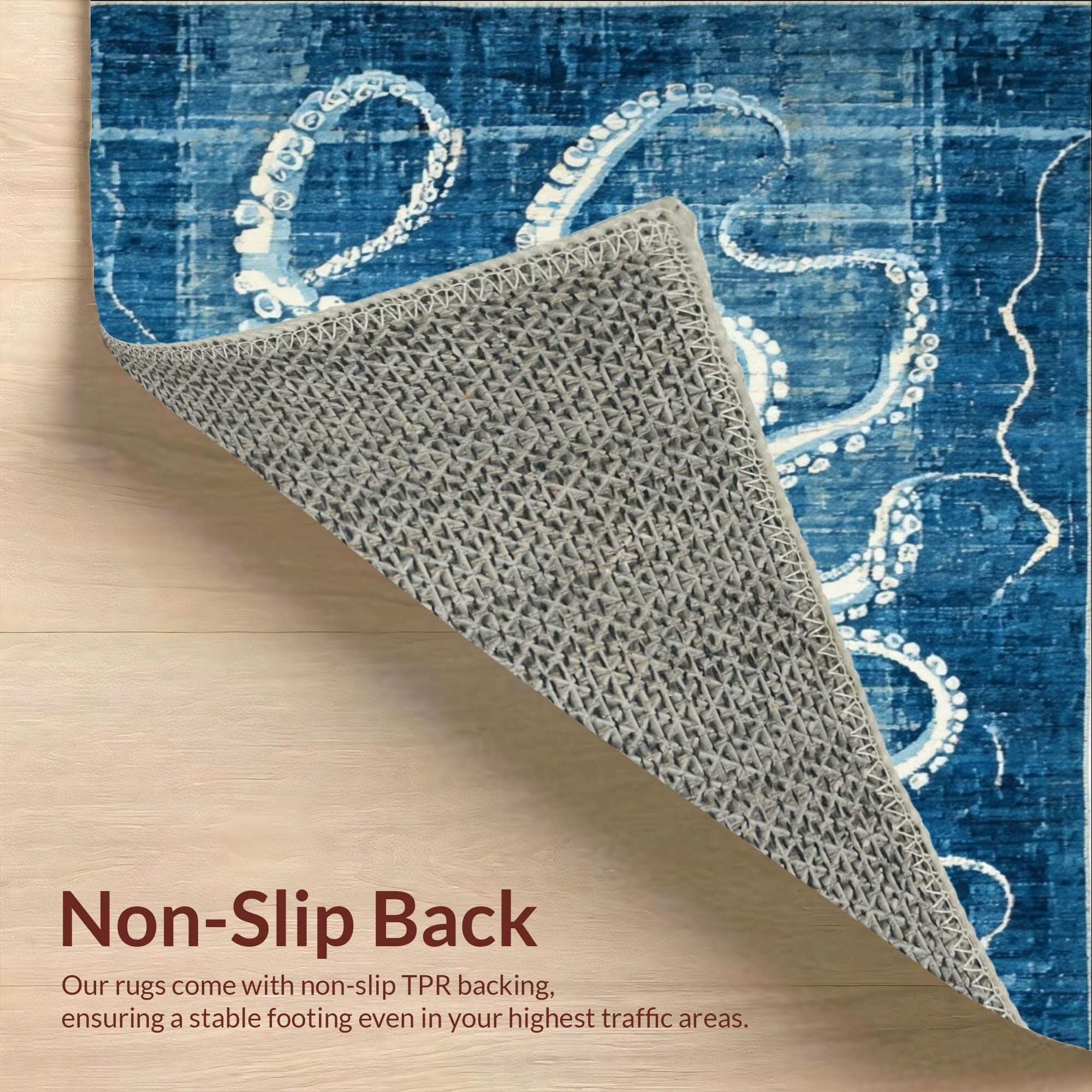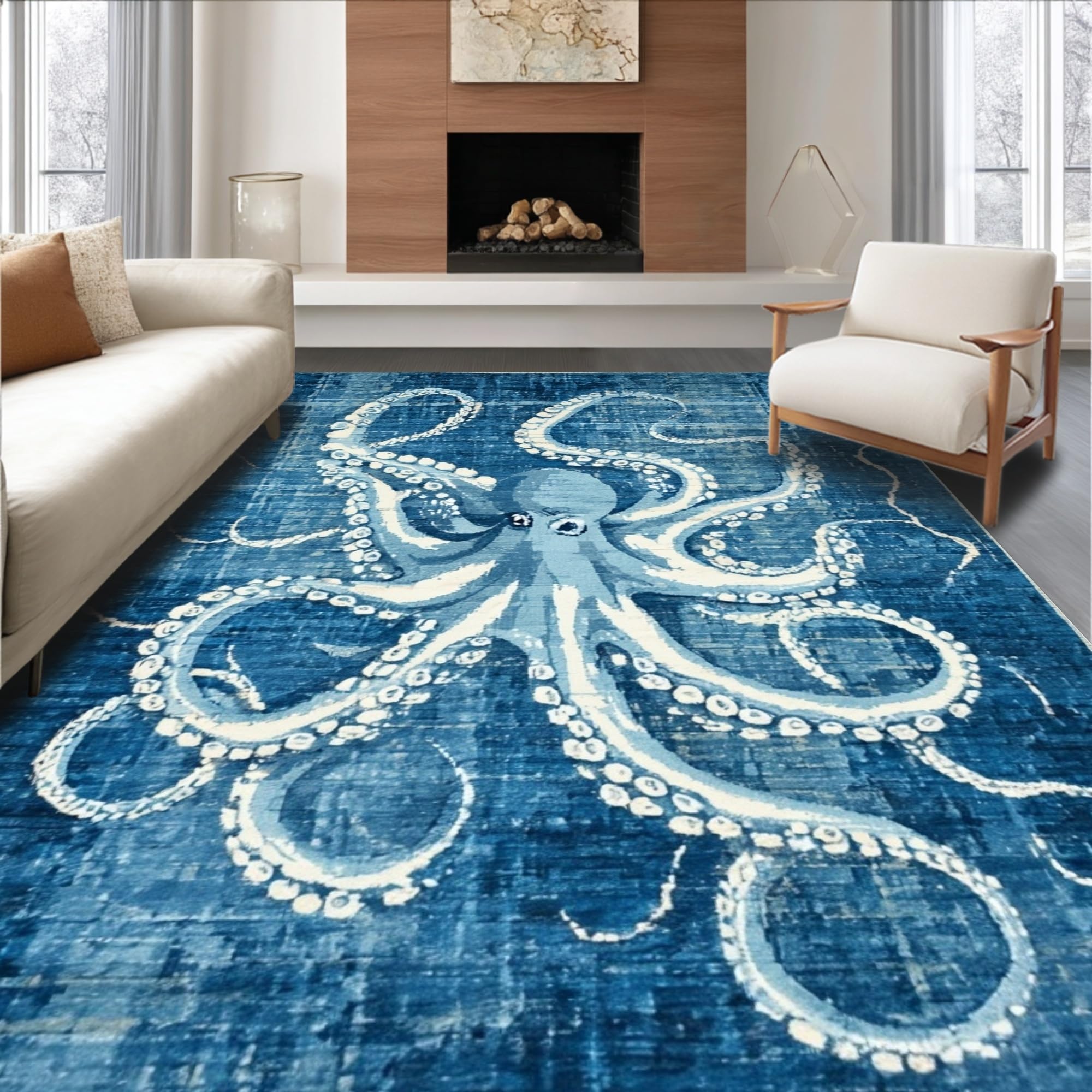 Ultra Soft Area Rug, Non Slip, Stain Resistant, Washable Area Rugs for Living Room, Bedroom, Octopus Rug - Blue and White Octopus Pattern(Blue) Overview: