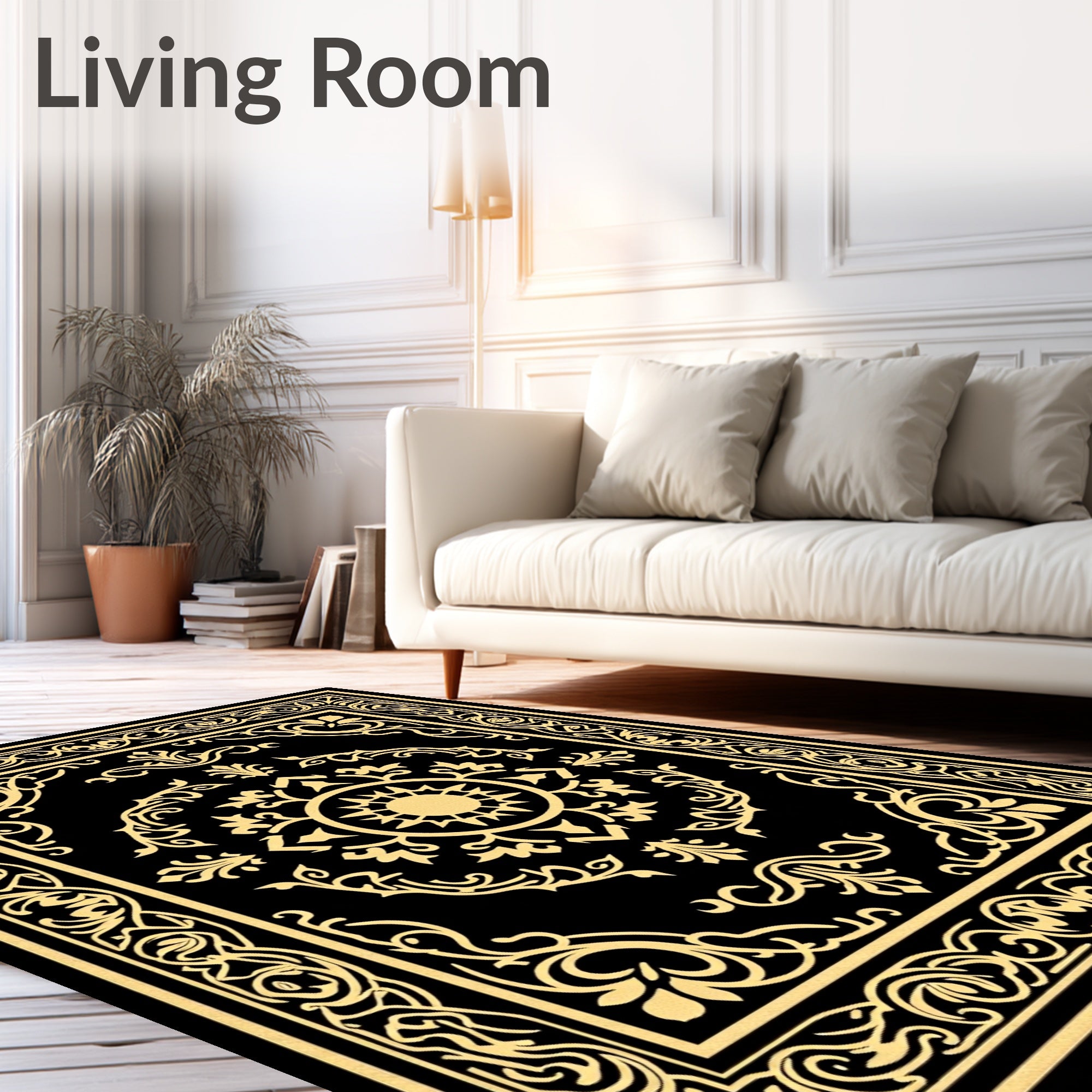 Flatwoven High Traffic Area Rug, Ornate Floral Medallion Tapestry, Non Slip, Stain Resistant, Washable Area Rugs for Living Room, Bedroom (Black) Overview: