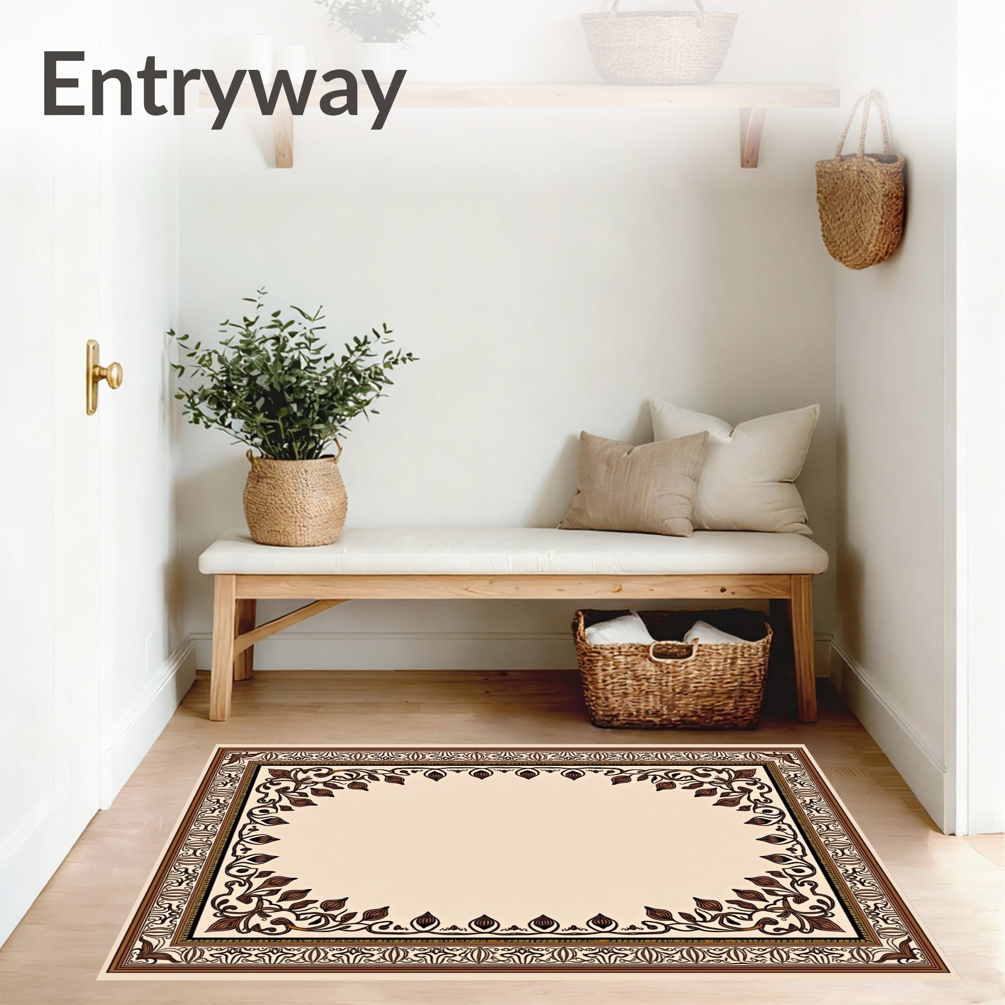 Ultra Soft Area Rug, Non Slip, Stain Resistant, Washable Area Rugs for Living Room, Bedroom, Paisley Cascade with Ornamental Border Framework(Brown) Overview: