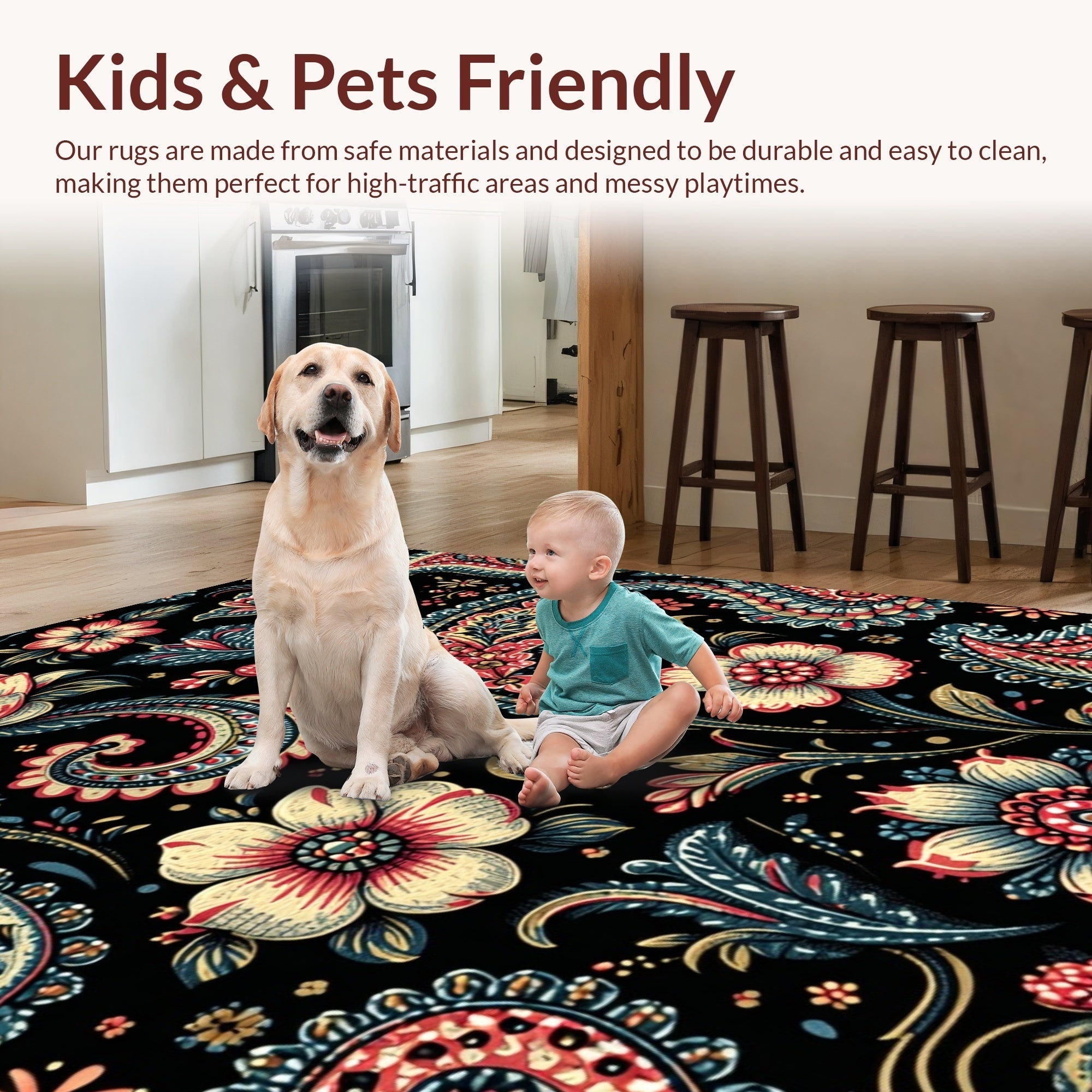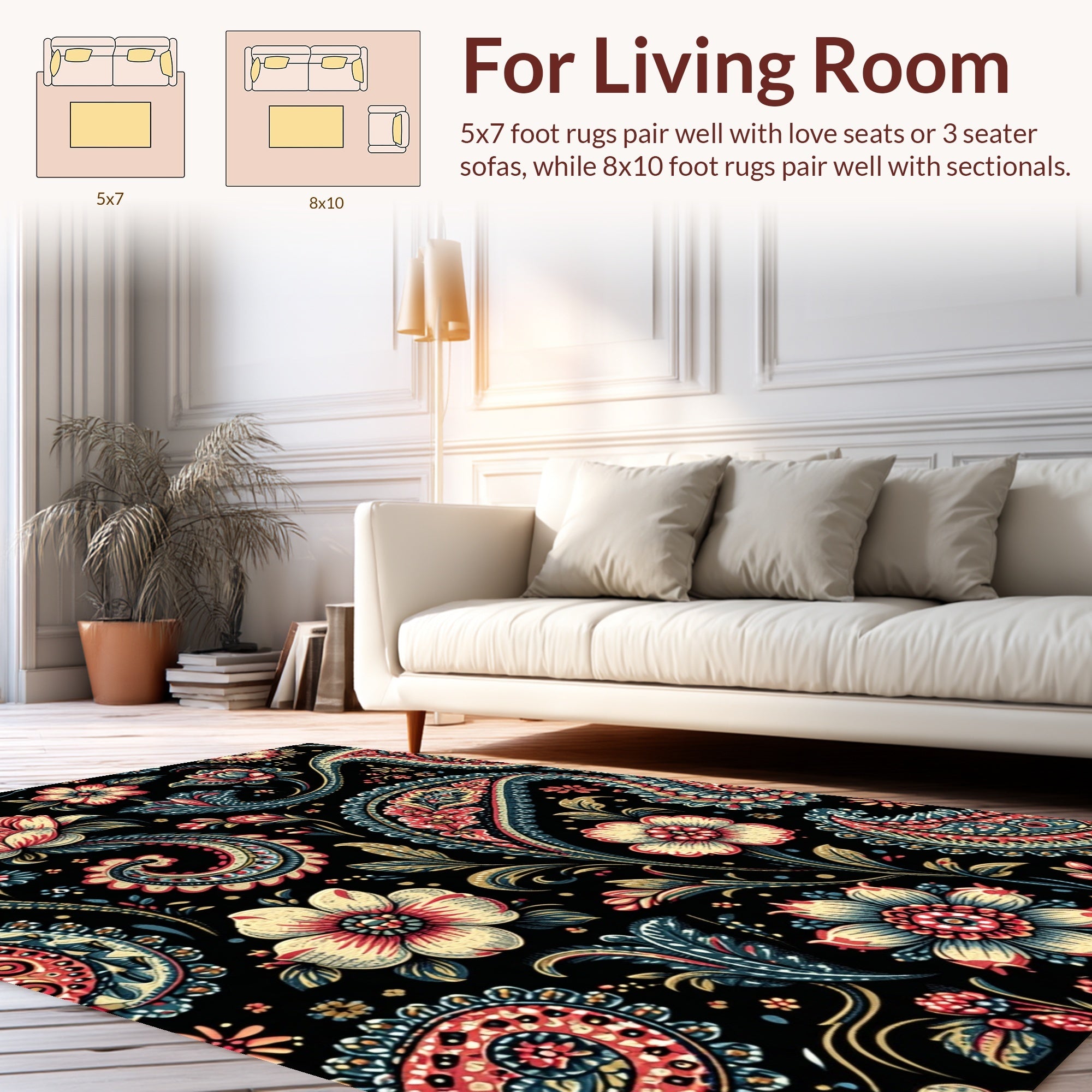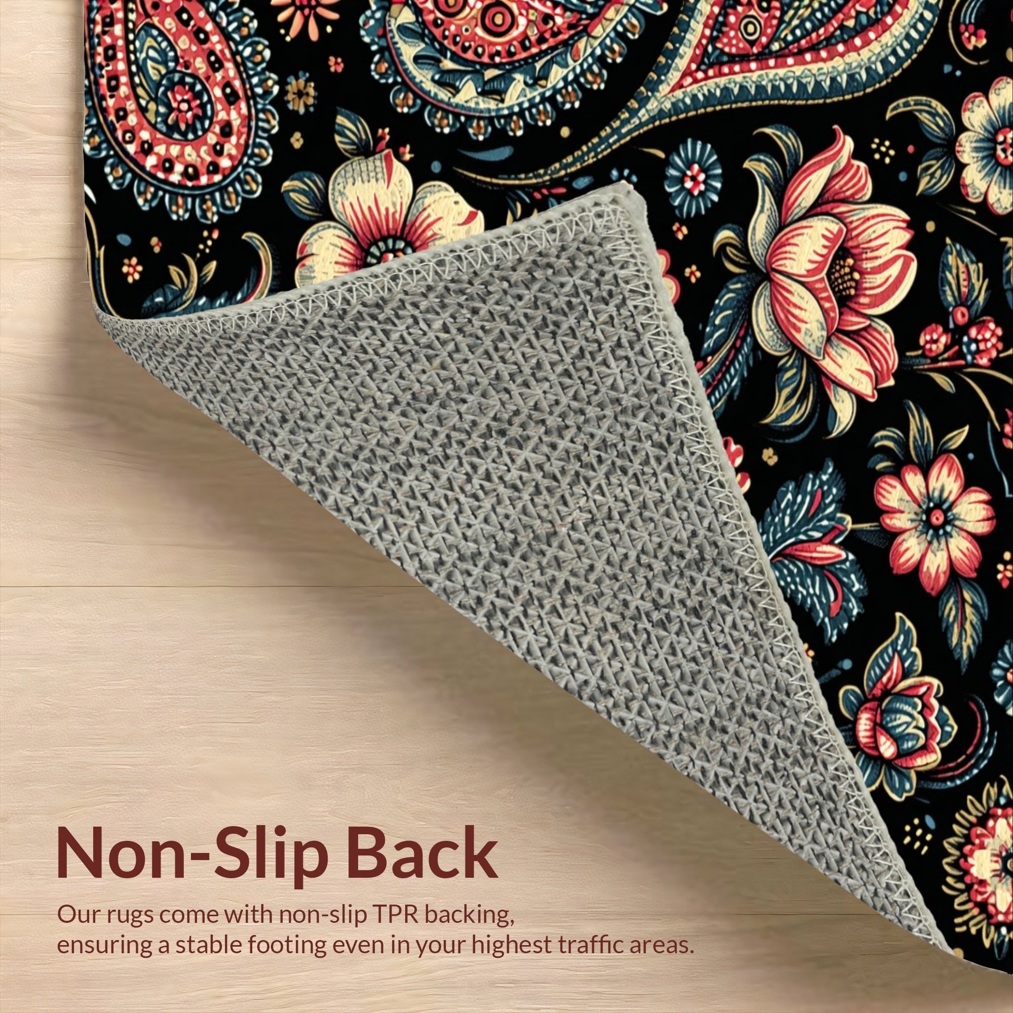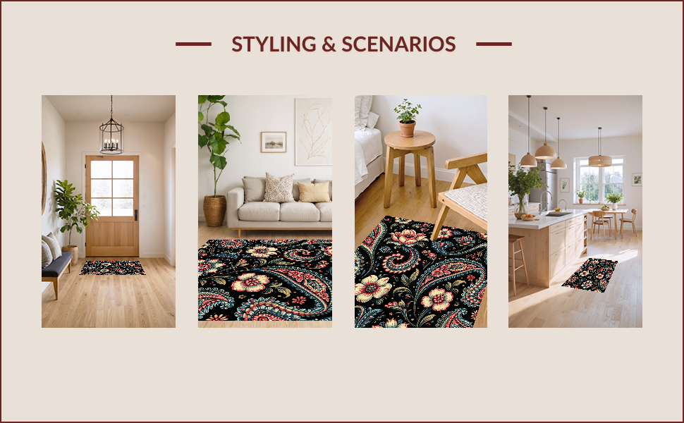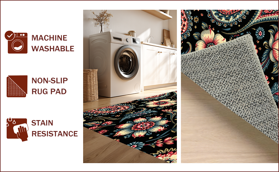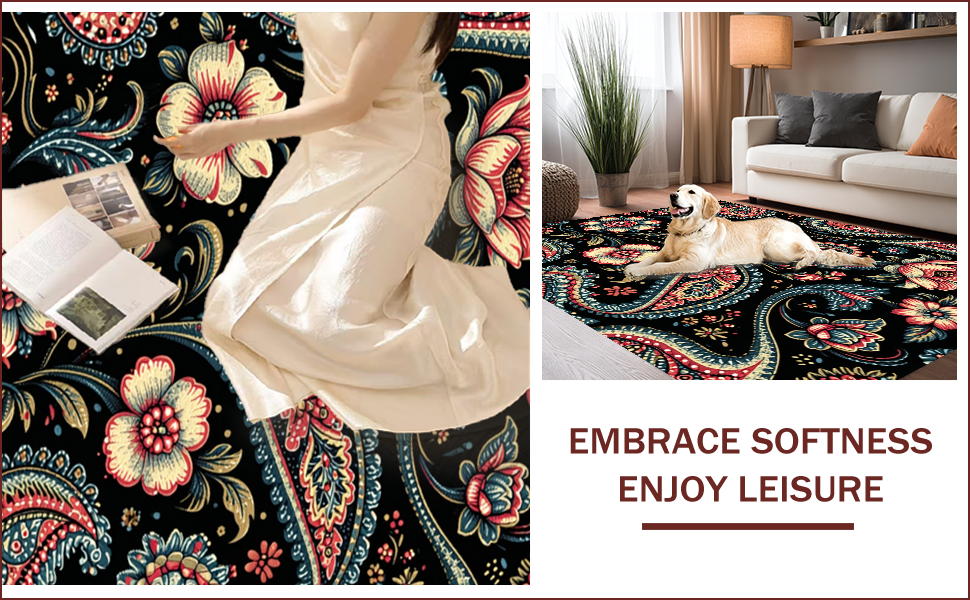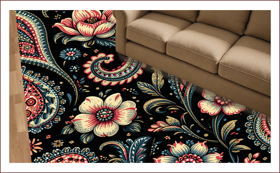 Ultra Soft Area Rug, Non Slip, Stain Resistant, Washable Area Rugs for Living Room, Bedroom, Paisley Floral Print(Black) Overview: