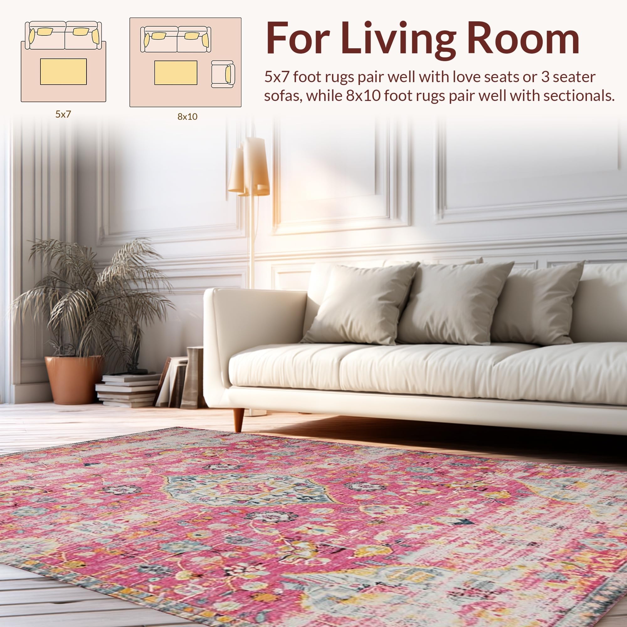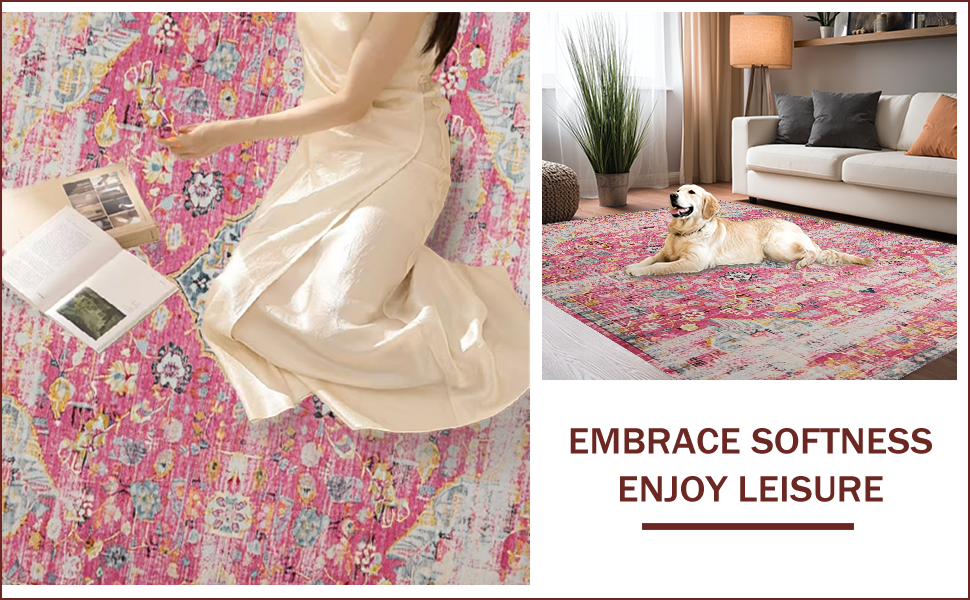 Ultra Soft Area Rug, Non Slip, Stain Resistant, Washable Area Rugs for Living Room, Bedroom, Pastel Elegant Distressed Motif(Pink) Overview: