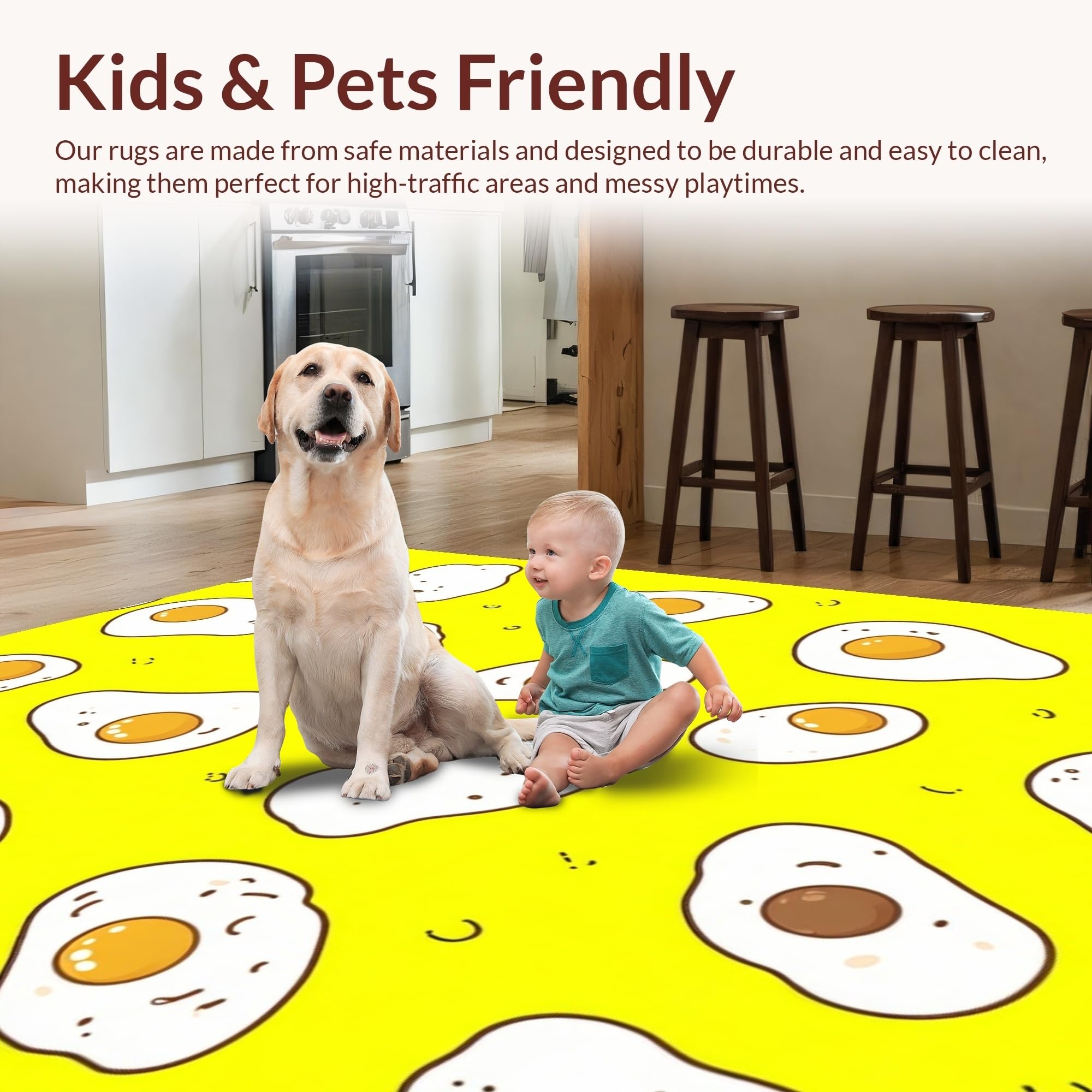 Ultra Soft Area Rug, Non Slip, Stain Resistant, Washable Area Rugs for Living Room, Bedroom, Playful Cartoon Egg Motif(Yellow) Overview: