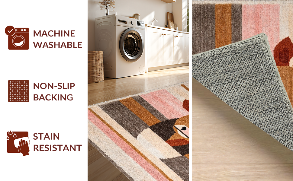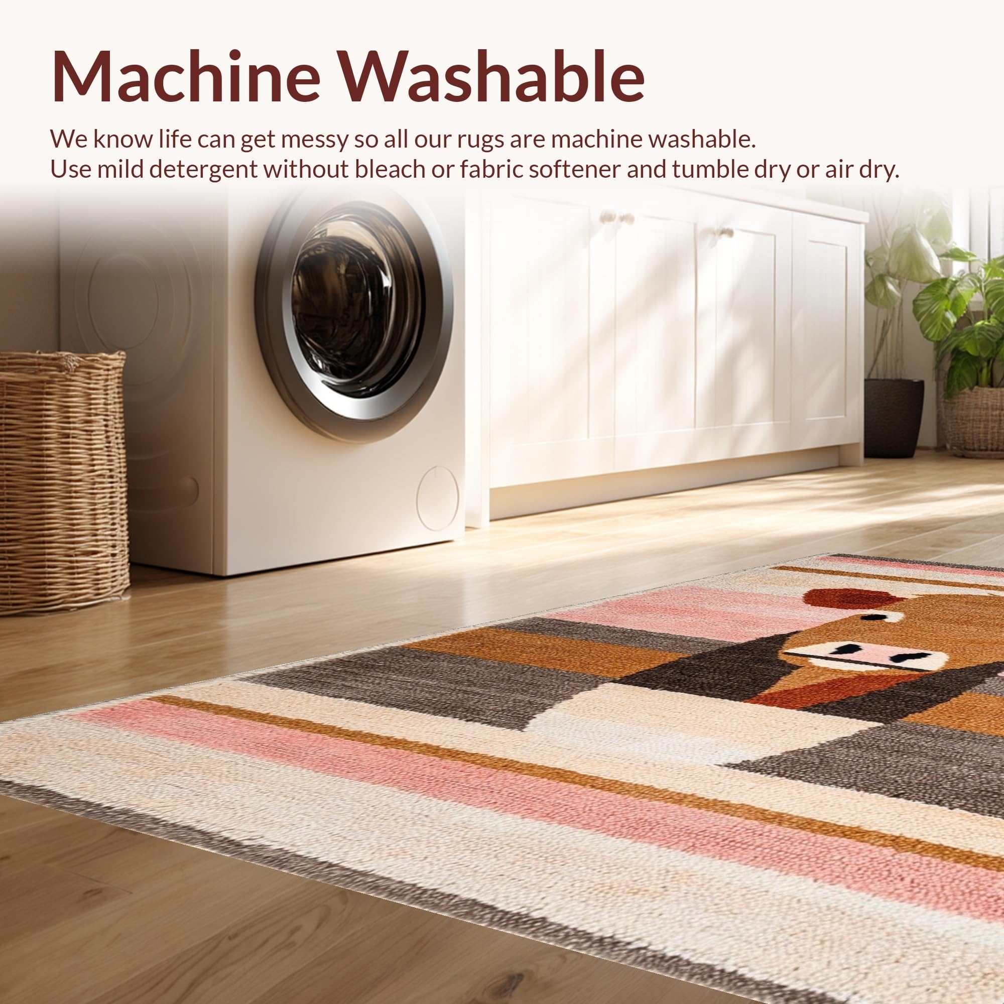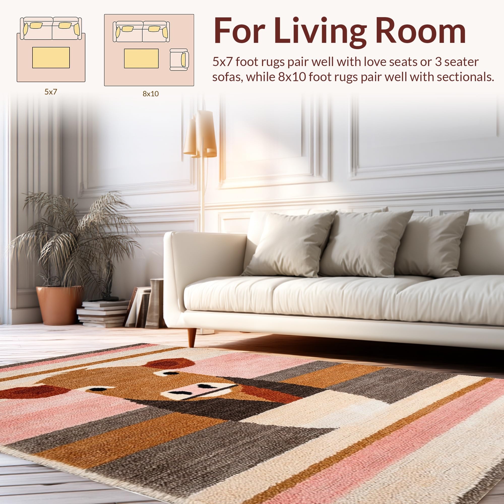 Ultra Soft Area Rug, Non Slip, Stain Resistant, Washable Area Rugs for Living Room, Bedroom, Playful Highland Cow Artistry(Pink) Overview: