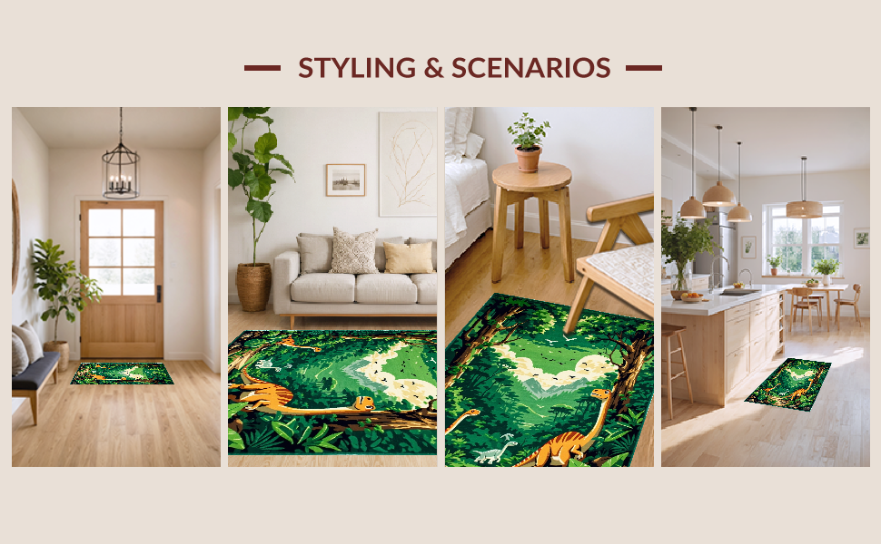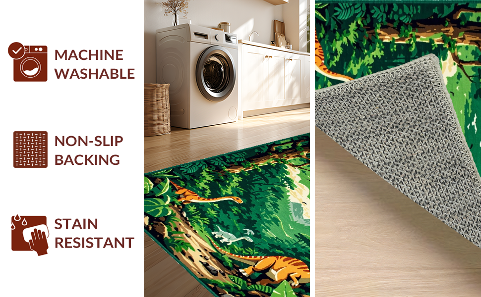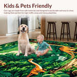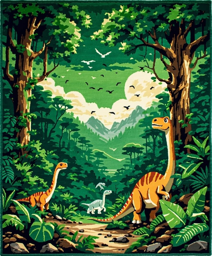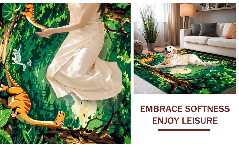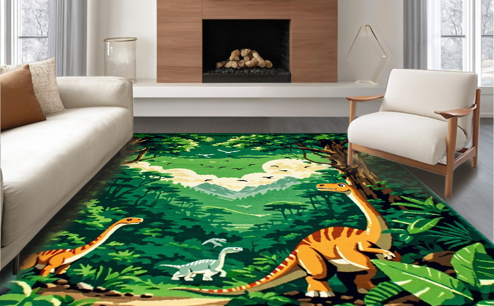 Ultra Soft Area Rug, Non Slip, Stain Resistant, Washable Area Rugs for Living Room, Bedroom, Playful Jurassic Scene Motif(Green) Overview: