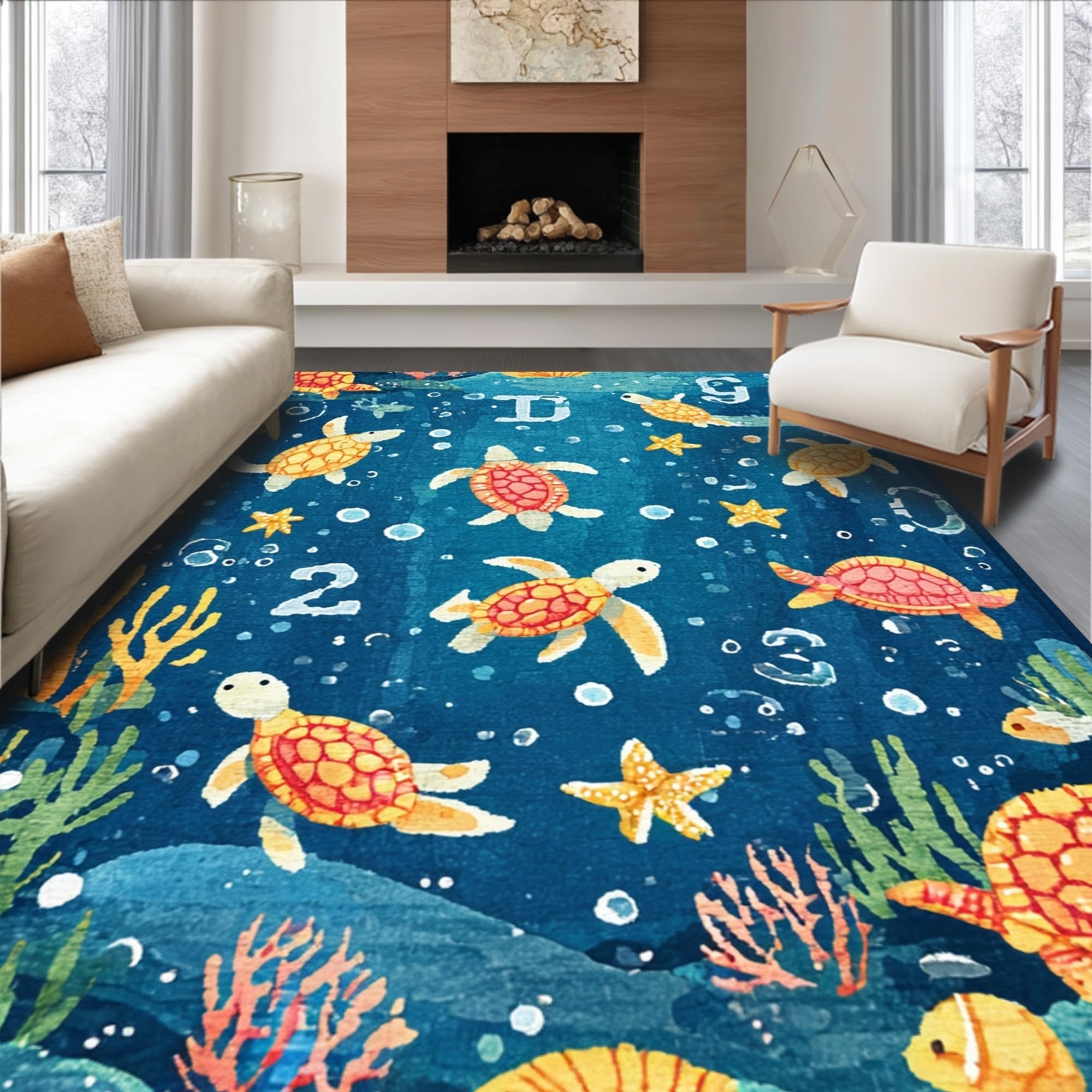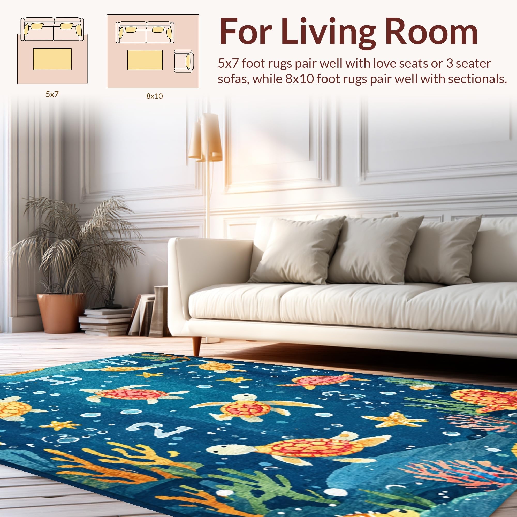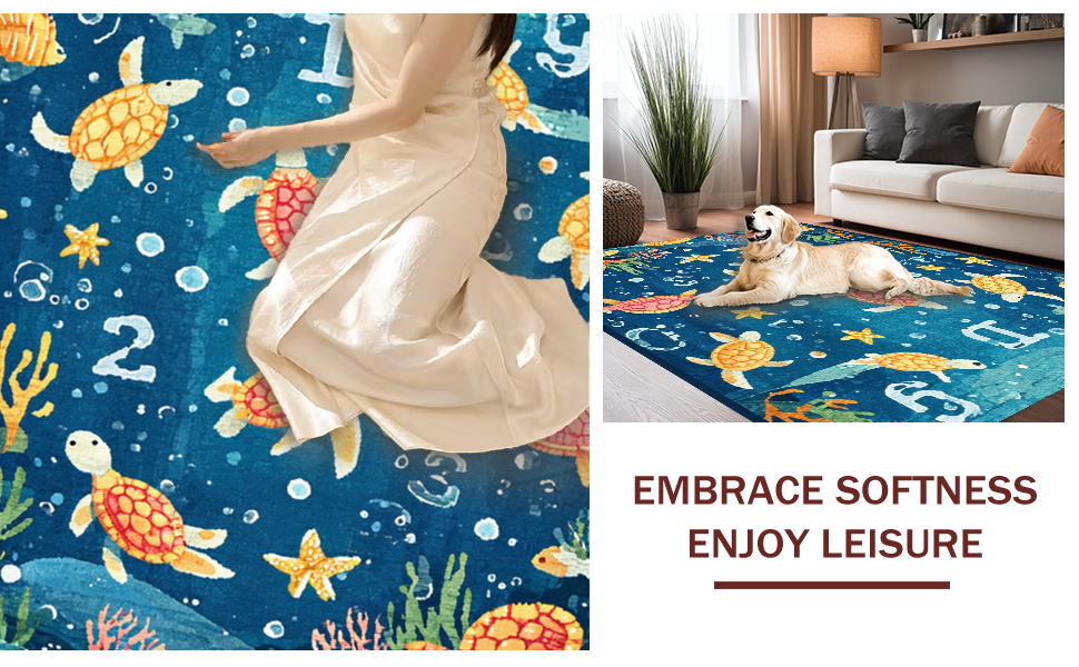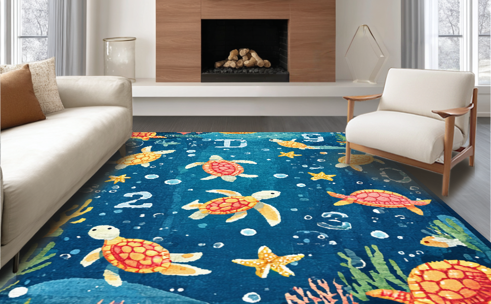 Ultra Soft Area Rug, Non Slip, Stain Resistant, Washable Area Rugs for Living Room, Bedroom, Playful Sea Animal Carpet with Alphabet and Number Learning Elements(Blue) Overview: