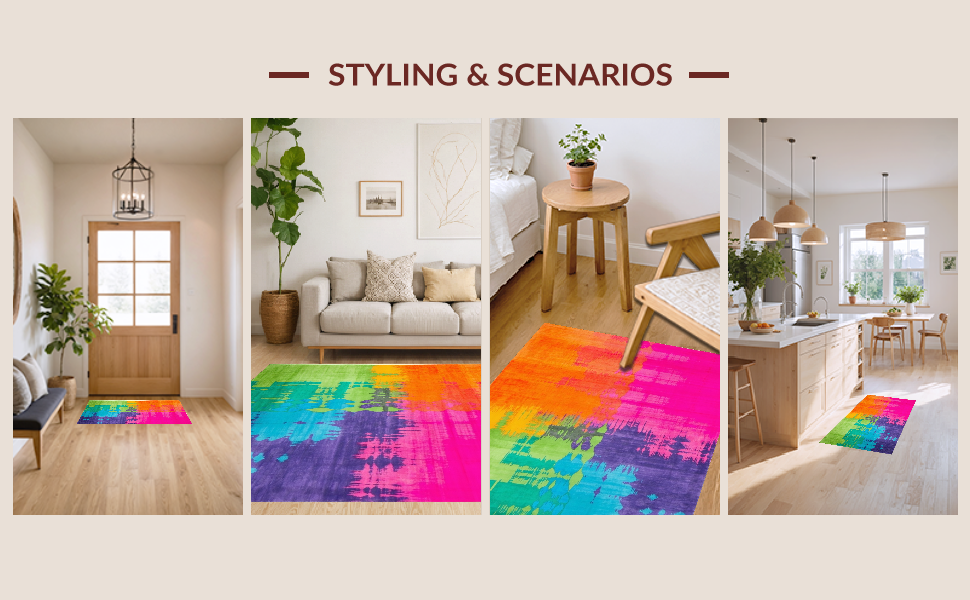 Ultra Soft Area Rug, Non Slip, Stain Resistant, Washable Area Rugs for Living Room, Bedroom, Playful Shaggy Rainbow Color Splash(Pink) Overview: