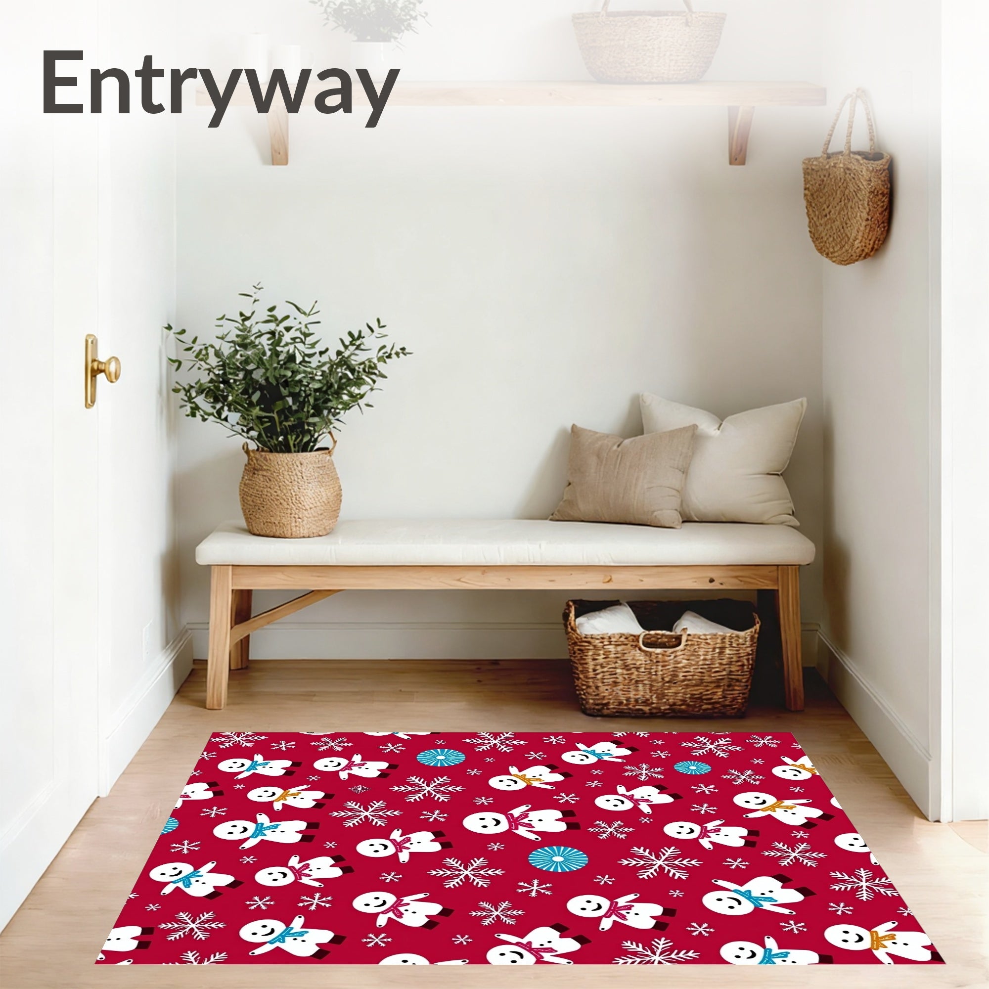 Ultra Soft Area Rug, Non Slip, Stain Resistant, Washable Area Rugs for Living Room, Bedroom, Playful Snowman Figures Surrounded by Sparkling Snowflake Clusters(Red) Overview: