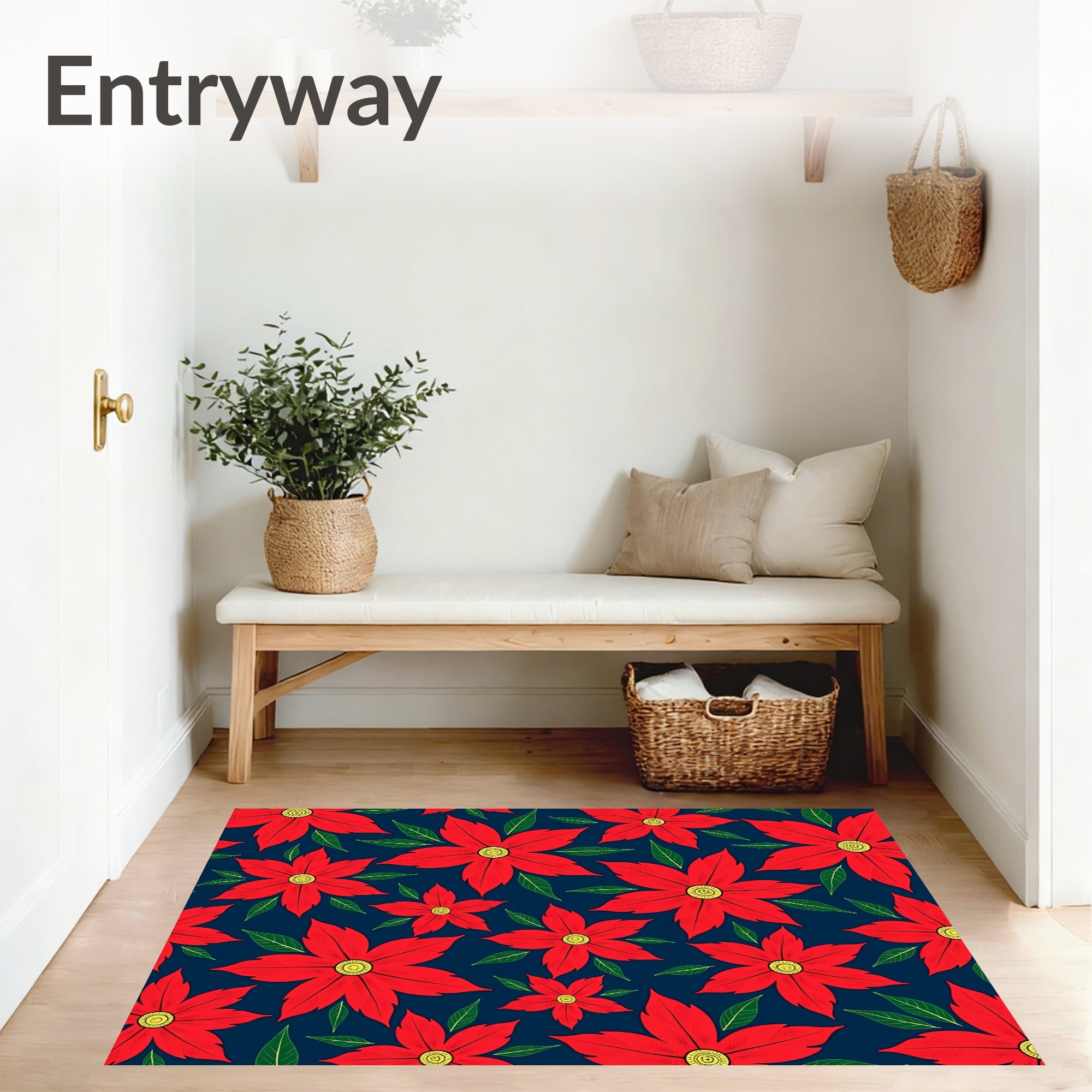 Ultra Soft Area Rug, Non Slip, Stain Resistant, Washable Area Rugs for Living Room, Bedroom, Poinsettia Bloom Botanical Print with Seasonal Flower Arrangements(Red) Overview: