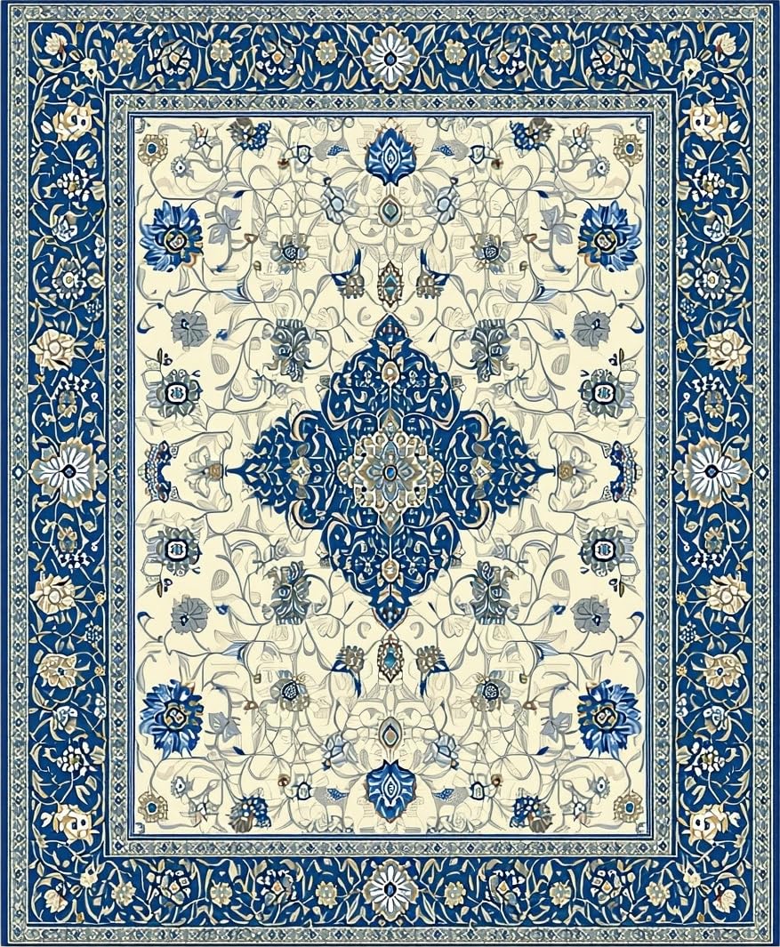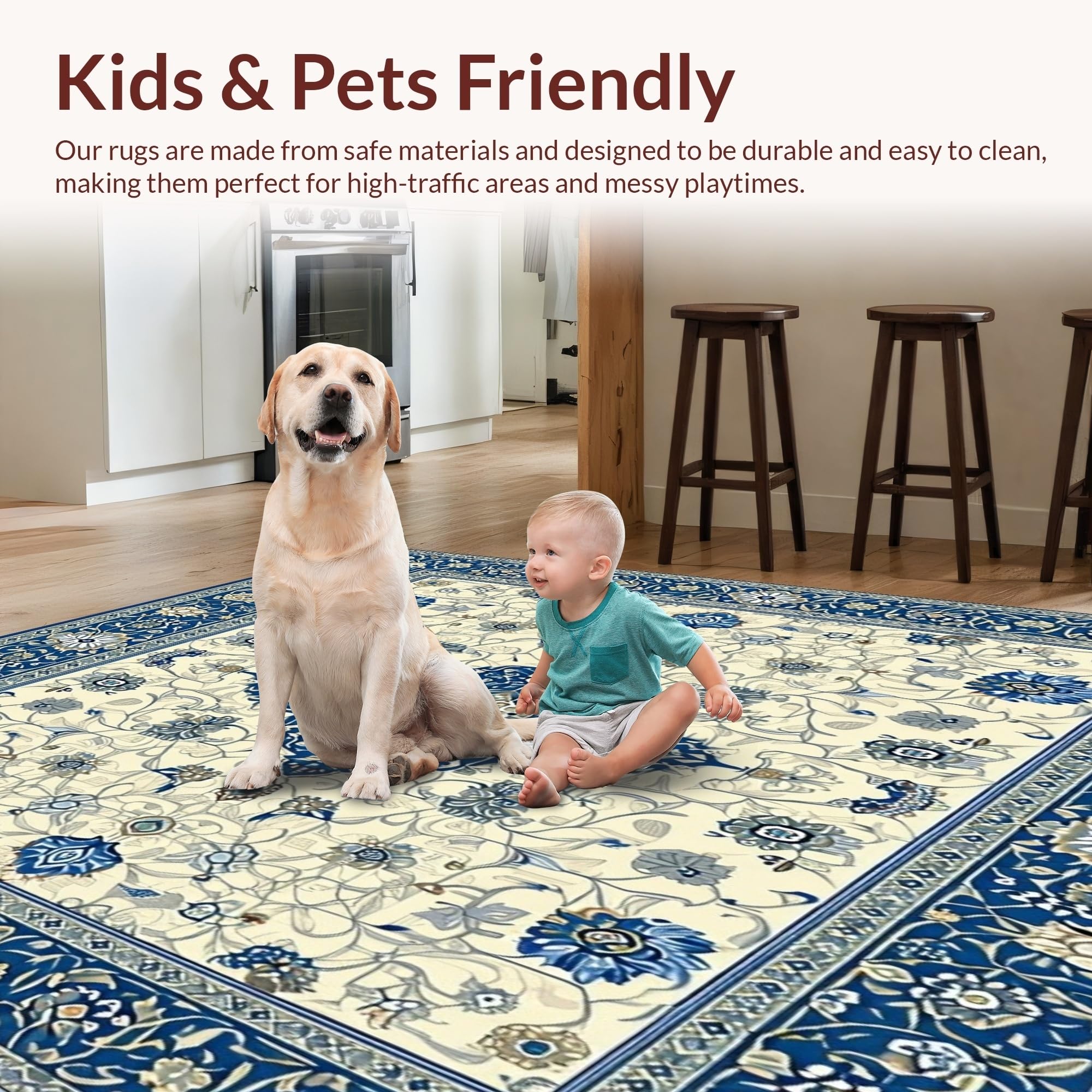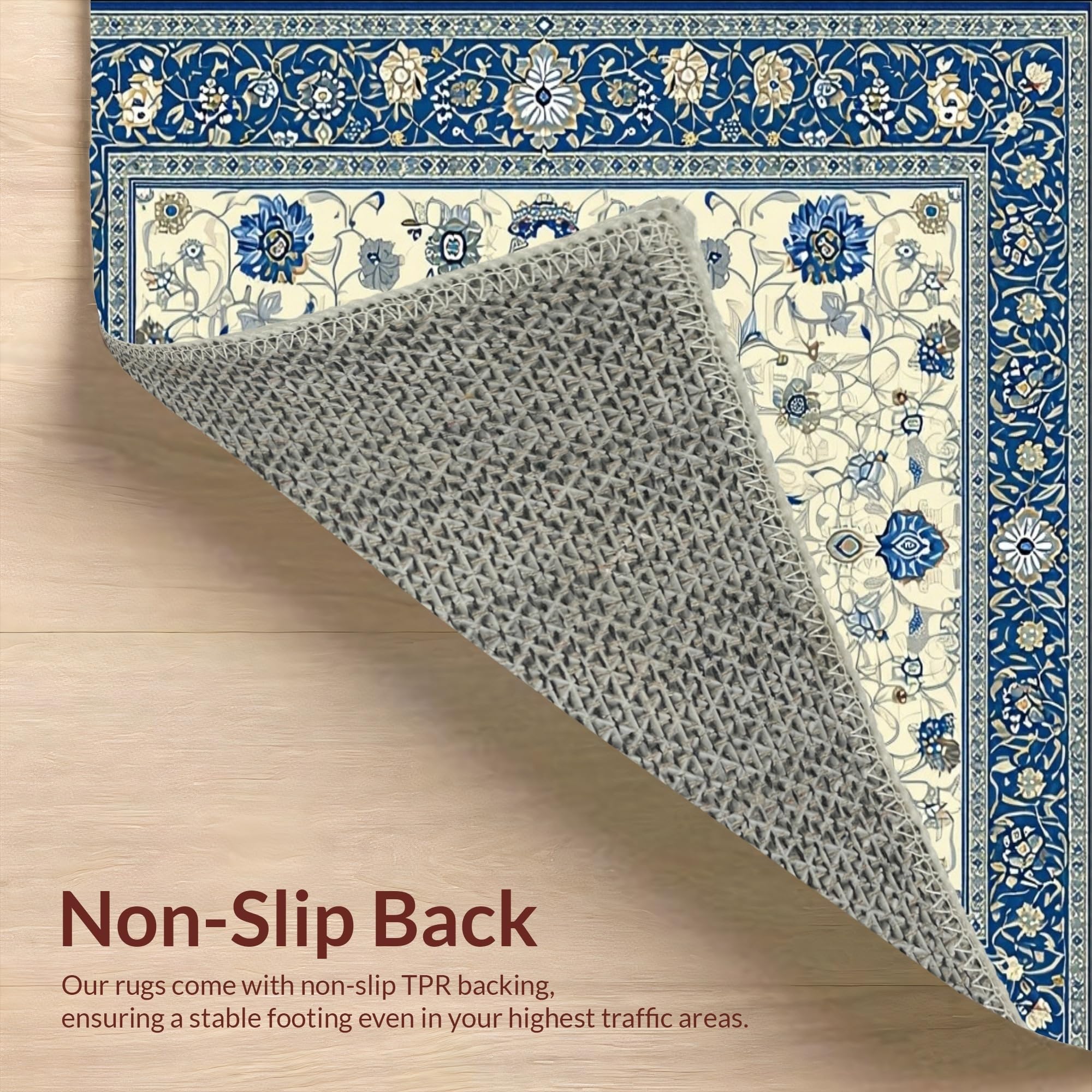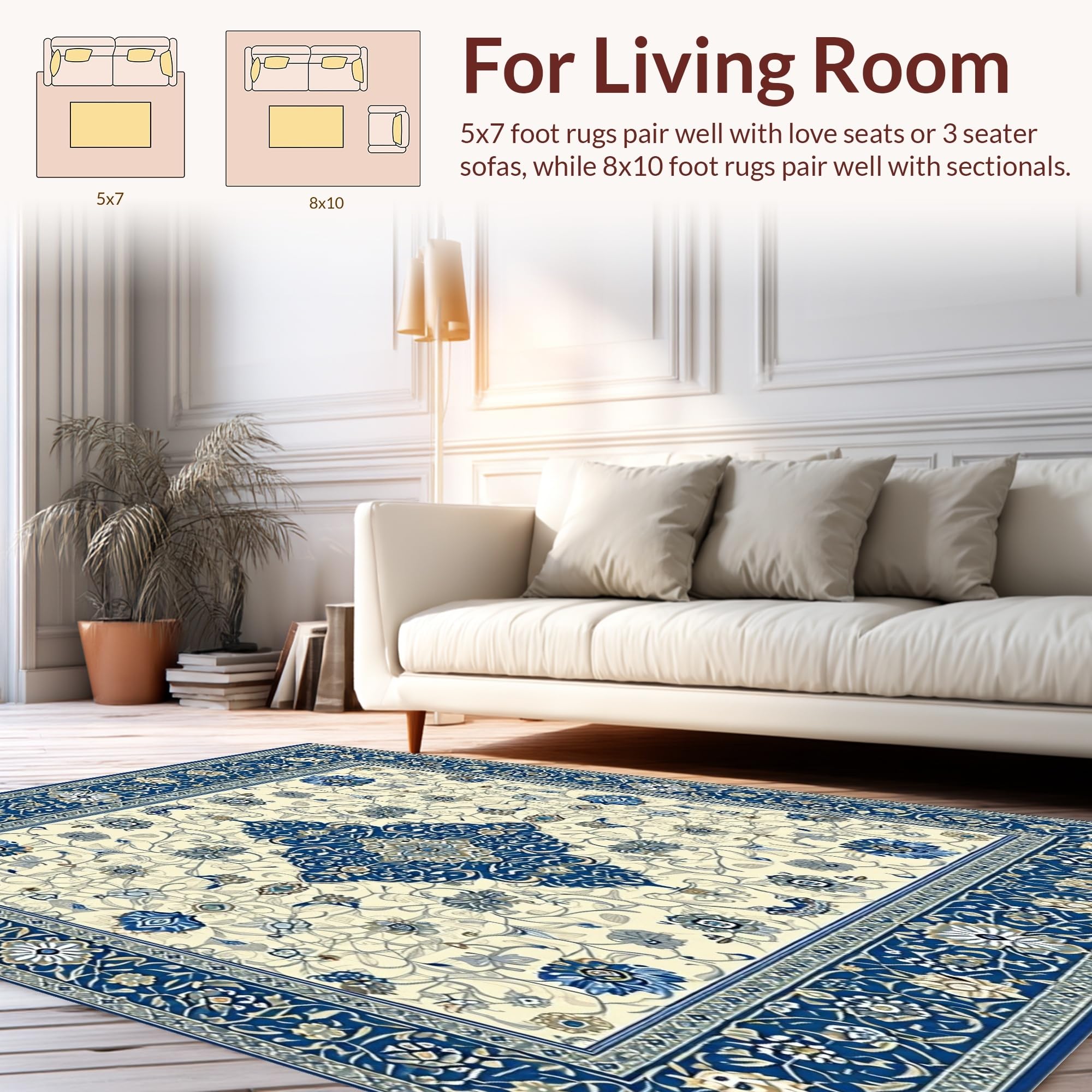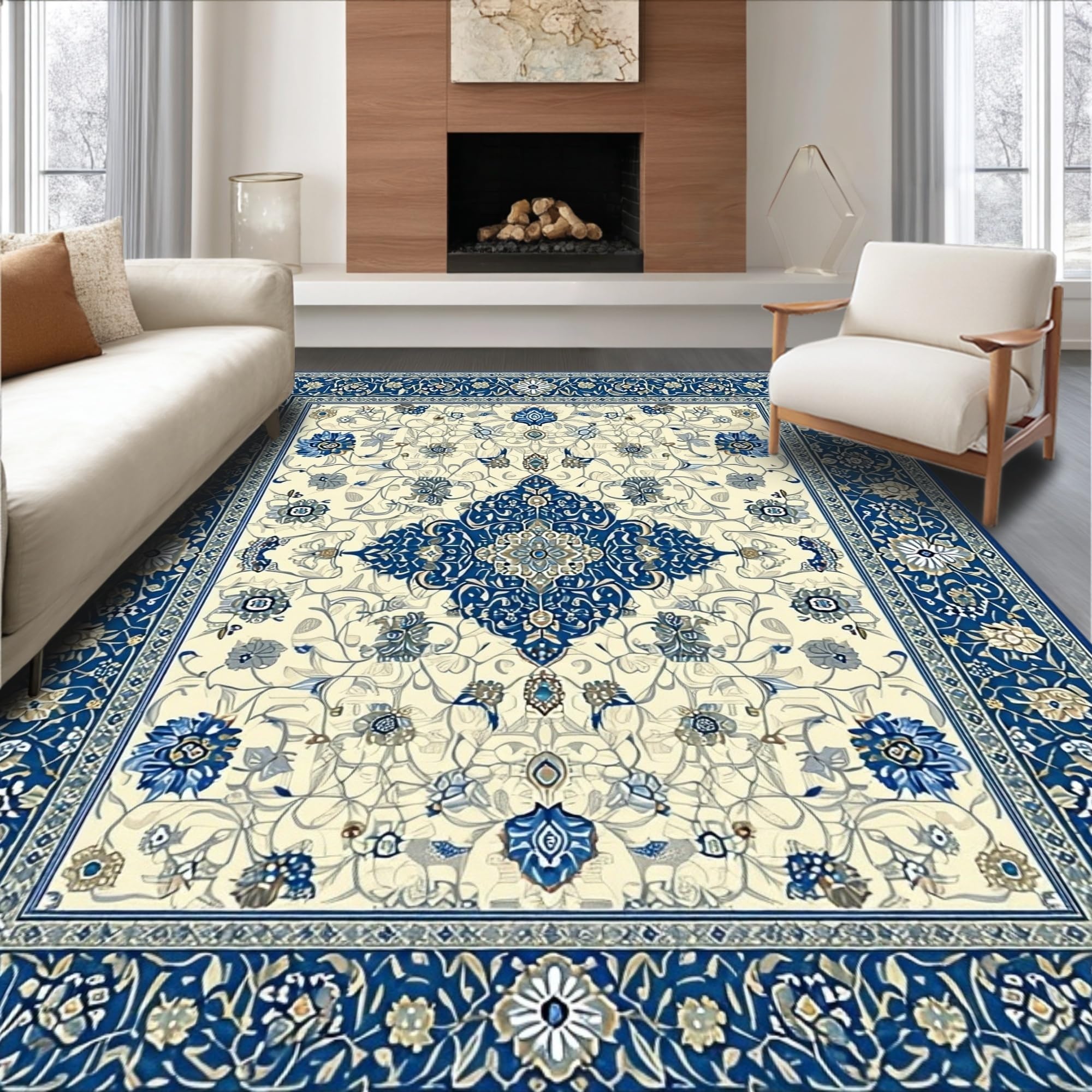 Ultra Soft Area Rug, Non Slip, Stain Resistant, Washable Area Rugs for Living Room, Bedroom, Regal Azure Bloom Dark Blue Beige Floral Medallion(Beige) Overview: