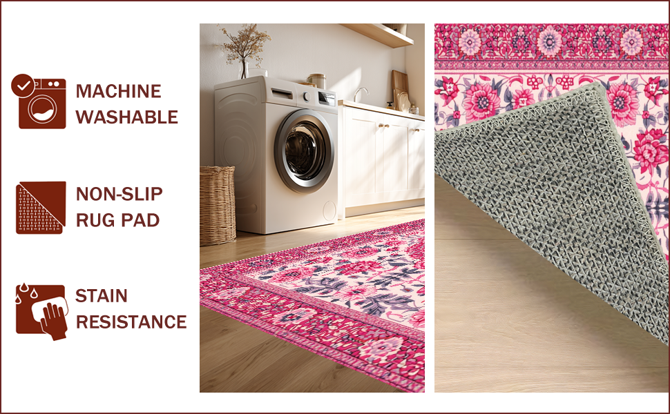 Ultra Soft Area Rug, Non Slip, Stain Resistant, Washable Area Rugs for Living Room, Bedroom, Retro Floral Nursery Carpet for Girls Room(Pink) Overview: