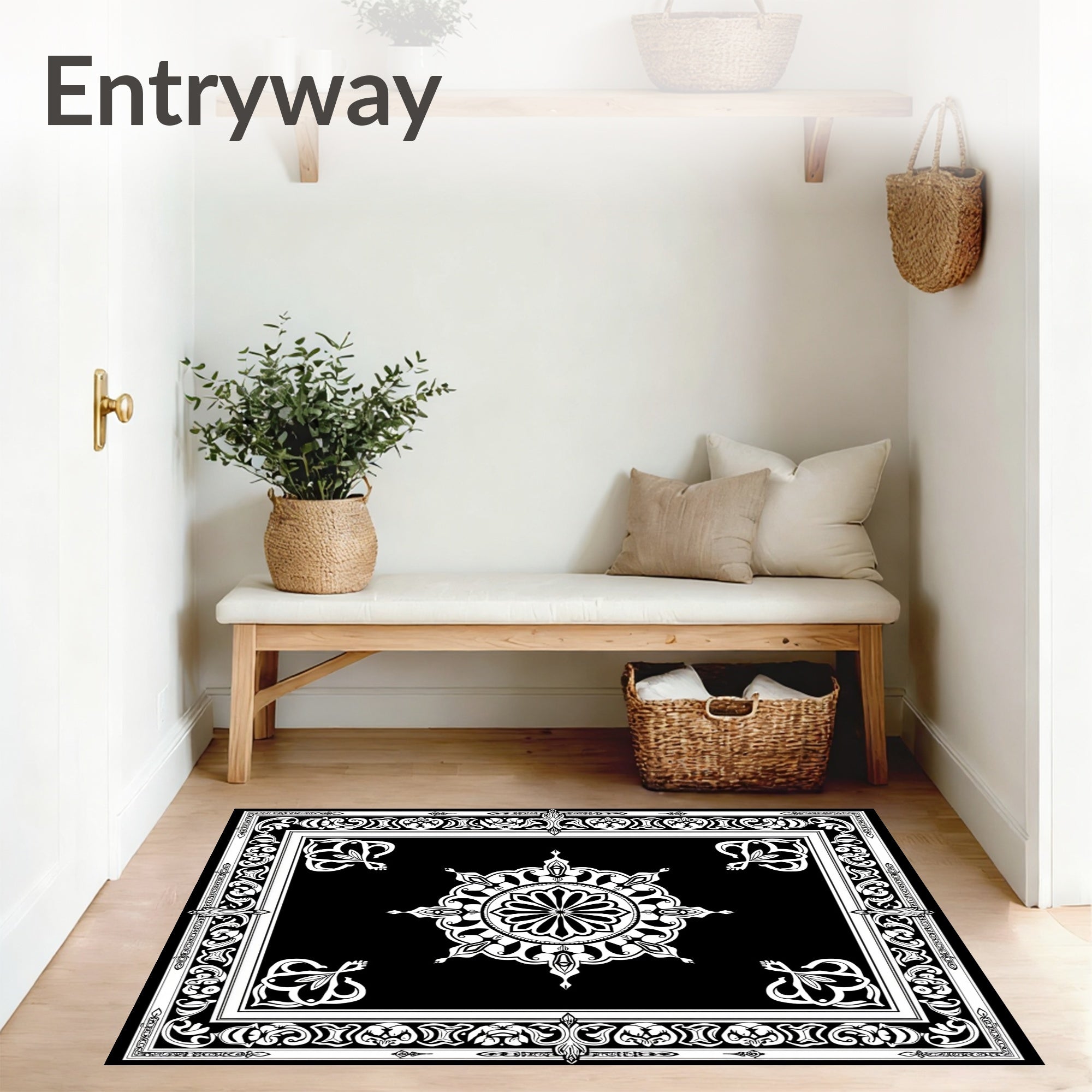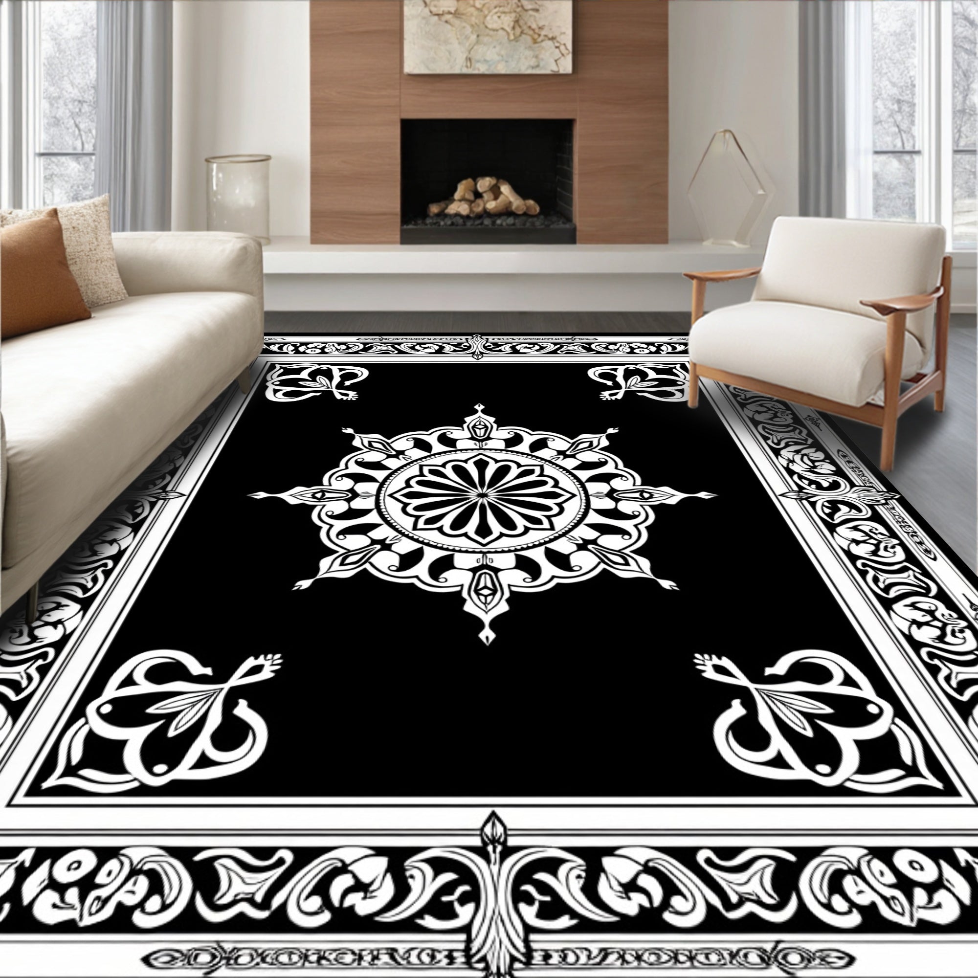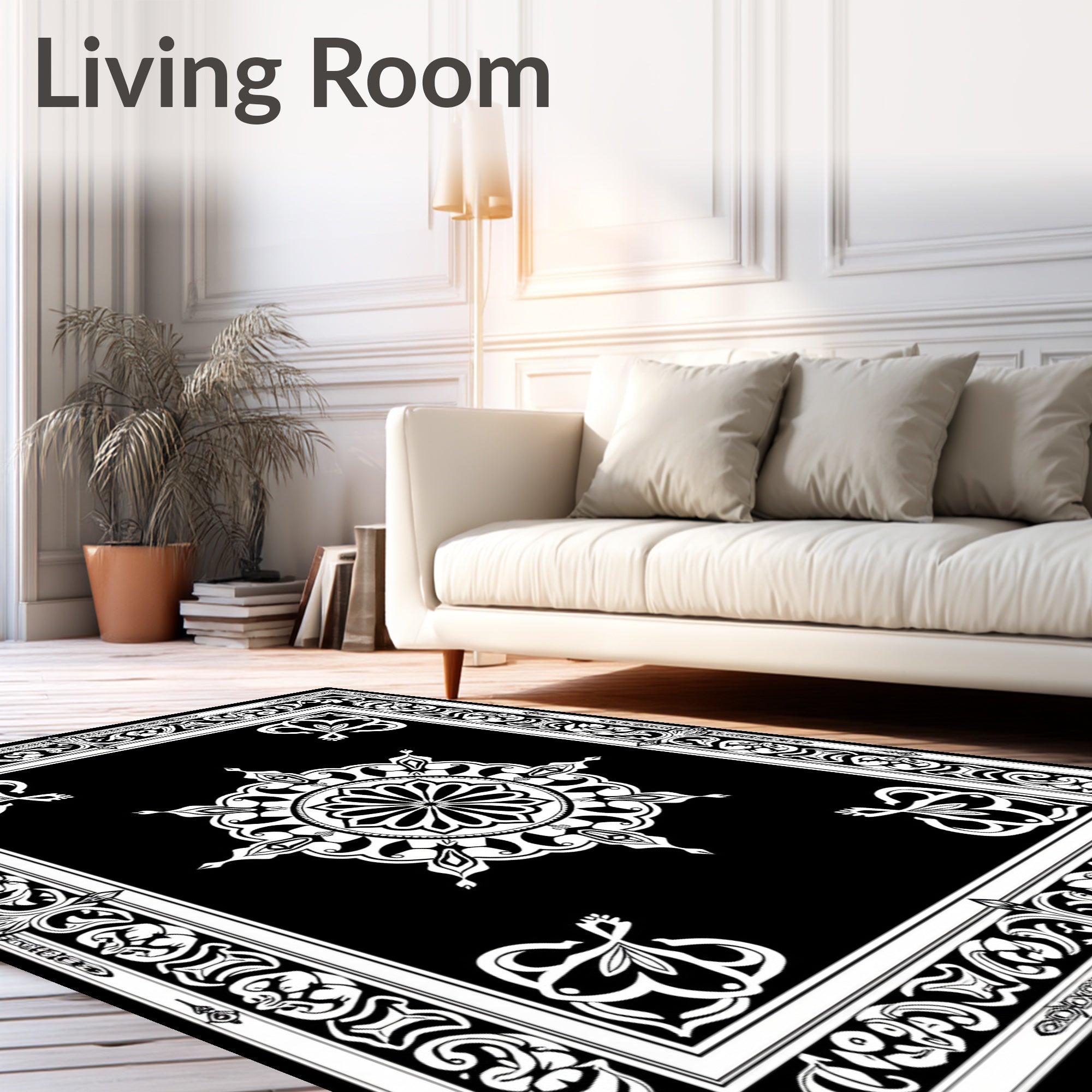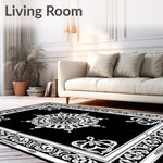 Ultra Soft Area Rug, Non Slip, Stain Resistant, Washable Area Rugs for Living Room, Bedroom, Retro Medallion Interlocking Motif with Stylized Scrollwork Accents(Black) Overview: