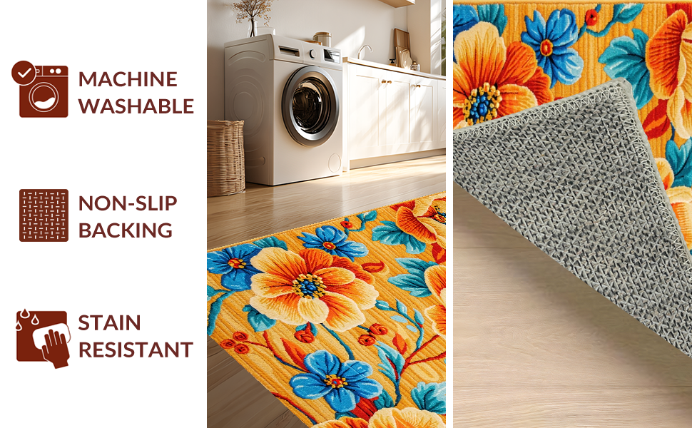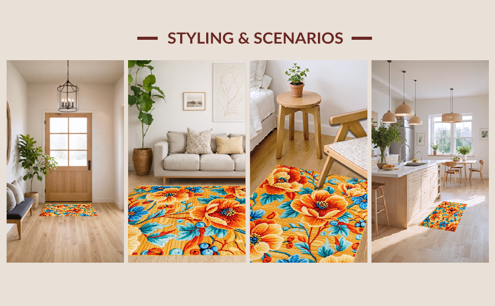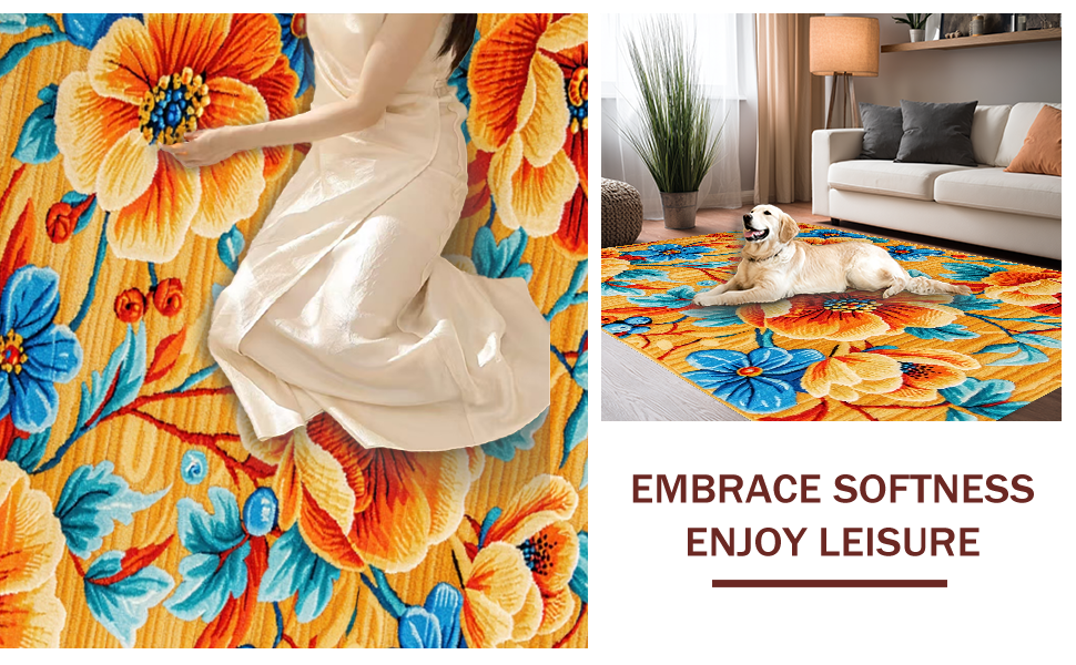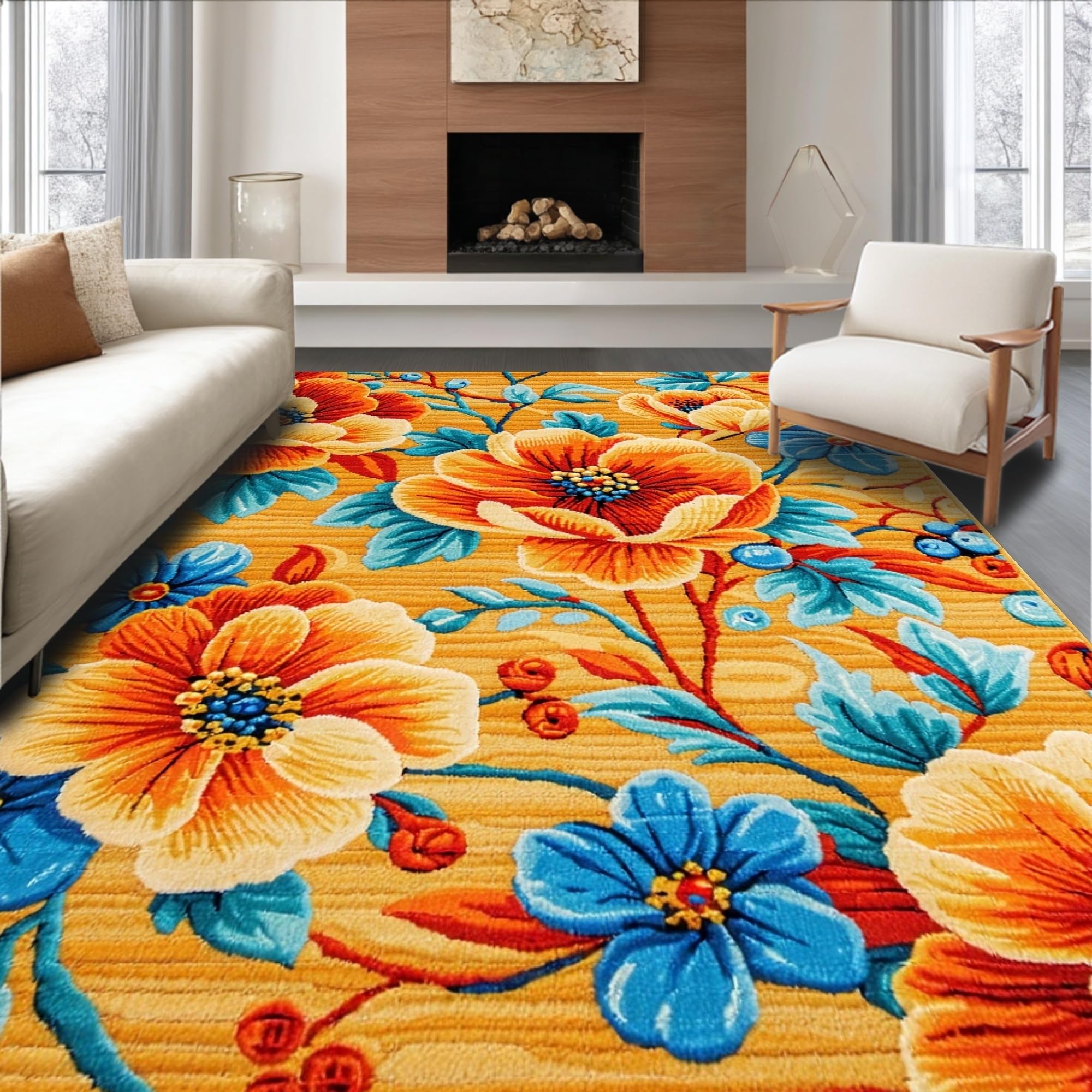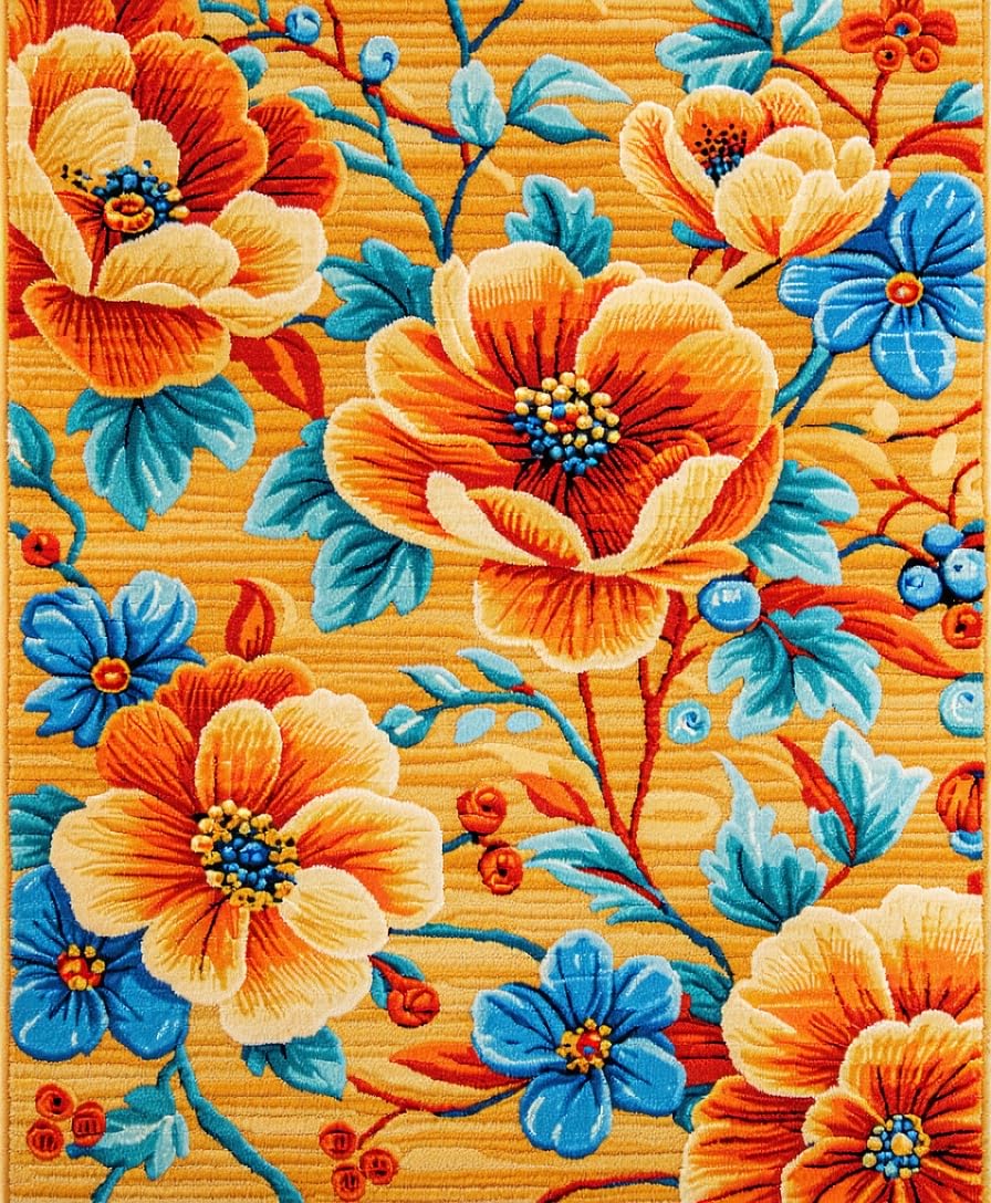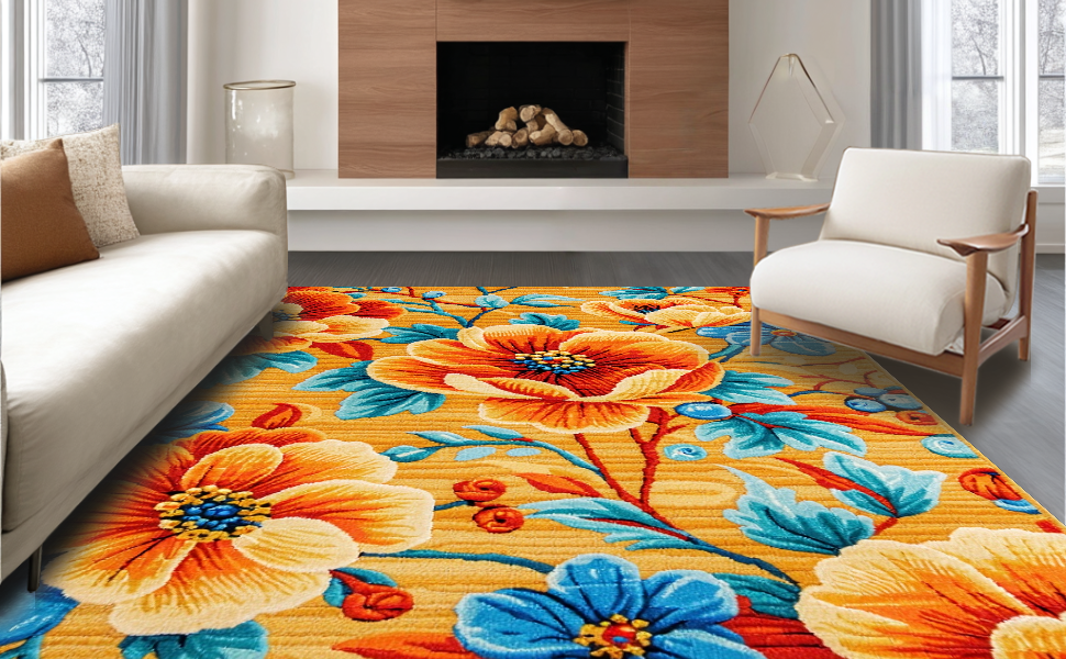 Ultra Soft Area Rug, Non Slip, Stain Resistant, Washable Area Rugs for Living Room, Bedroom, Richly Colored Abstract Floral Fusion(Orange) Overview: