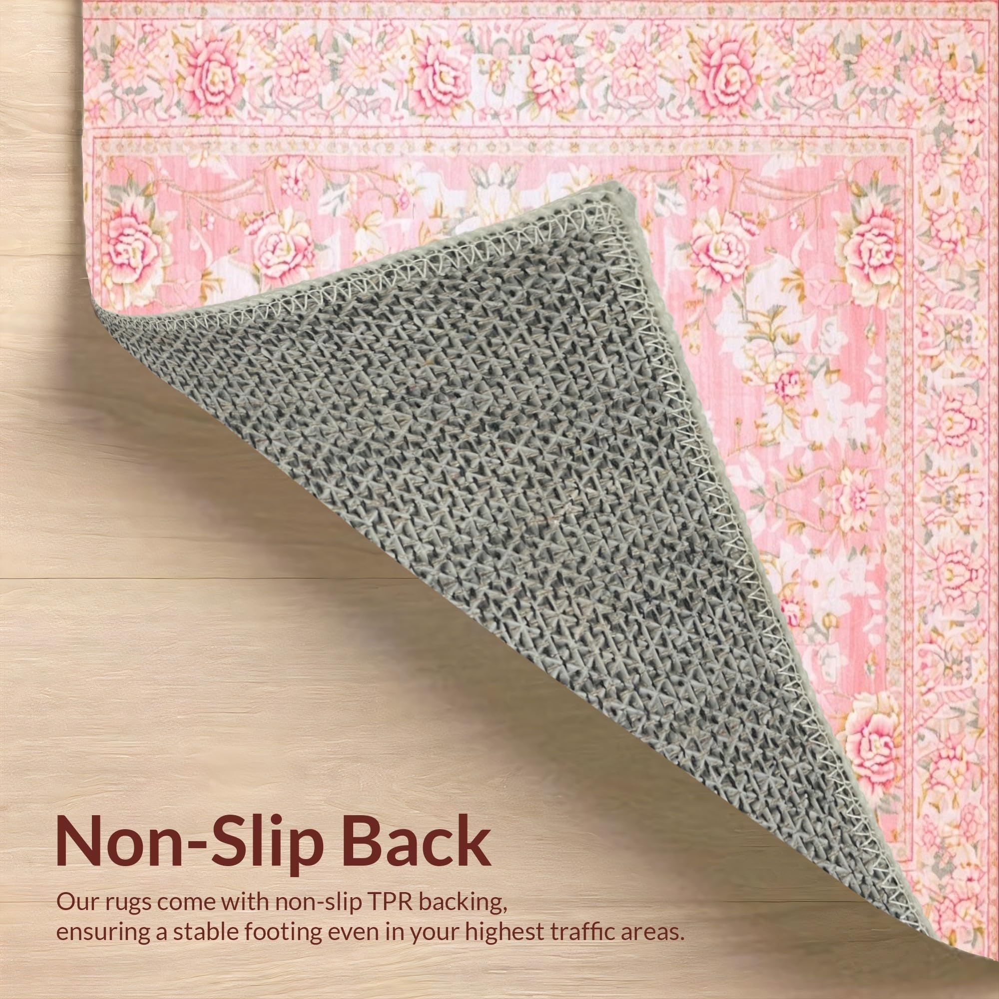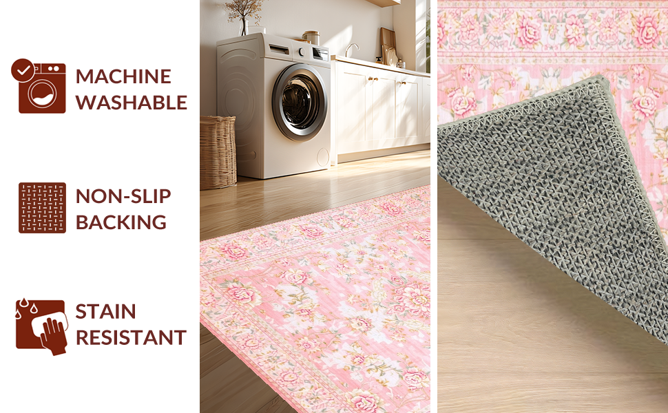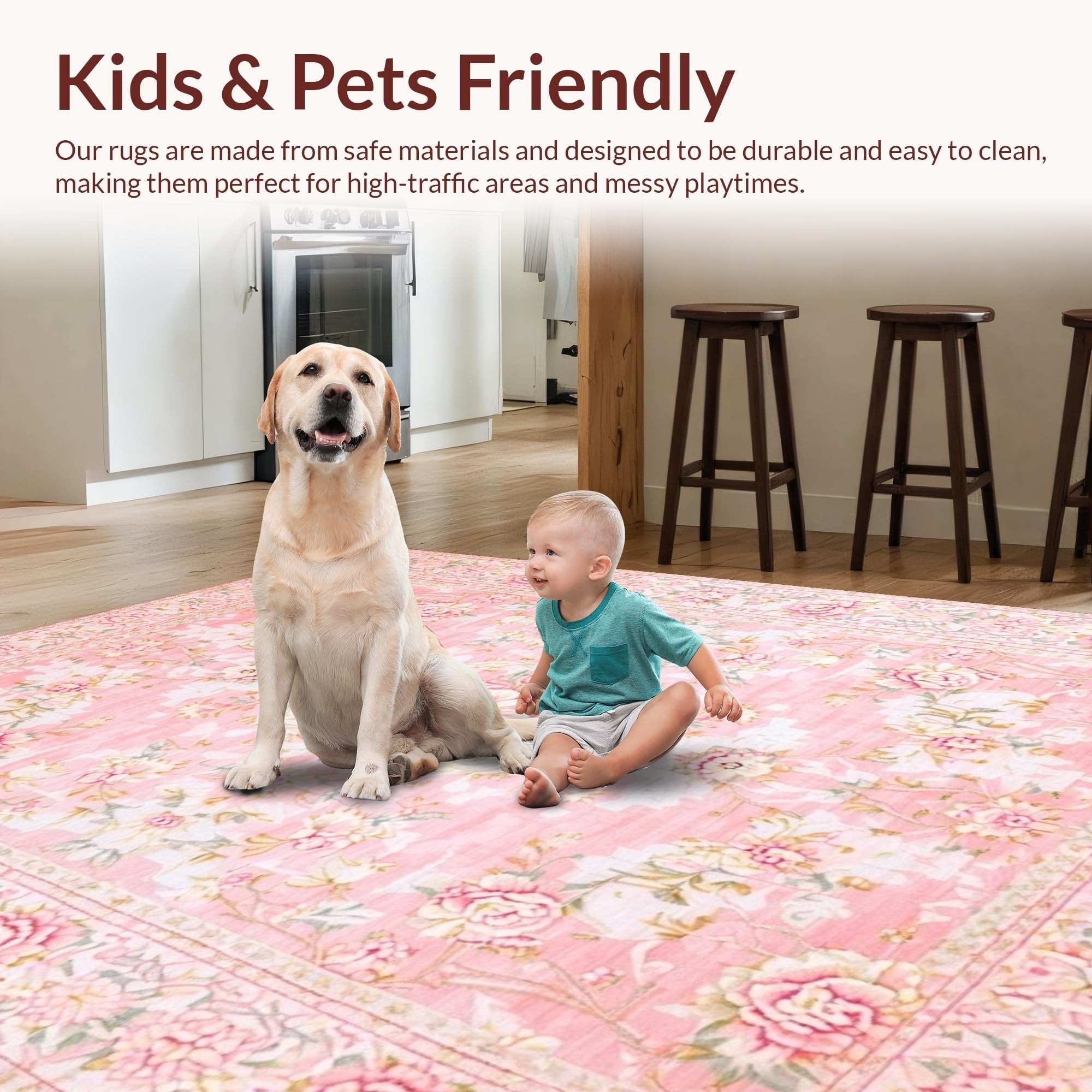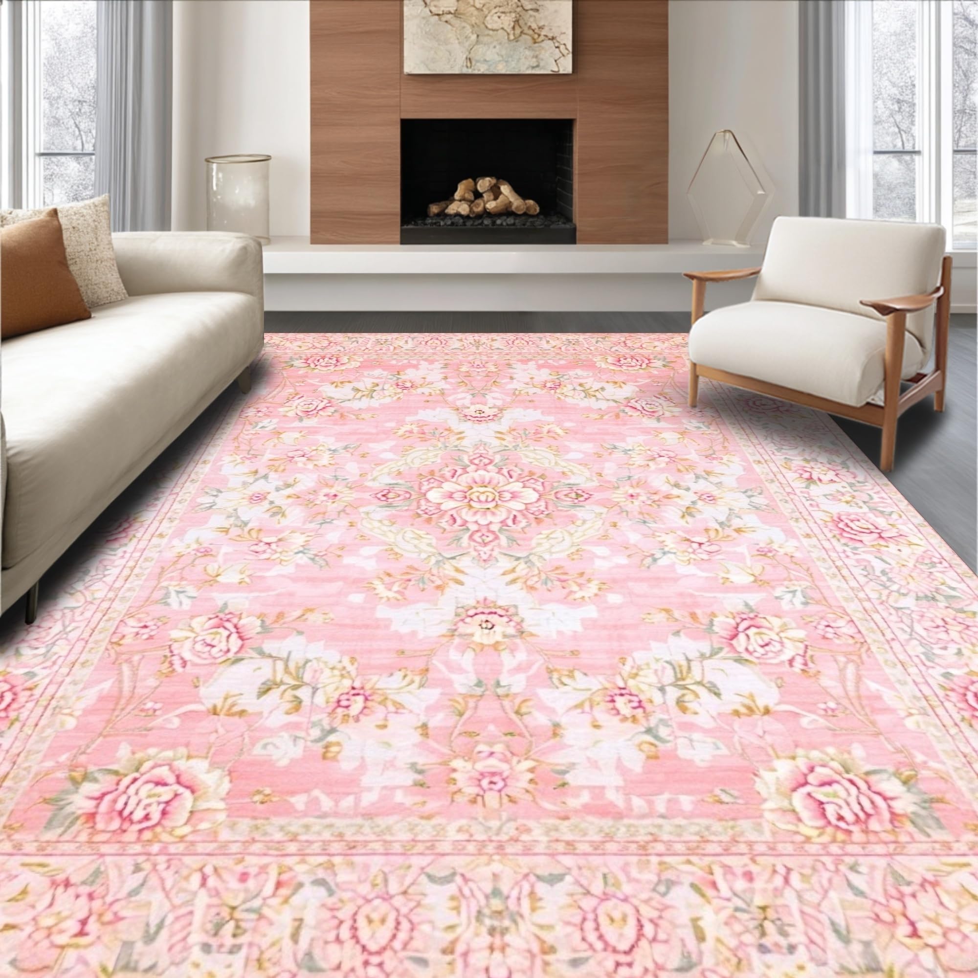 Ultra Soft Area Rug, Non Slip, Stain Resistant, Washable Area Rugs for Living Room, Bedroom, Rustic Elegance with Floral Touch(Pink) Overview: