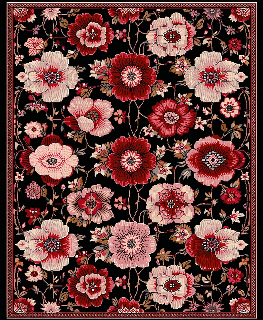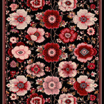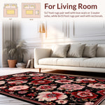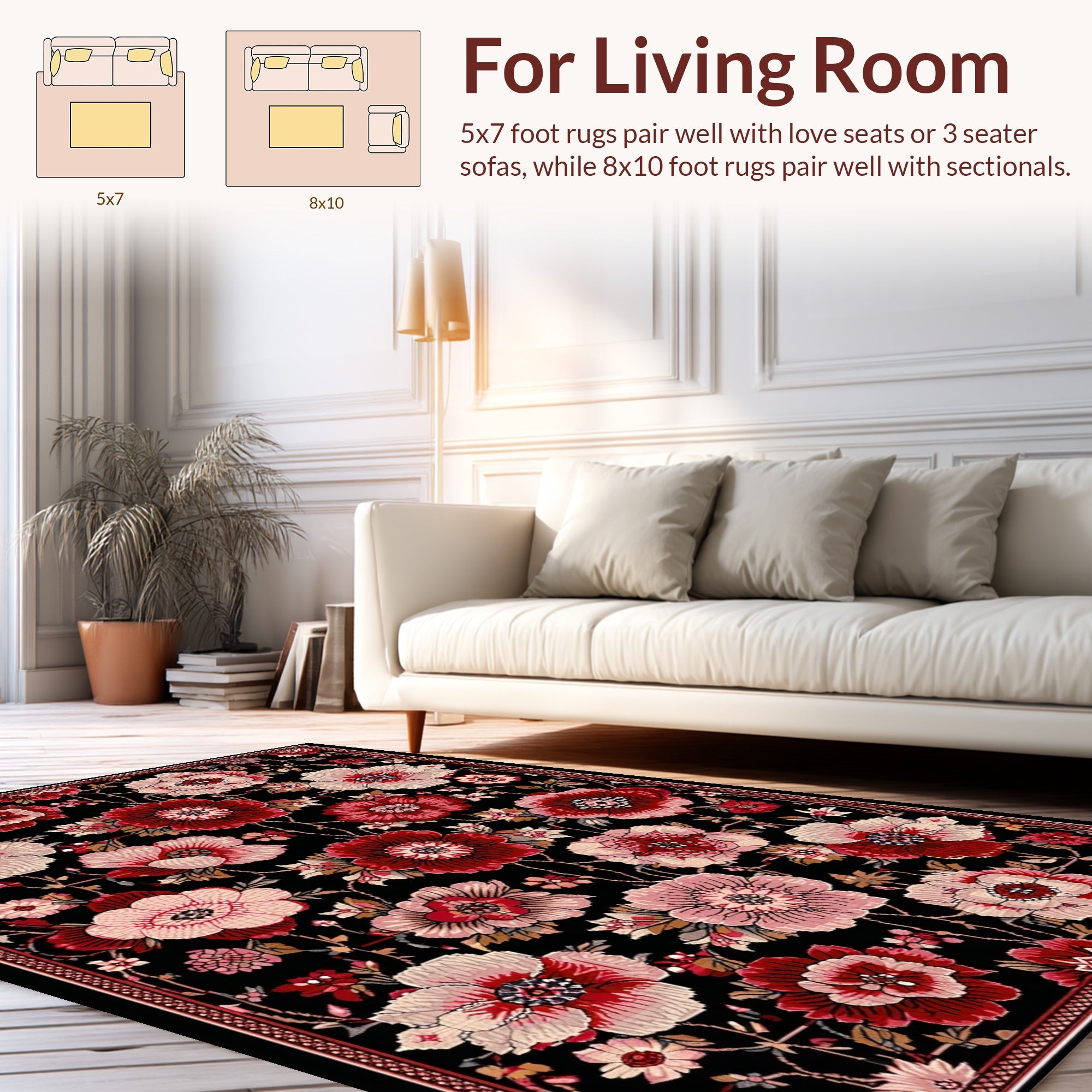 Flatwoven High Traffic Area Rug, Rustic Low Pile Blossom Design, Non Slip, Stain Resistant, Washable Area Rugs for Living Room, Bedroom (Black) Overview: