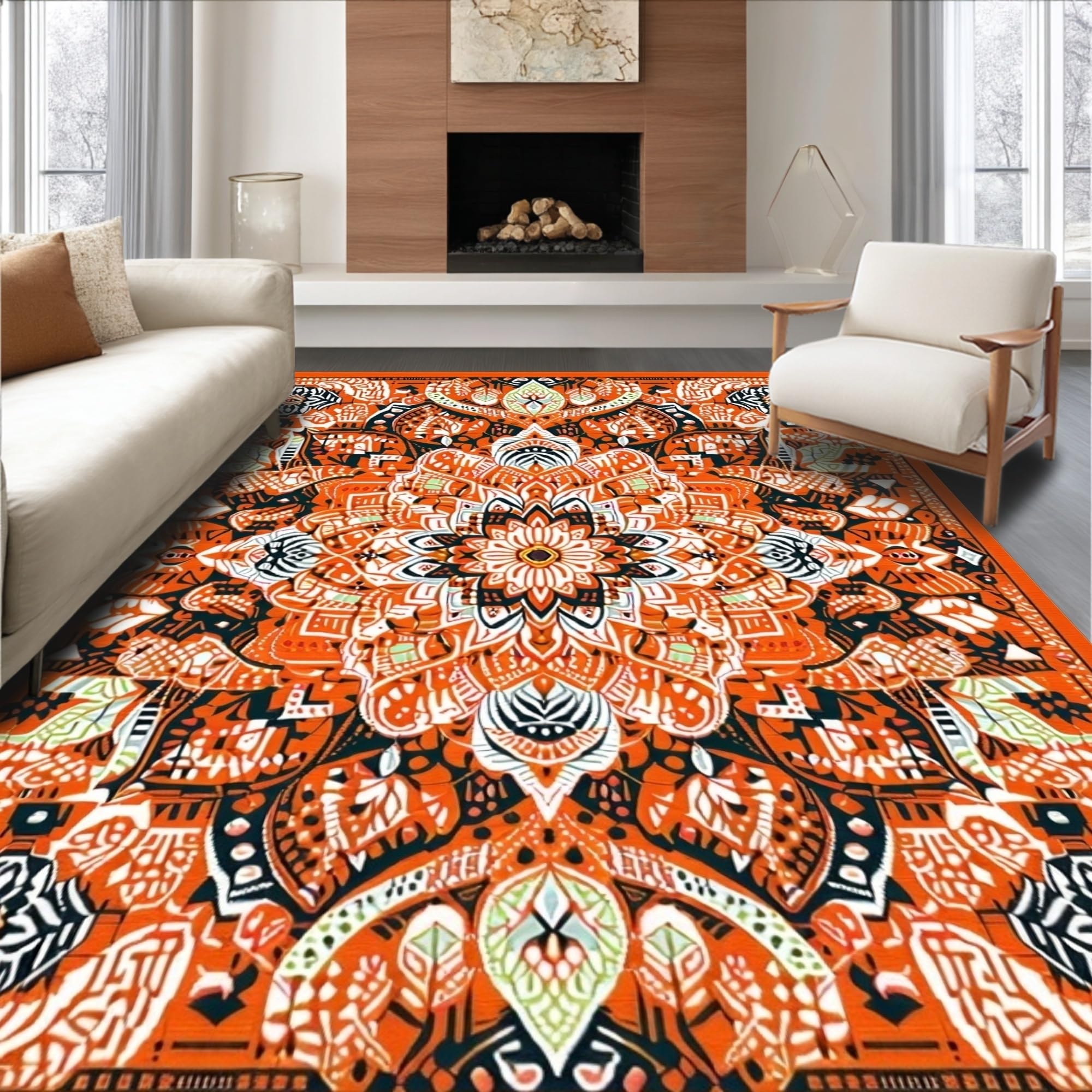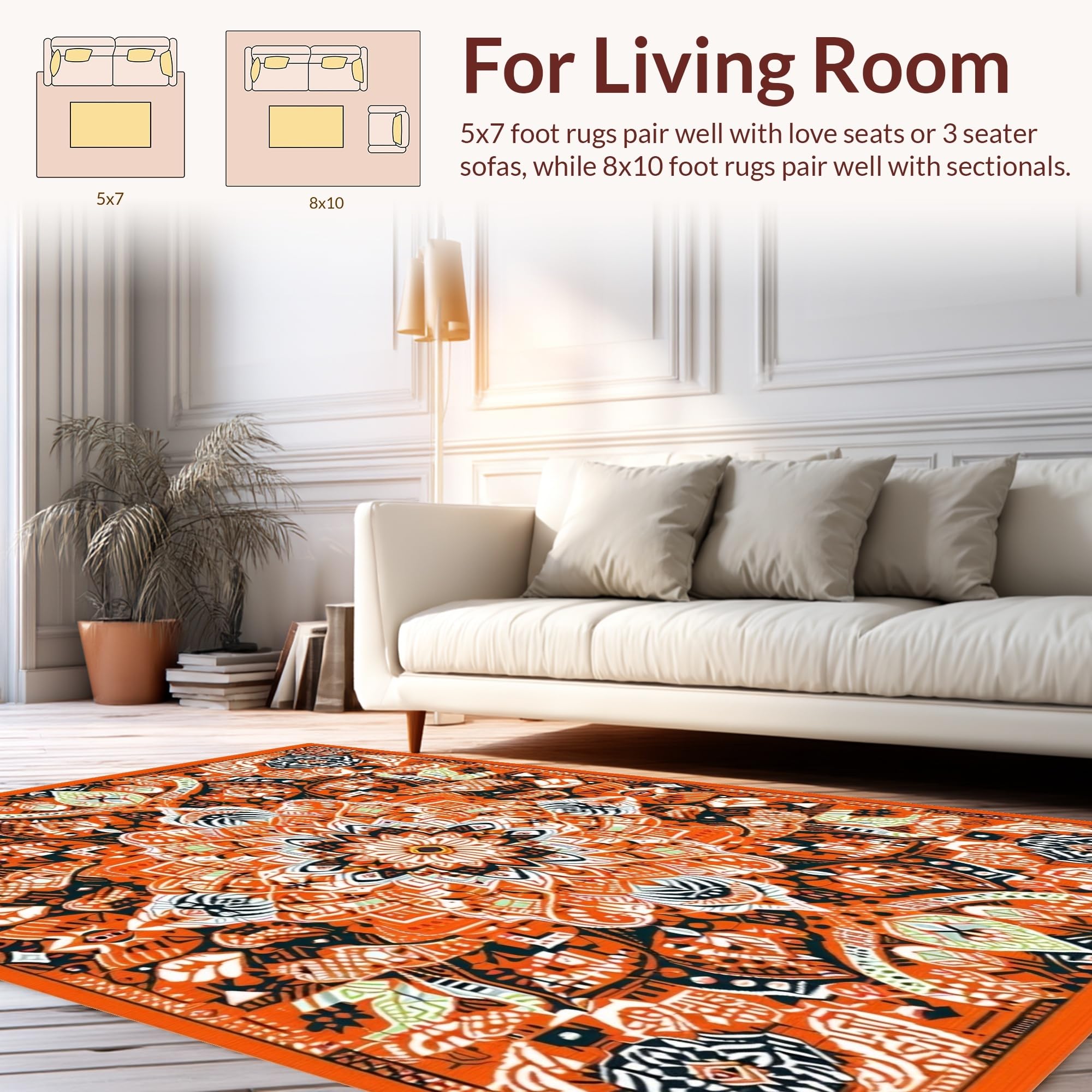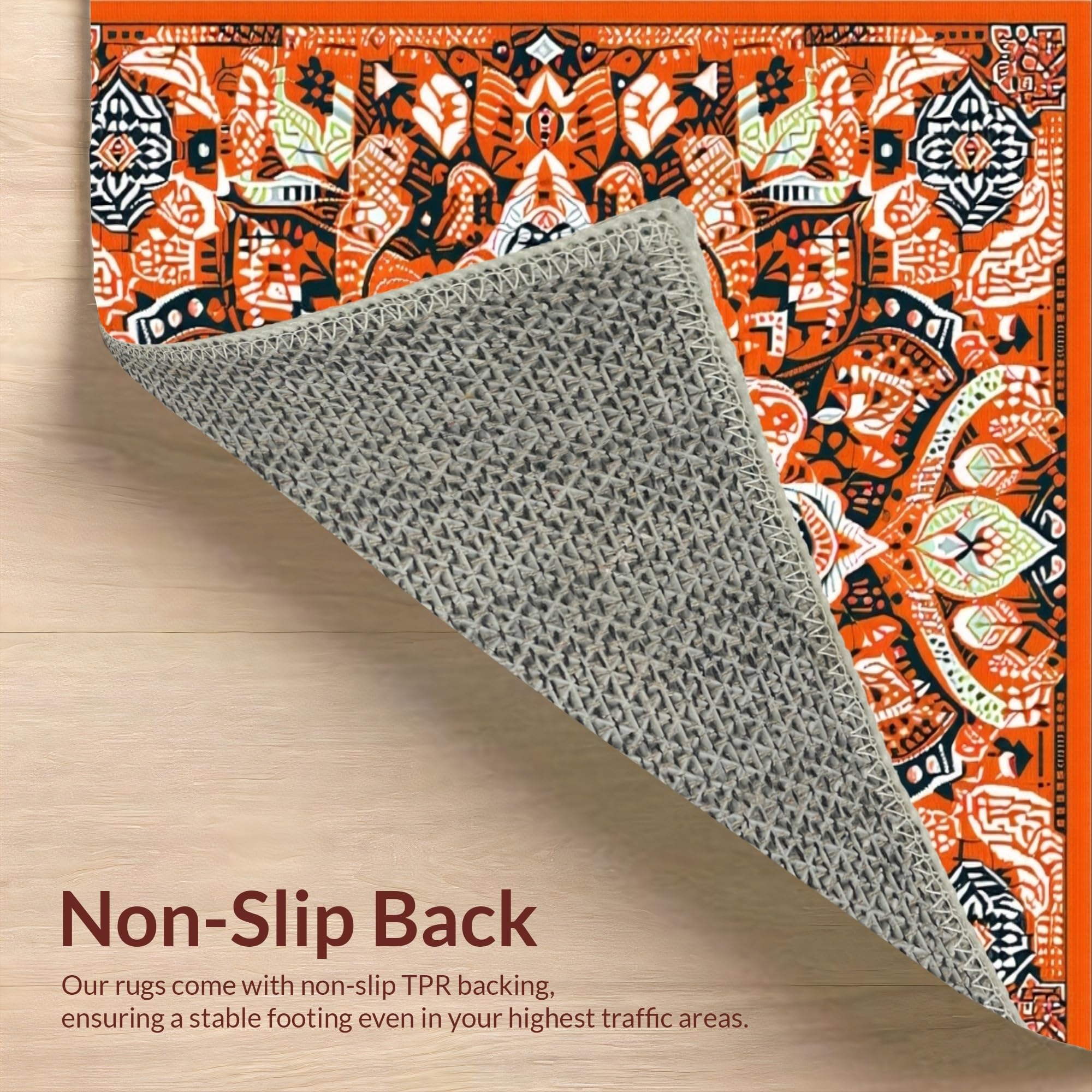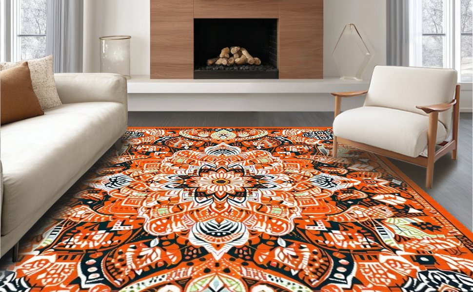 Ultra Soft Area Rug, Non Slip, Stain Resistant, Washable Area Rugs for Living Room, Bedroom, Rustic Orange Circular Flourish(Orange) Overview: