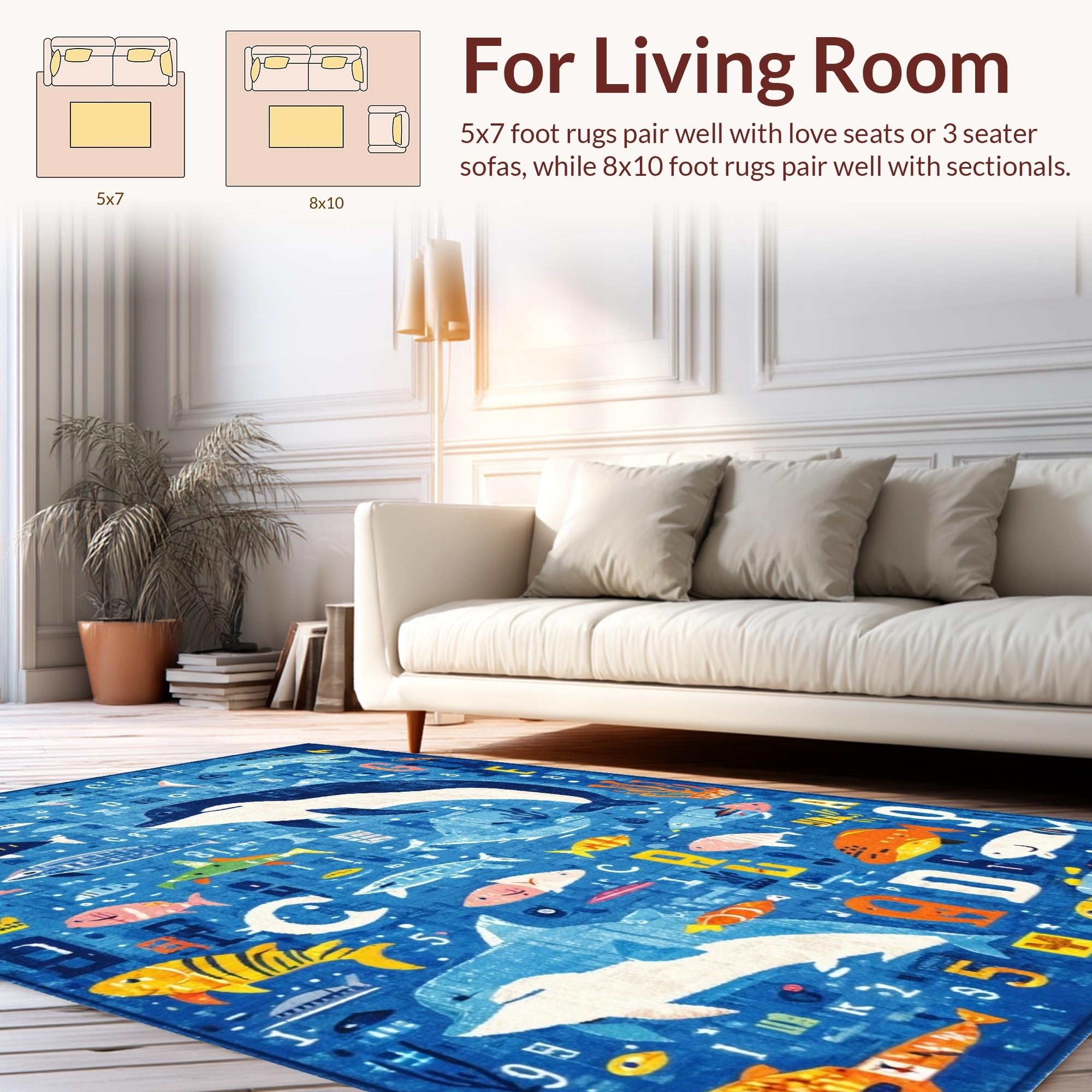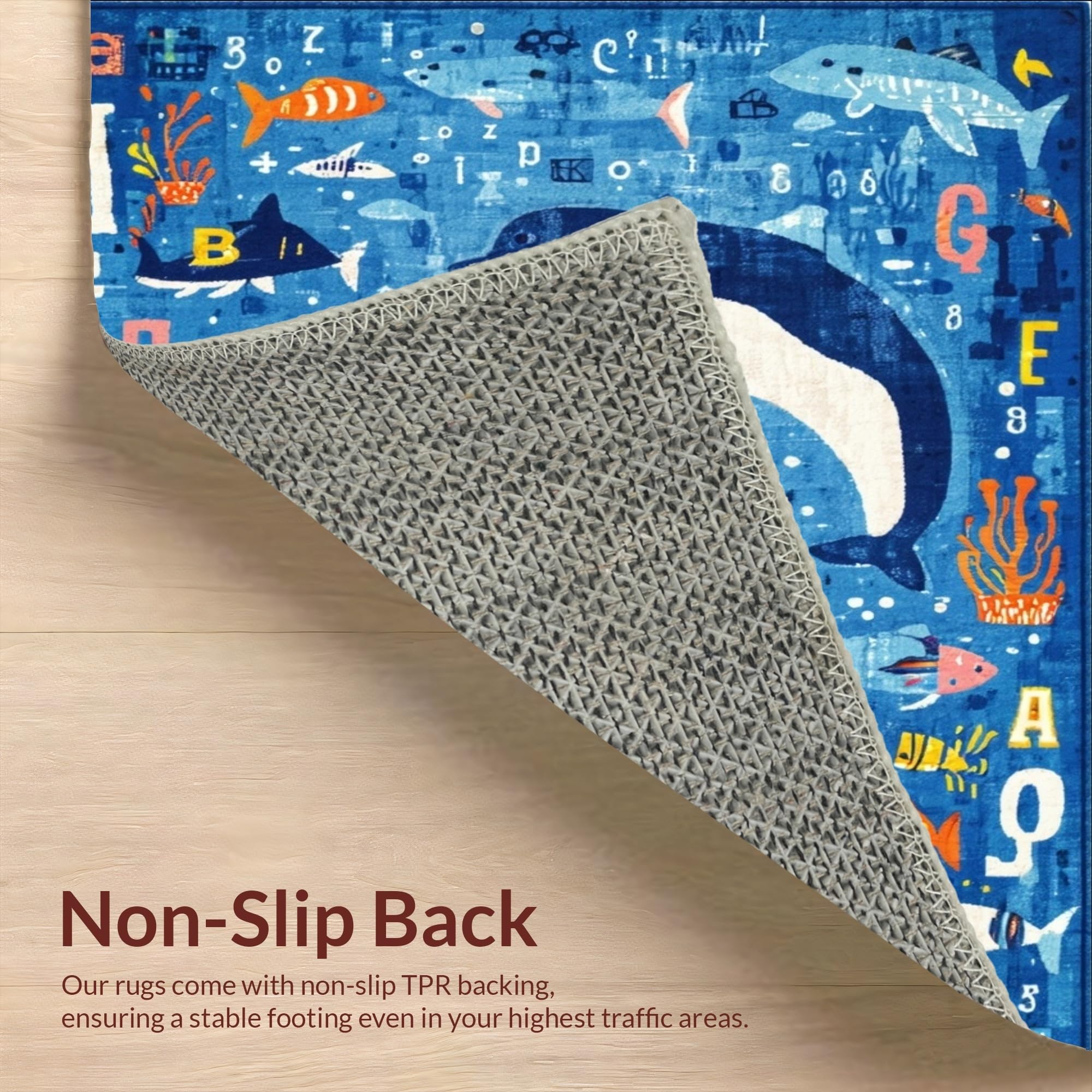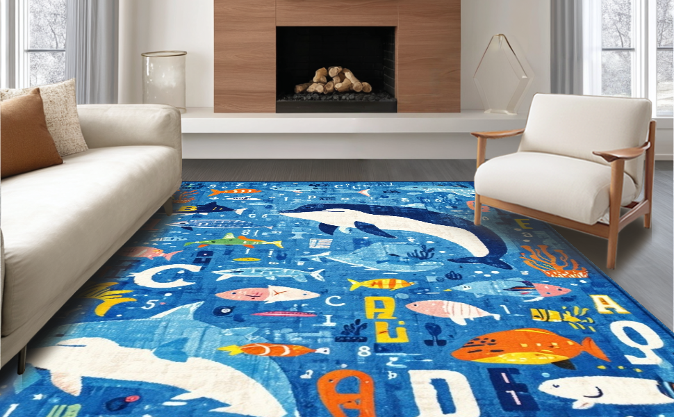 Ultra Soft Area Rug, Non Slip, Stain Resistant, Washable Area Rugs for Living Room, Bedroom, Sea Adventure Alphabet Ocean Animal Carpet Early Learning Playmat(Blue) Overview: