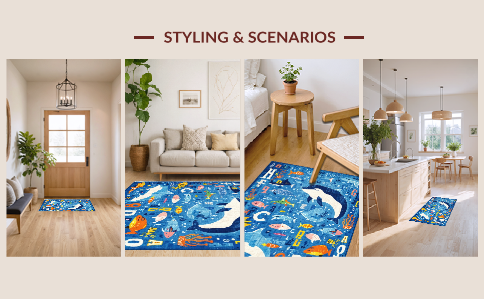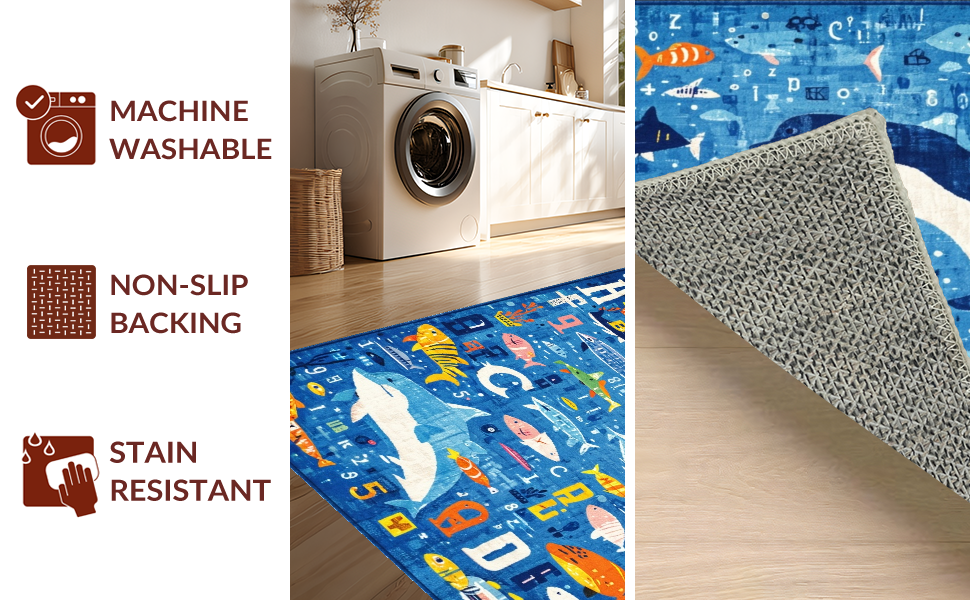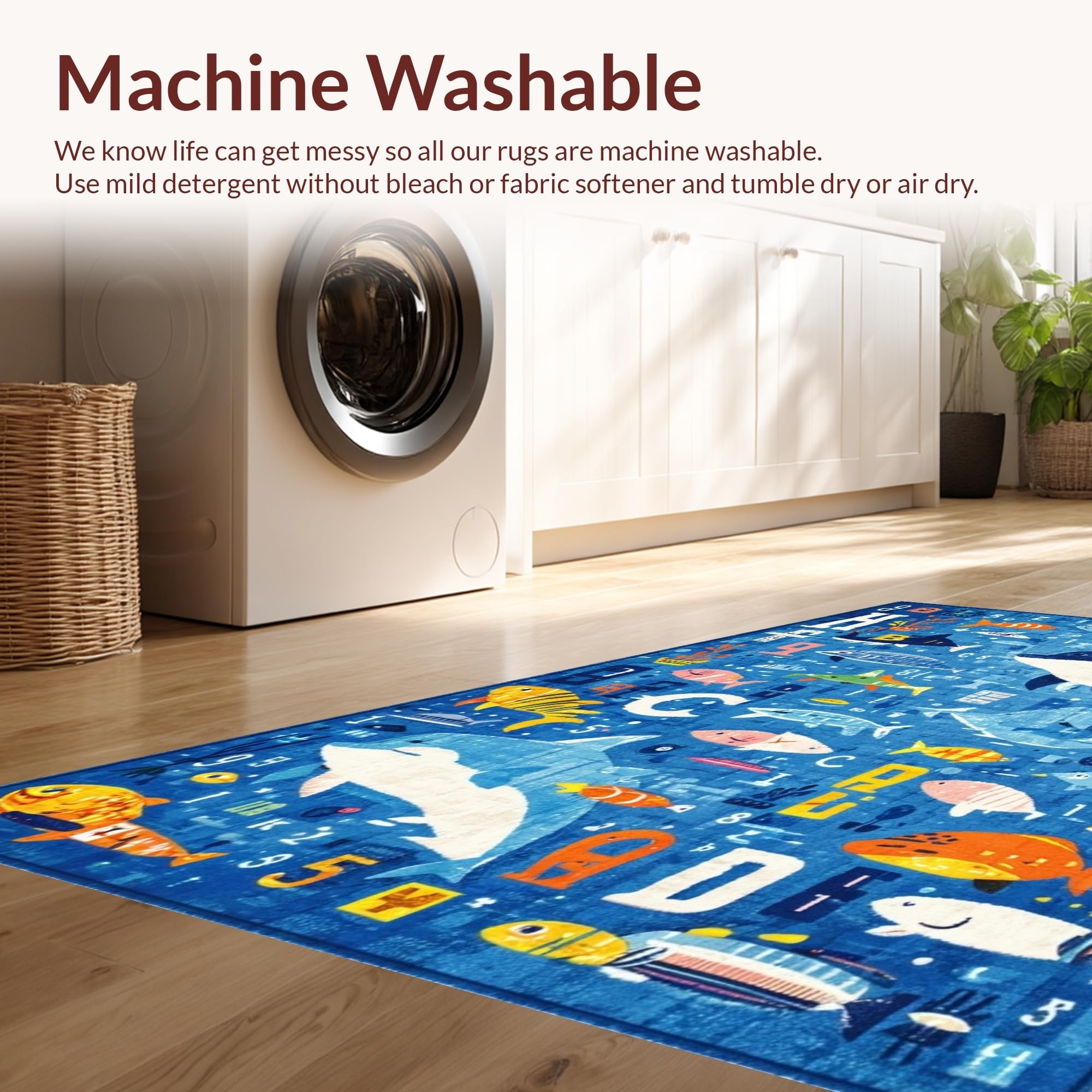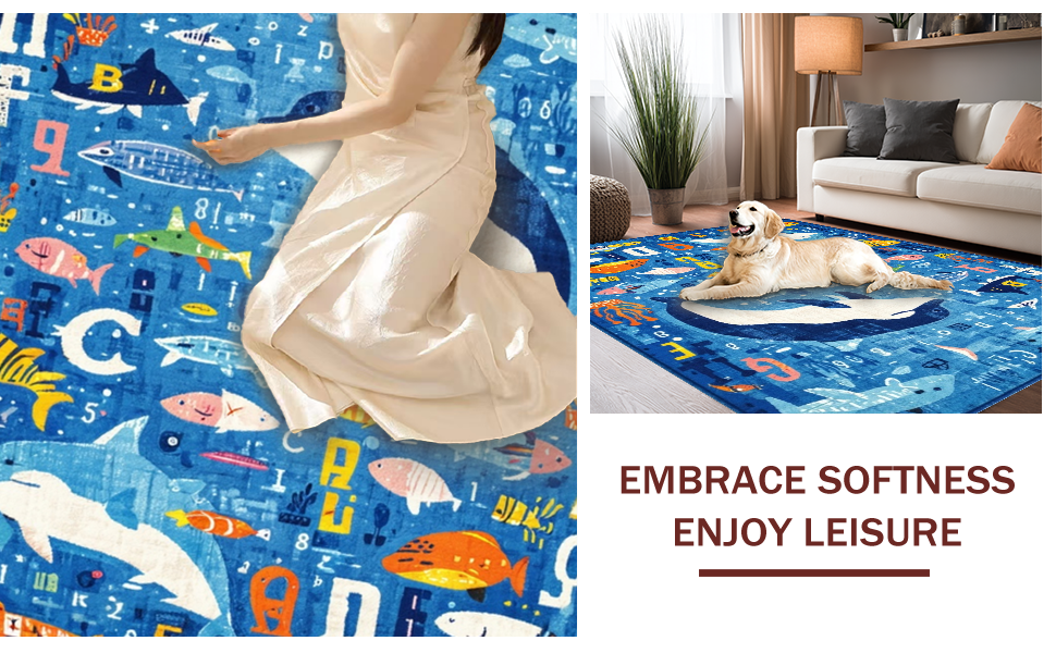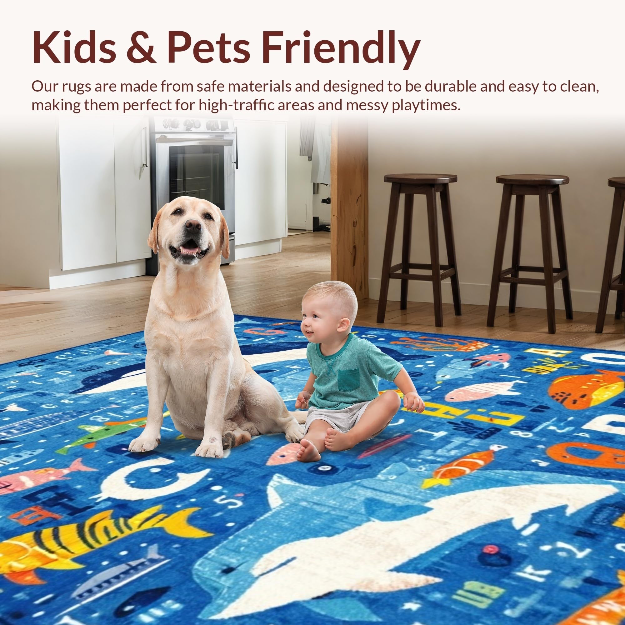 Ultra Soft Area Rug, Non Slip, Stain Resistant, Washable Area Rugs for Living Room, Bedroom, Sea Adventure Alphabet Ocean Animal Carpet Early Learning Playmat(Blue) Overview: