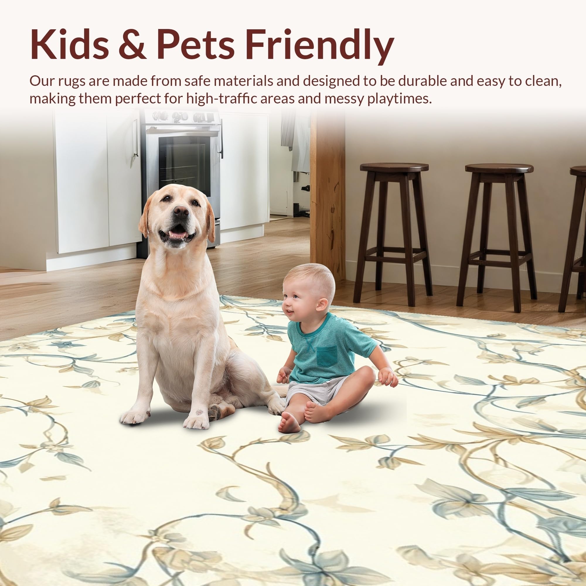 Ultra Soft Area Rug, Non Slip, Stain Resistant, Washable Area Rugs for Living Room, Bedroom, Serene Botanical Wave Area Featuring Light Blue and Beige Floral Swirls(Beige) Overview: