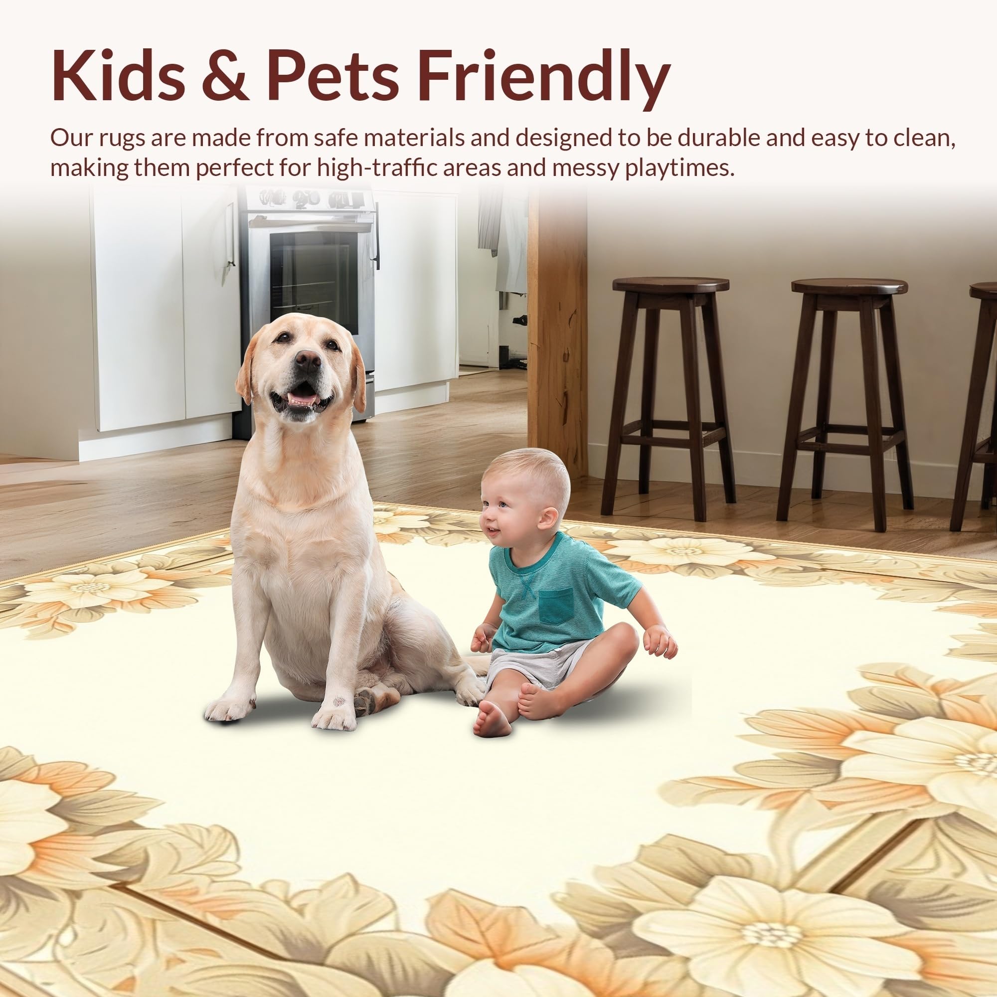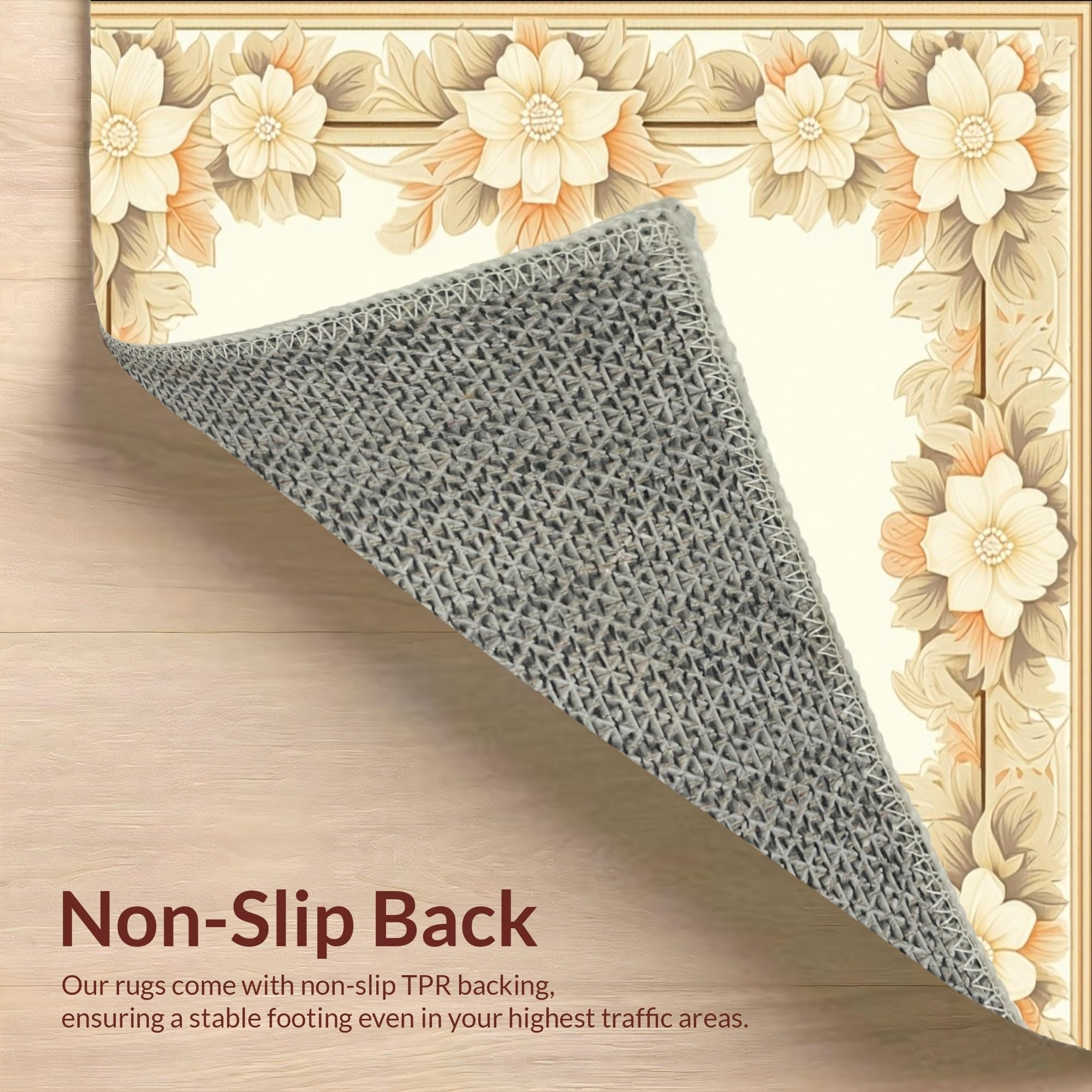 Ultra Soft Area Rug, Non Slip, Stain Resistant, Washable Area Rugs for Living Room, Bedroom, Serene Petal Border – Beige Area with Floral Frame(Beige) Overview: