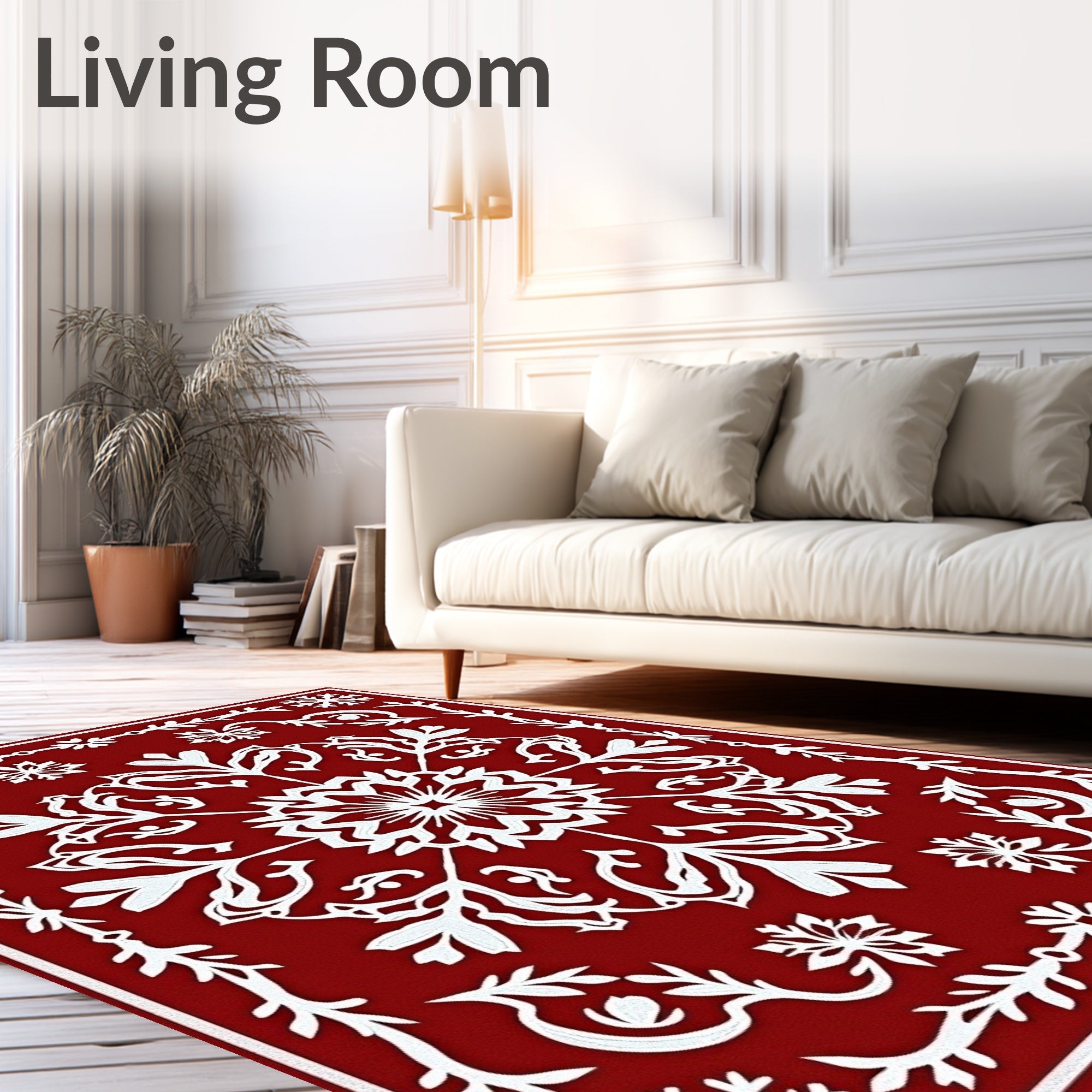 Ultra Soft Area Rug, Non Slip, Stain Resistant, Washable Area Rugs for Living Room, Bedroom, Snowflake Holiday Festive Low Pile Boho Design(Red) Overview: