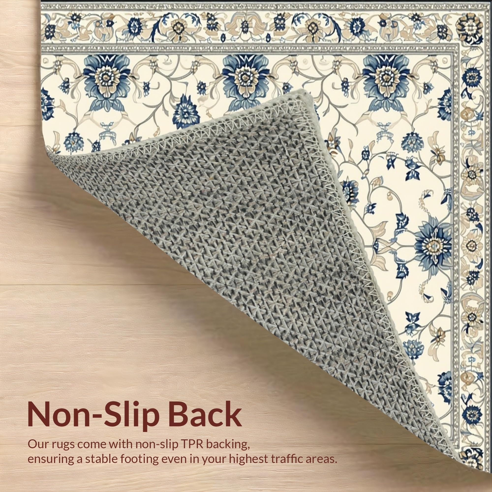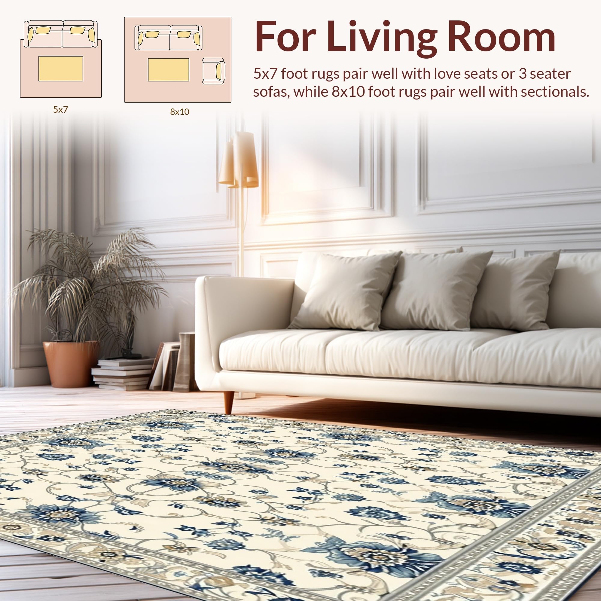 Ultra Soft Area Rug, Non Slip, Stain Resistant, Washable Area Rugs for Living Room, Bedroom, Sophisticated Area Featuring Elegant Beige and Blue Floral Designs(Beige) Overview: