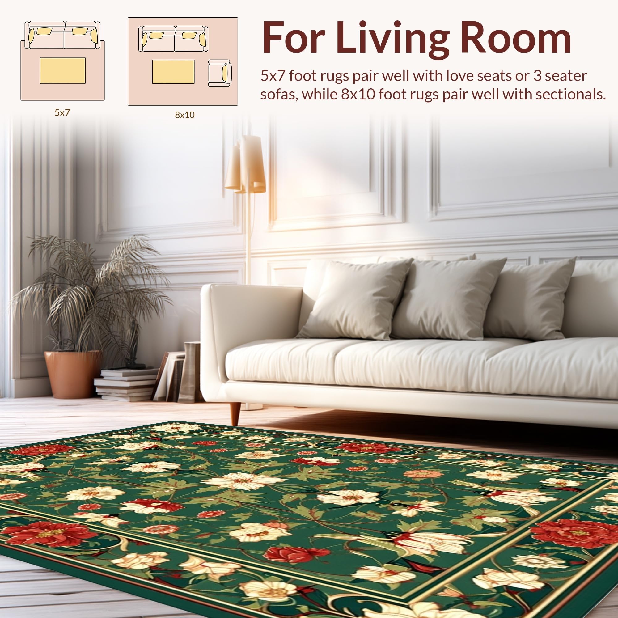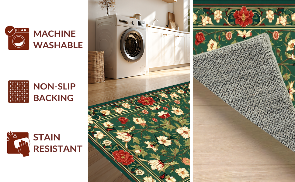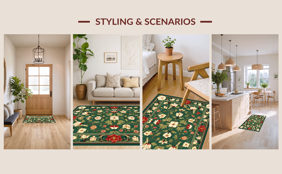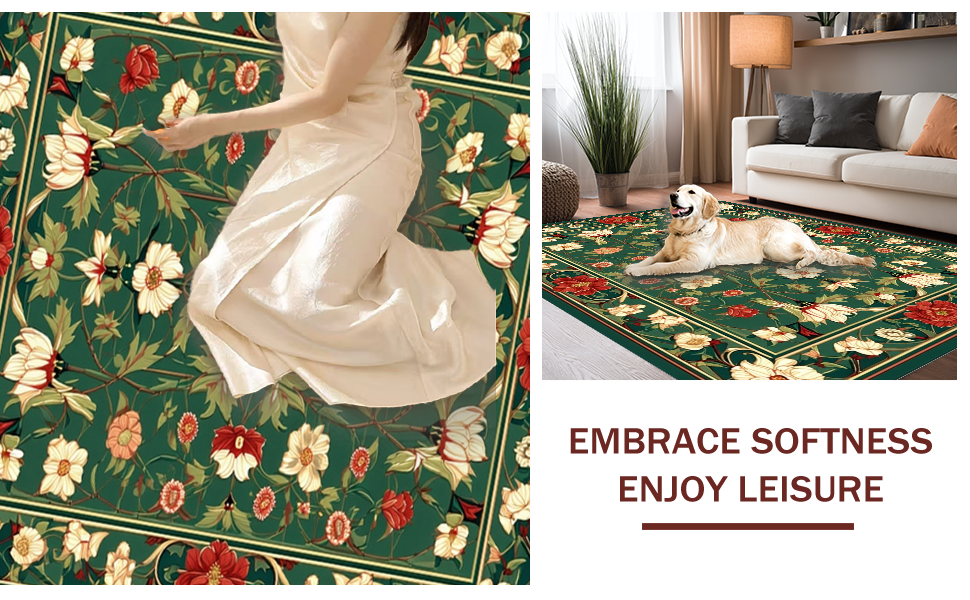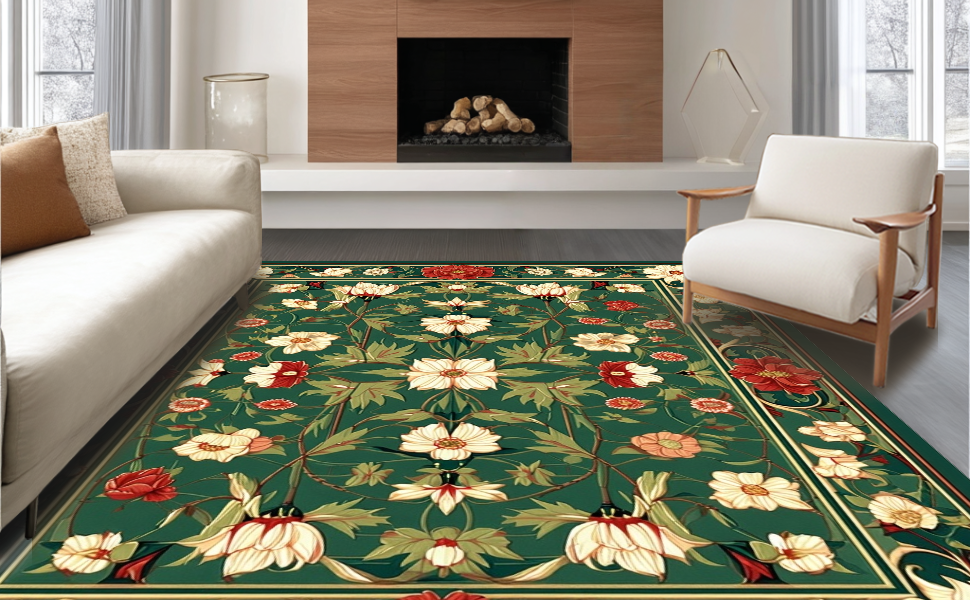 Ultra Soft Area Rug, Non Slip, Stain Resistant, Washable Area Rugs for Living Room, Bedroom, Sophisticated Classic Botanical Theme(Green) Overview: