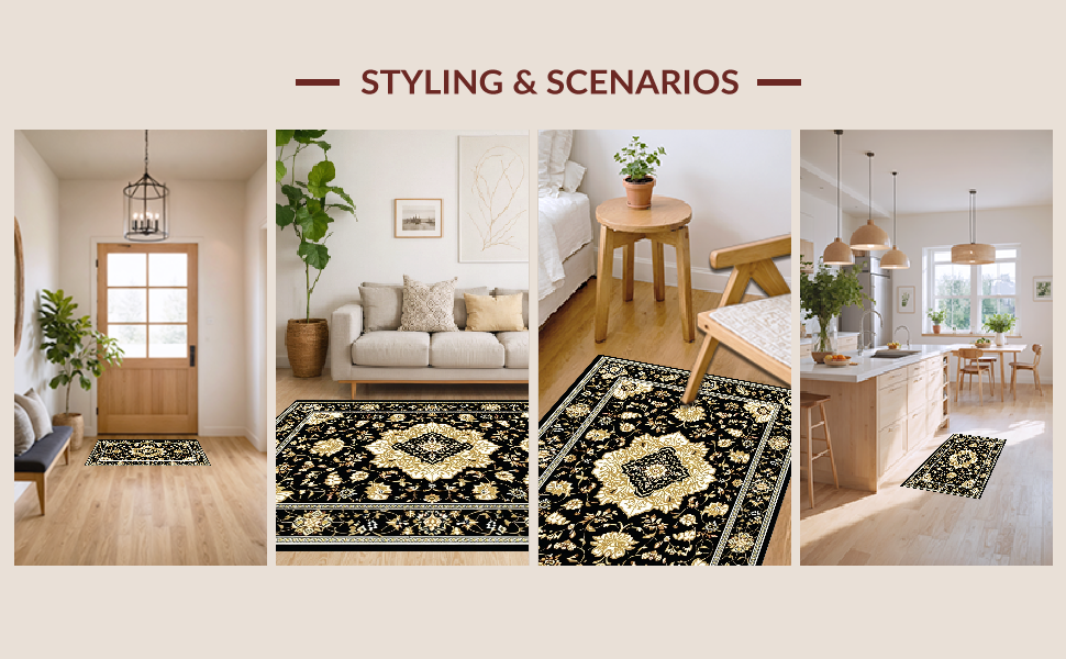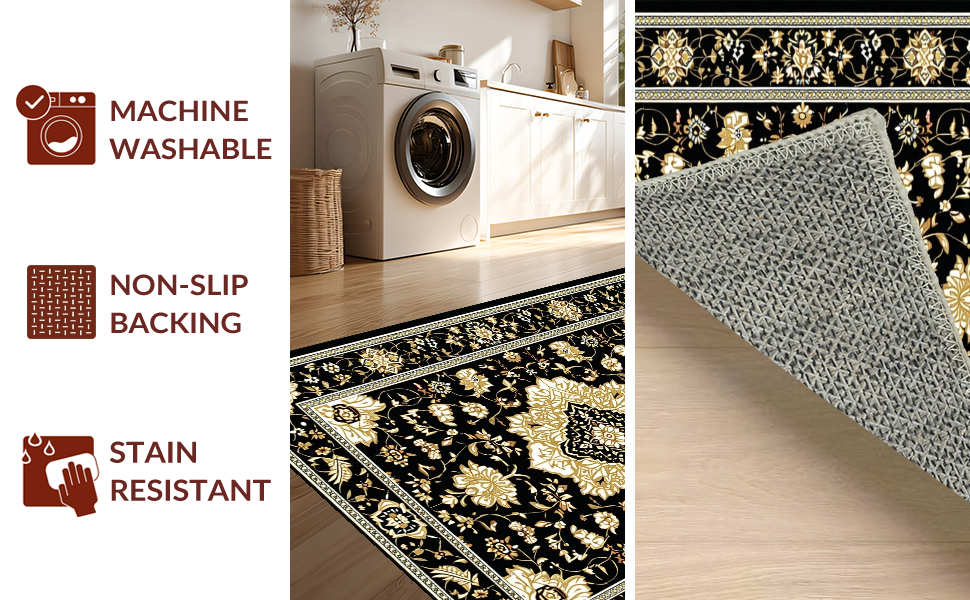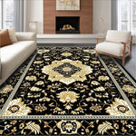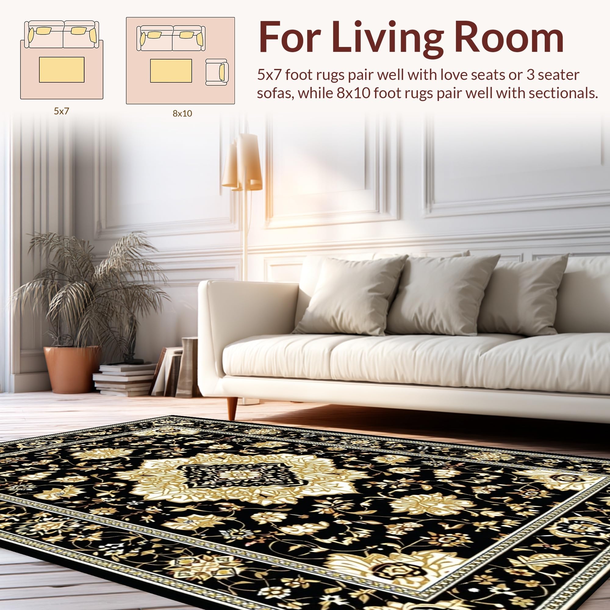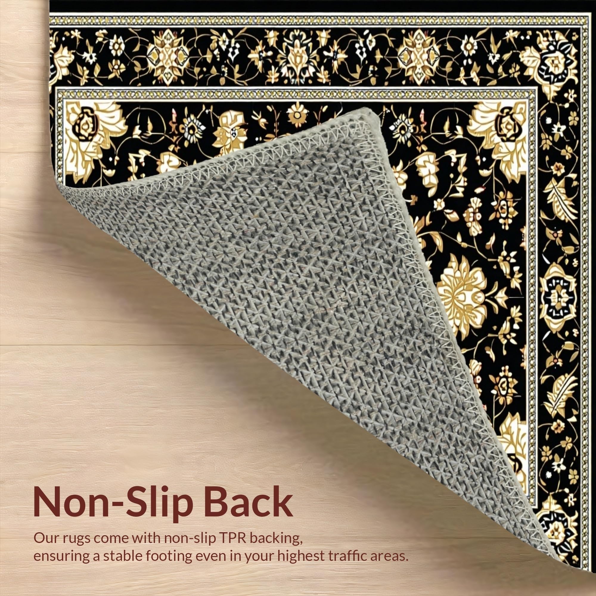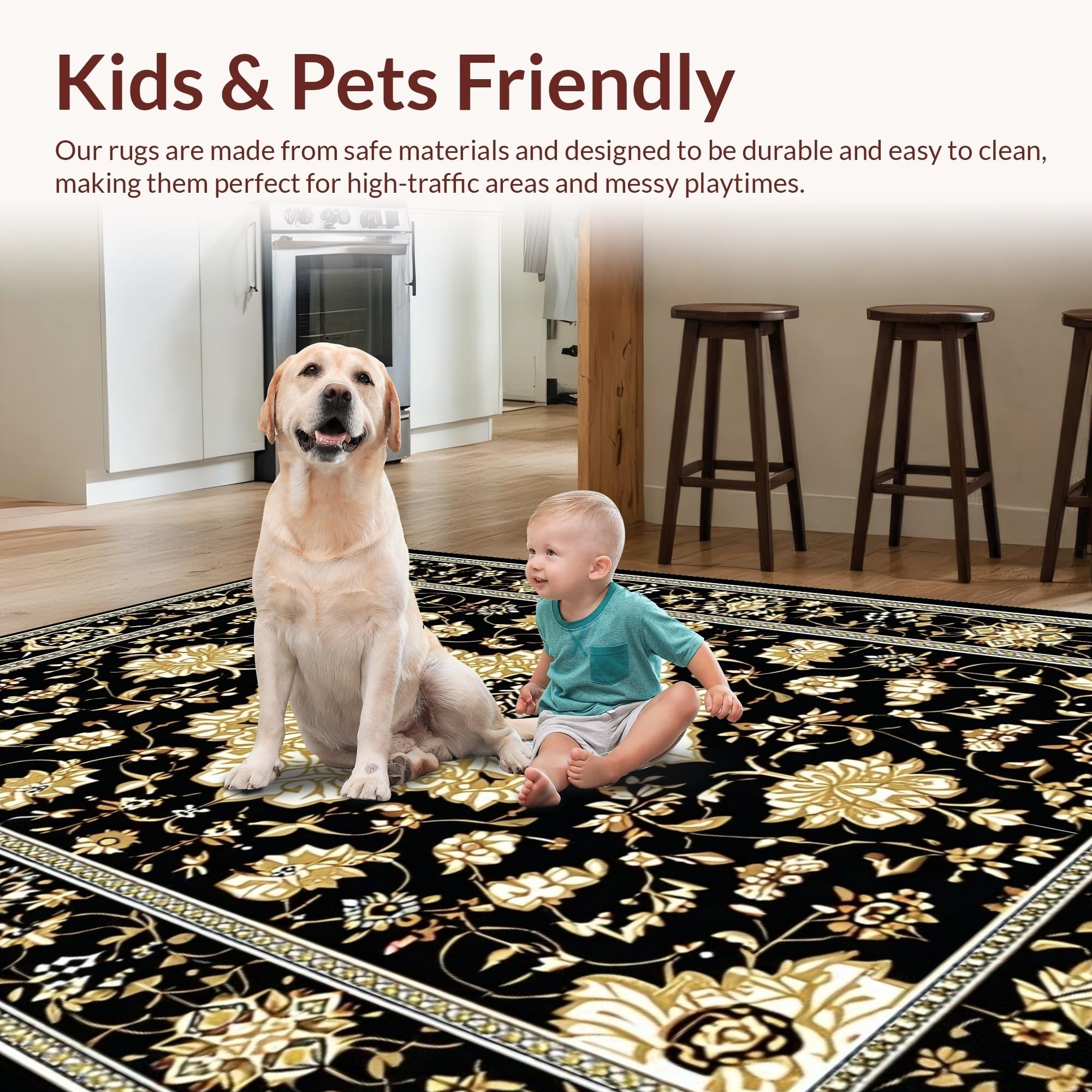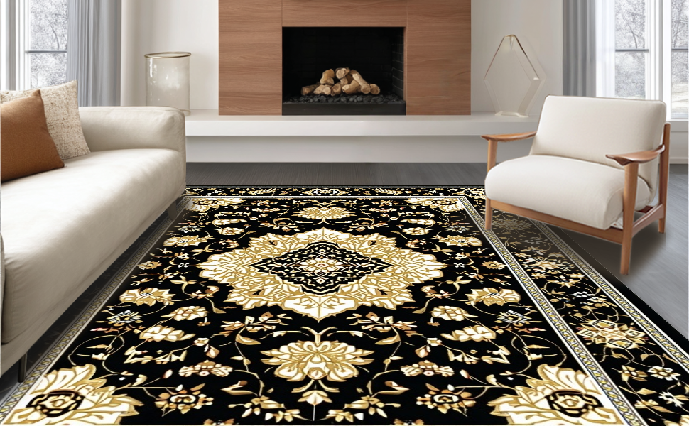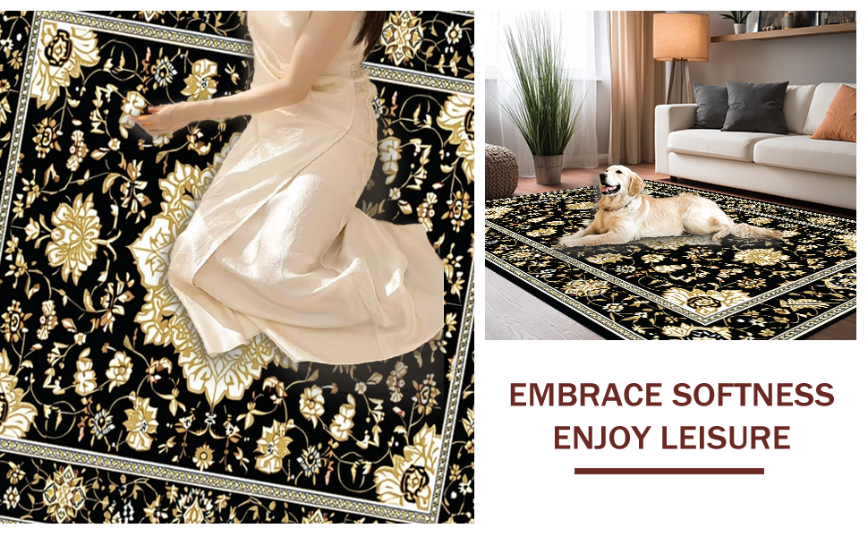 Ultra Soft Area Rug, Non Slip, Stain Resistant, Washable Area Rugs for Living Room, Bedroom, Sophisticated Distressed Floral Accent(Black) Overview: