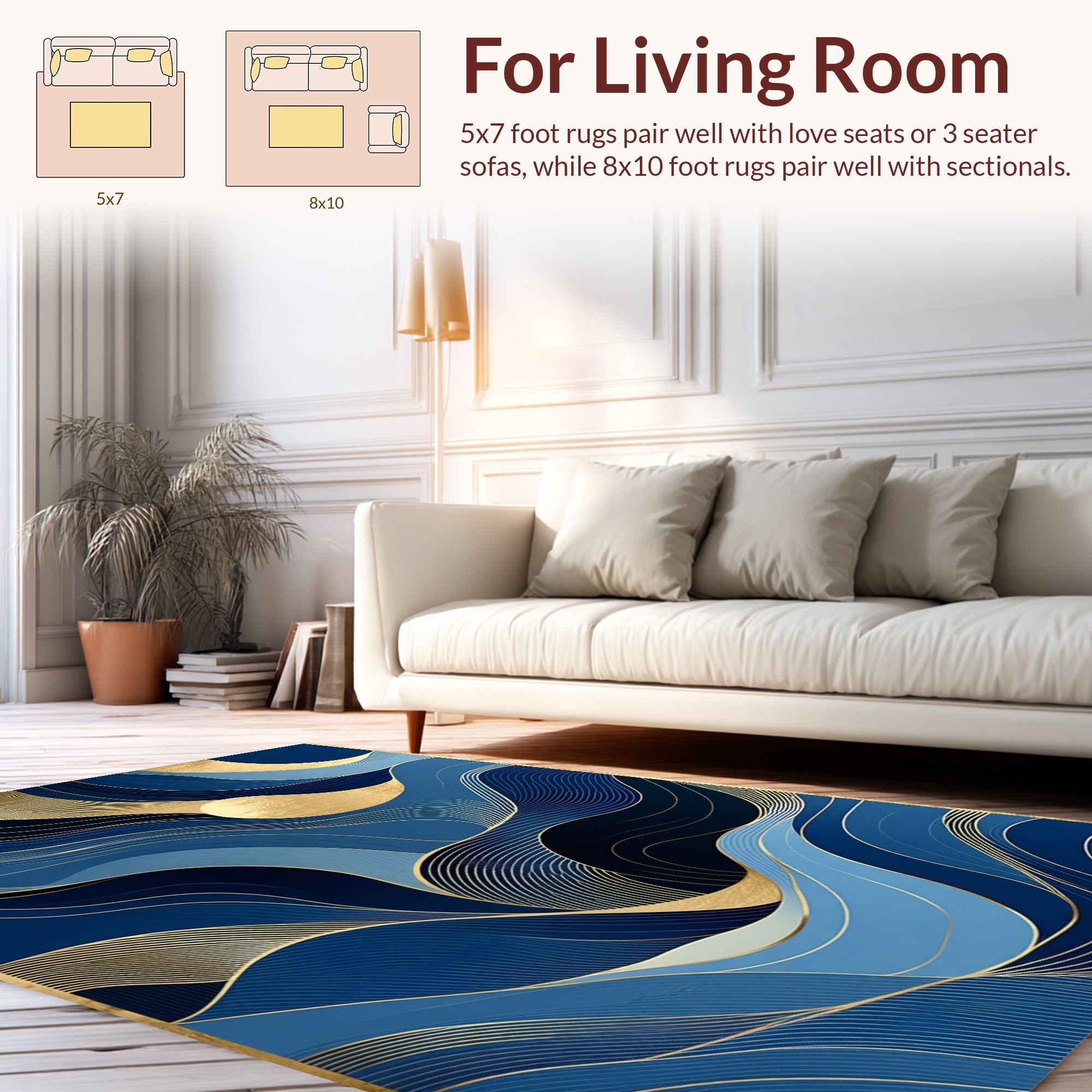 Flatwoven High Traffic Area Rug, Sophisticated Gold Accented Swirl Design, Non Slip, Stain Resistant, Washable Area Rugs for Living Room, Bedroom (Blue) Overview: