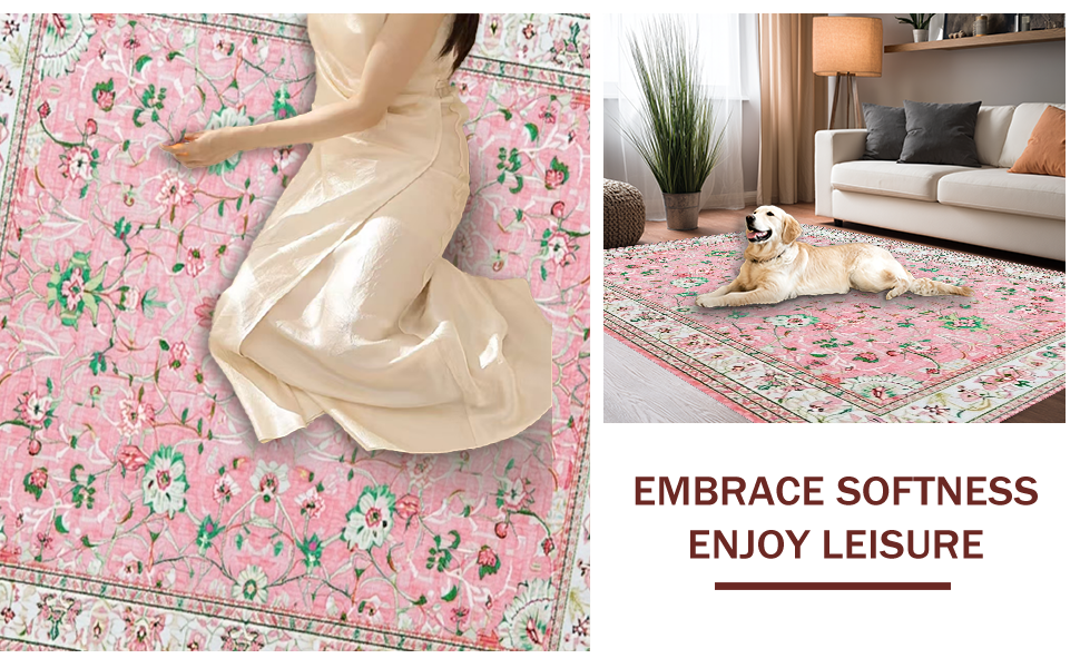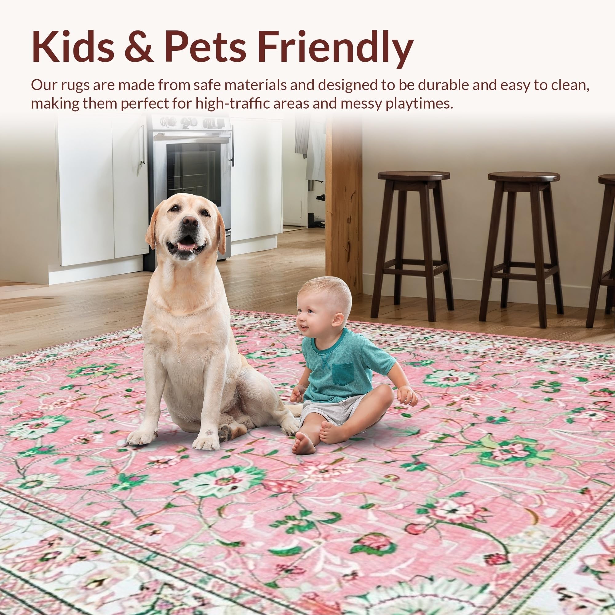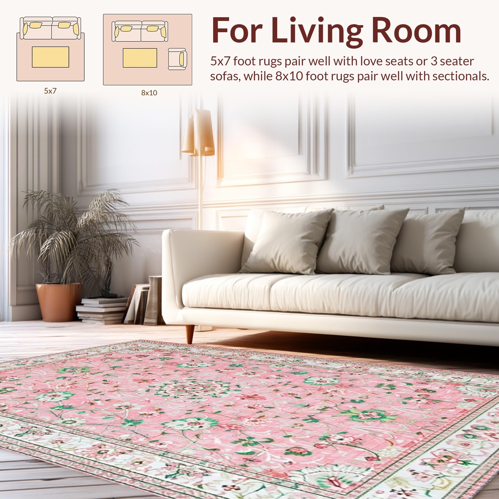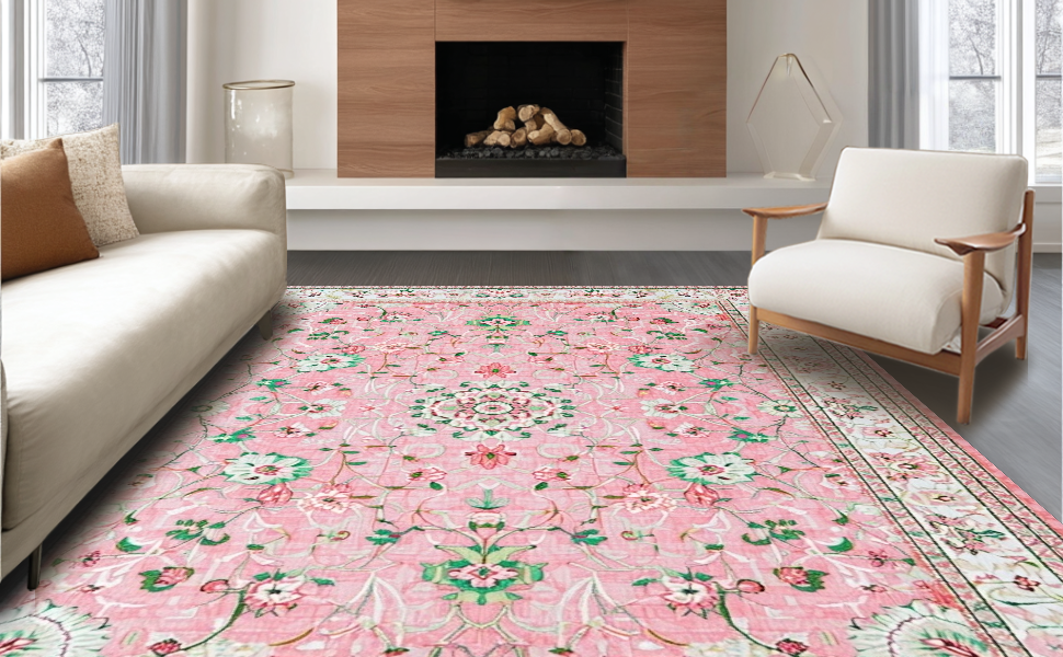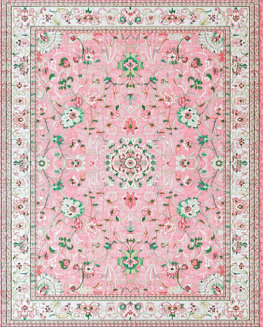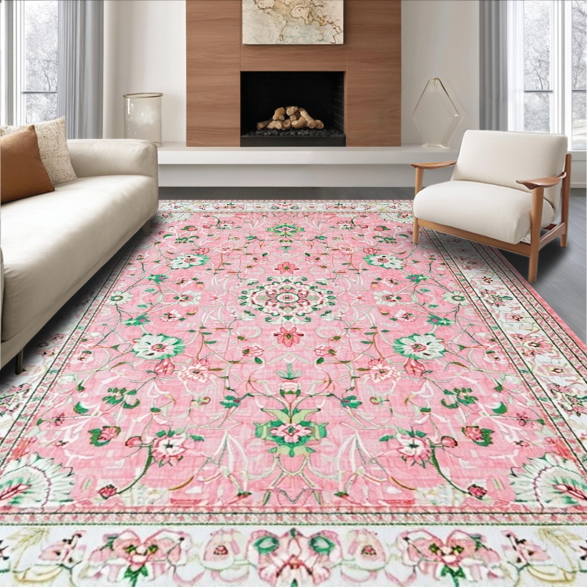Ultra Soft Area Rug, Non Slip, Stain Resistant, Washable Area Rugs for Living Room, Bedroom, Sophisticated Green Floral Tones(Pink) Overview: