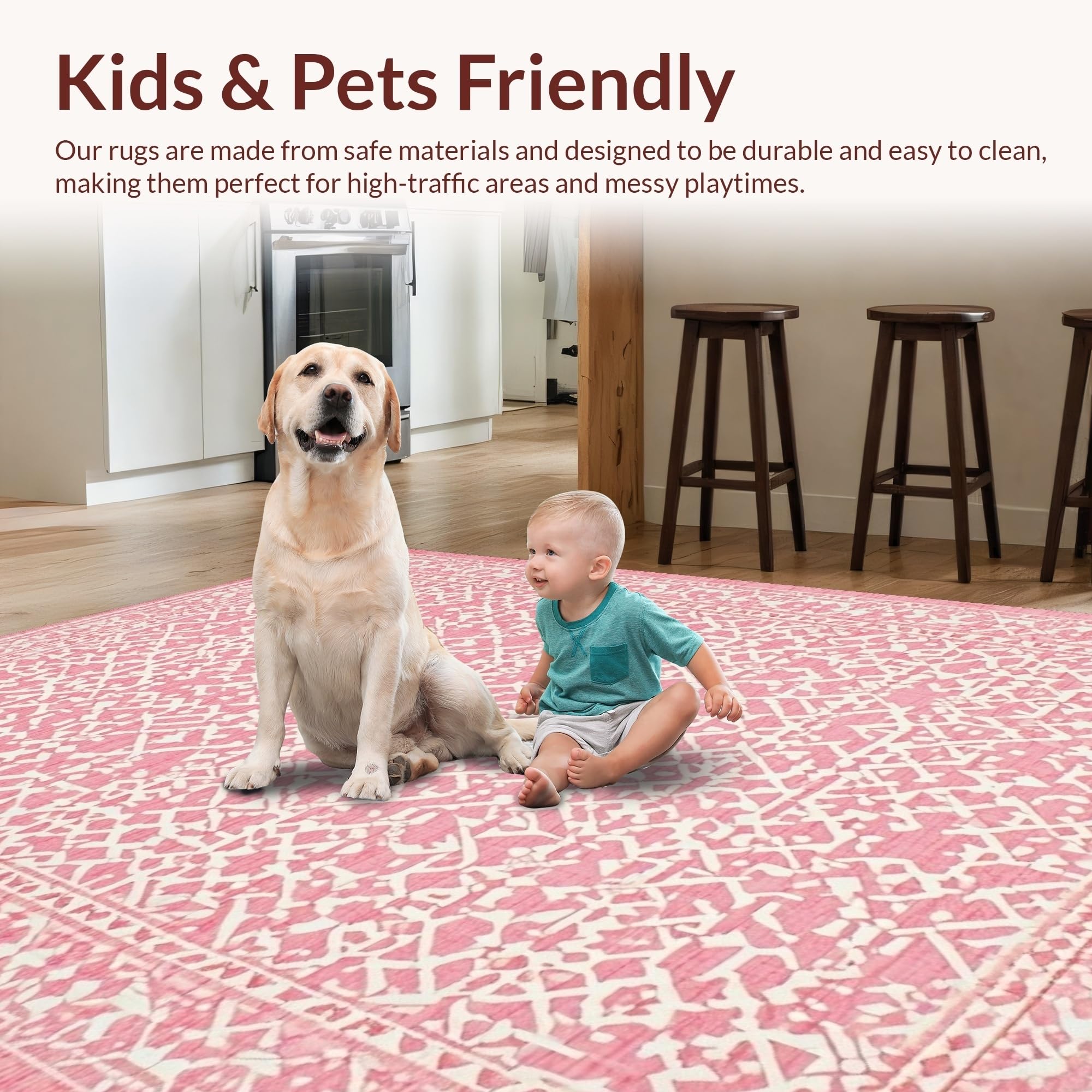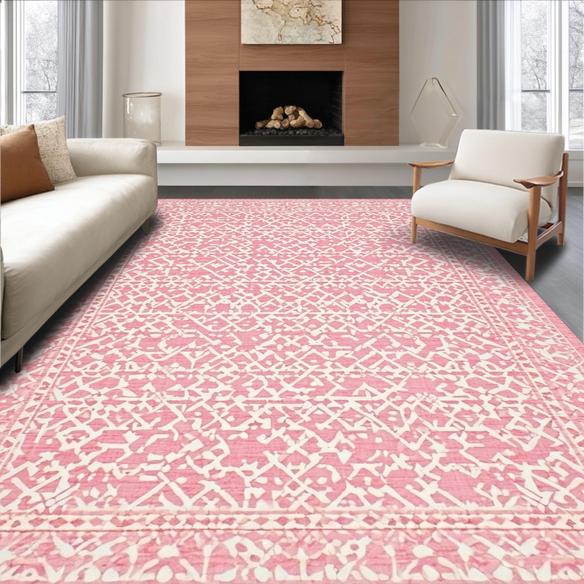 Ultra Soft Area Rug, Non Slip, Stain Resistant, Washable Area Rugs for Living Room, Bedroom, Sophisticated Ogee Pattern with Fresh Aesthetic(Pink) Overview: