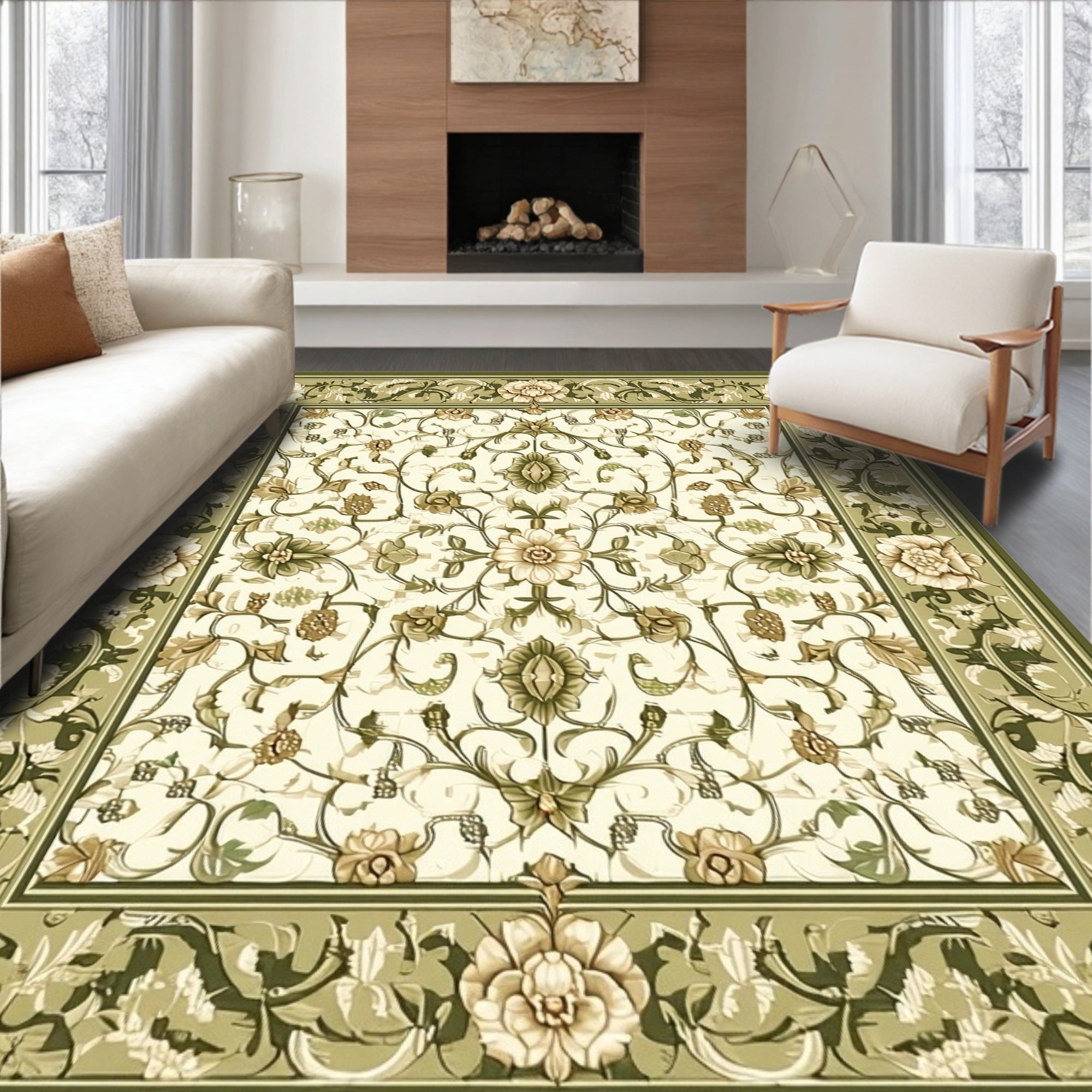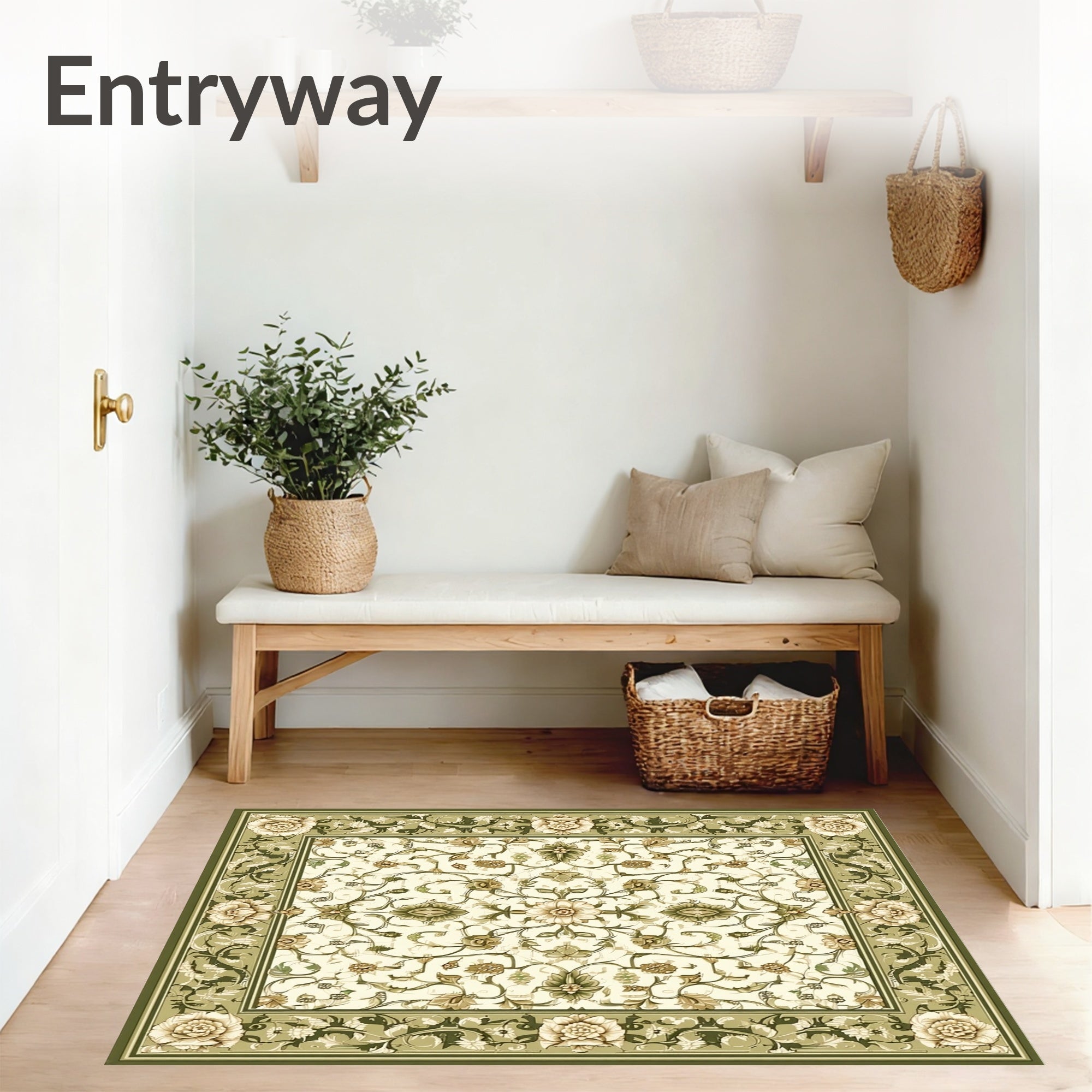 Flatwoven High Traffic Area Rug, Sophisticated Olive with Detailed Scrollwork and Floral Motifs, Non Slip, Stain Resistant, Washable Area Rugs for Living Room, Bedroom (Beige) Overview: