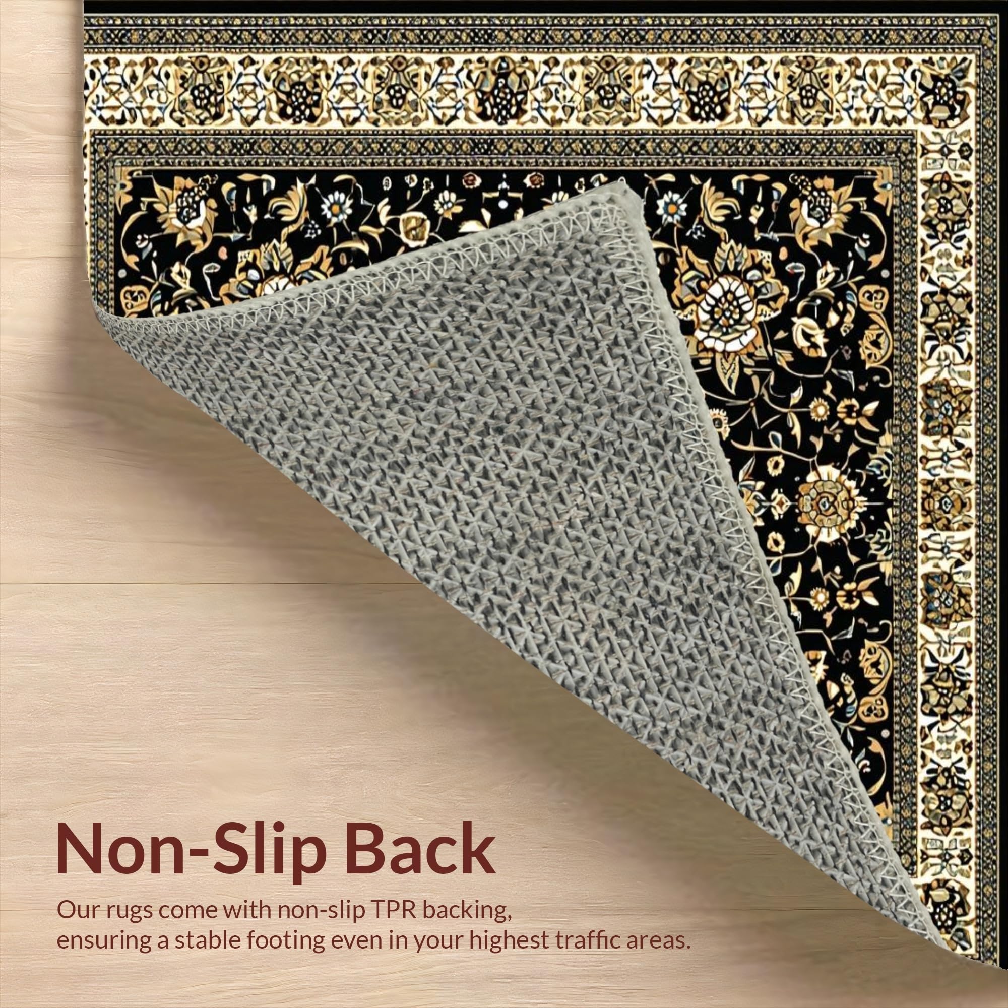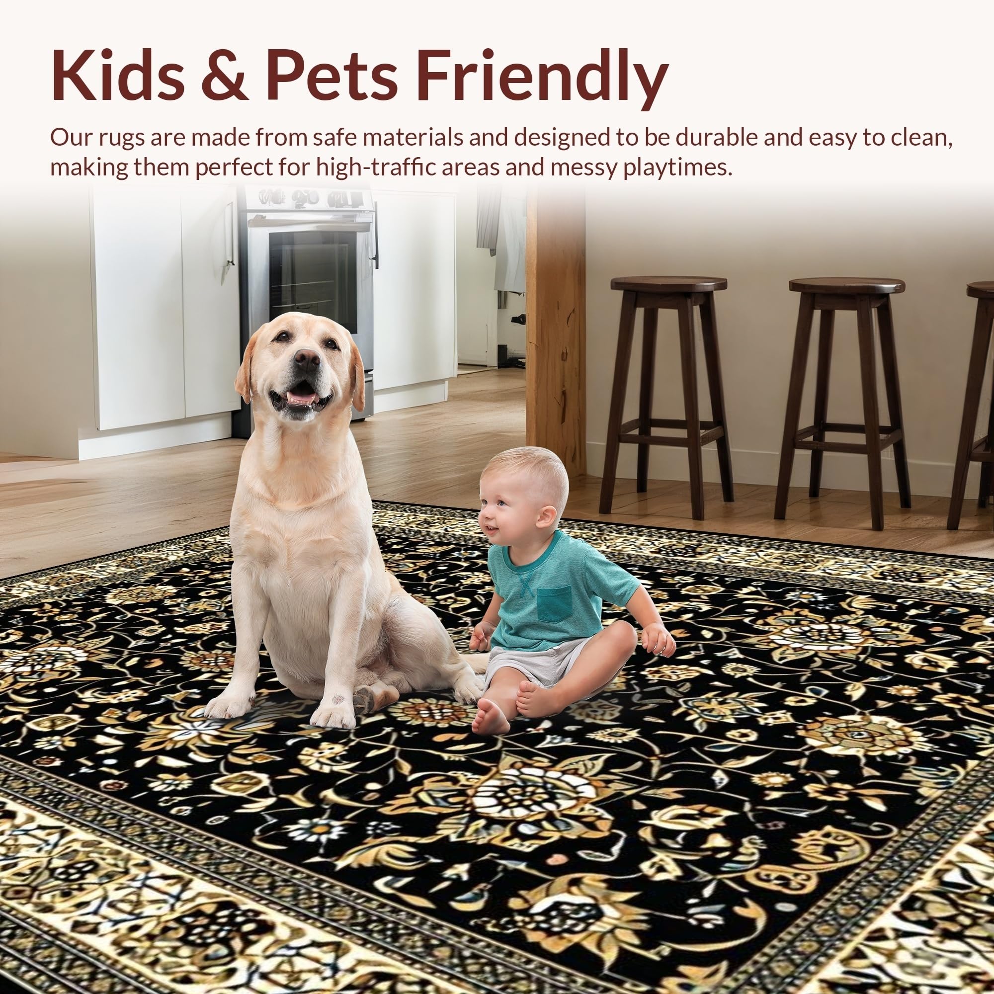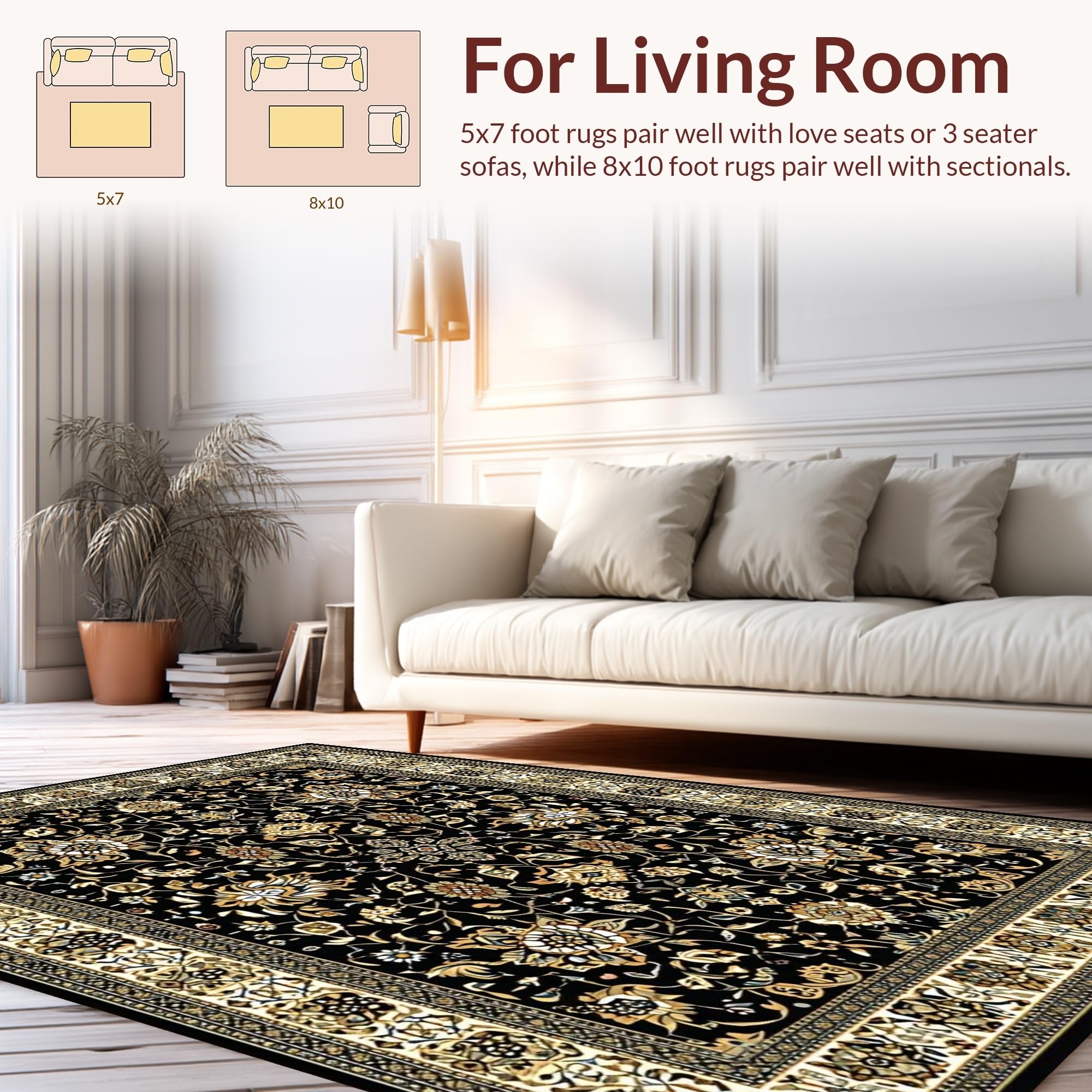 Ultra Soft Area Rug, Non Slip, Stain Resistant, Washable Area Rugs for Living Room, Bedroom, Sophisticated Vintage Floral Design(Black) Overview: