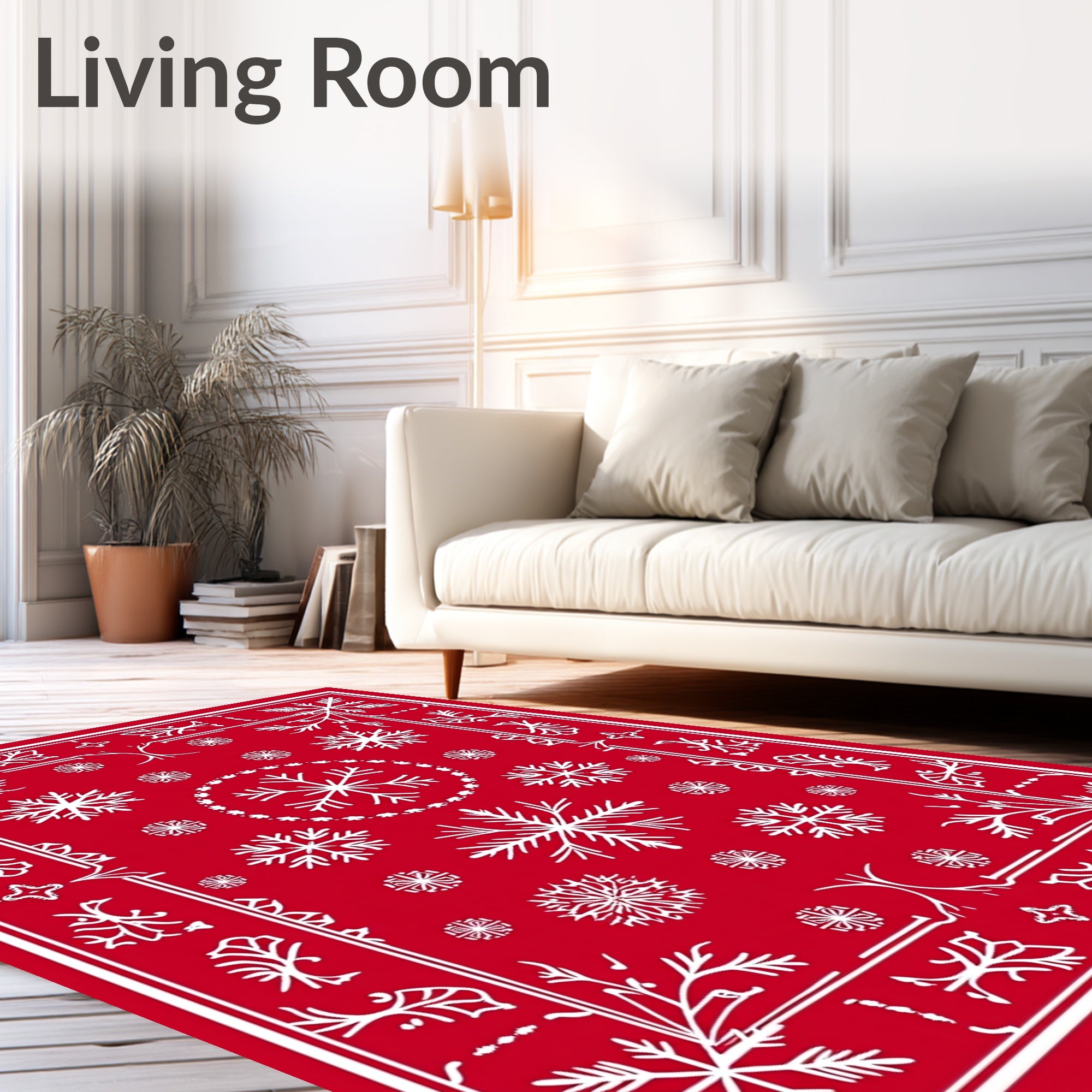 Ultra Soft Area Rug, Non Slip, Stain Resistant, Washable Area Rugs for Living Room, Bedroom, Starlight Snowflake Winter Wonderland(Red) Overview: