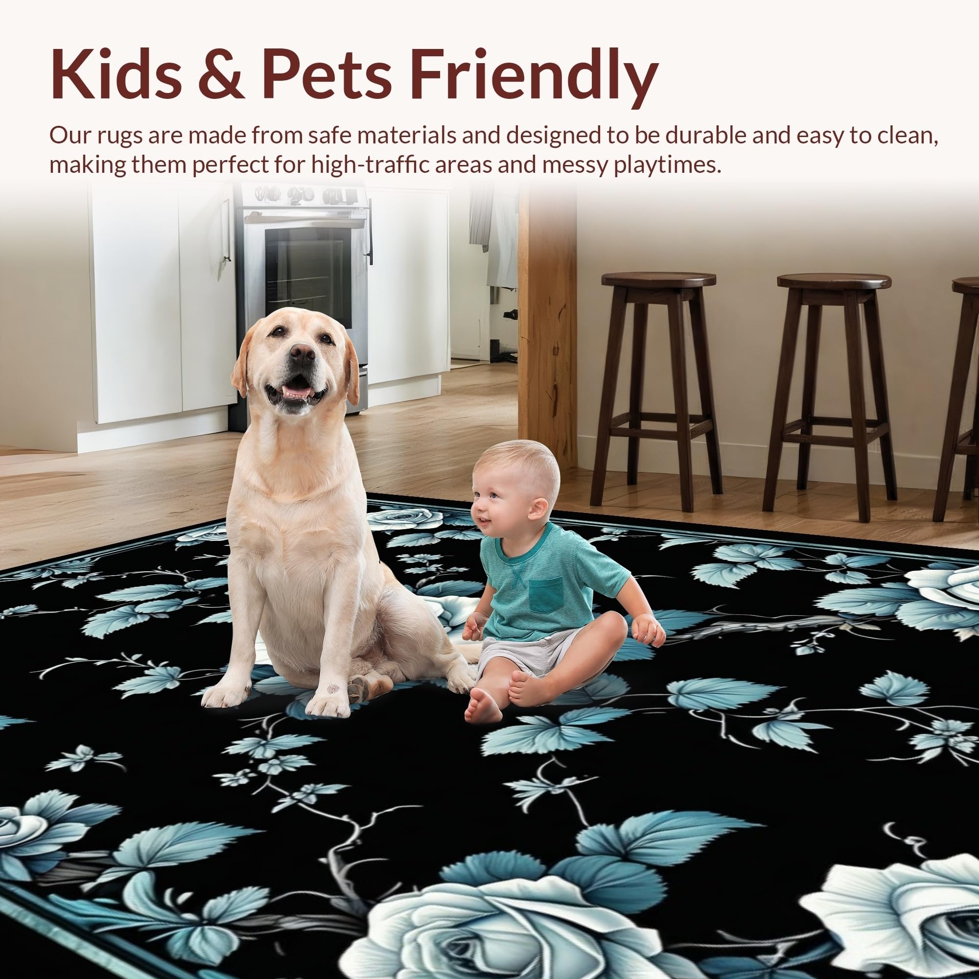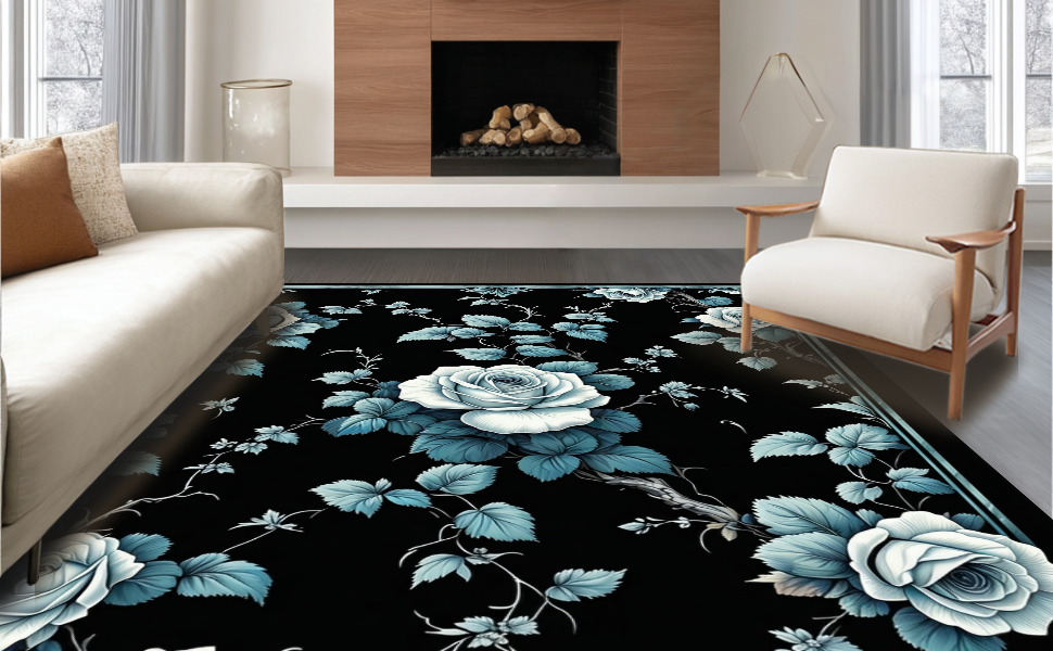 Ultra Soft Area Rug, Non Slip, Stain Resistant, Washable Area Rugs for Living Room, Bedroom, Striking Rose Patterned Sensation(Blue) Overview: