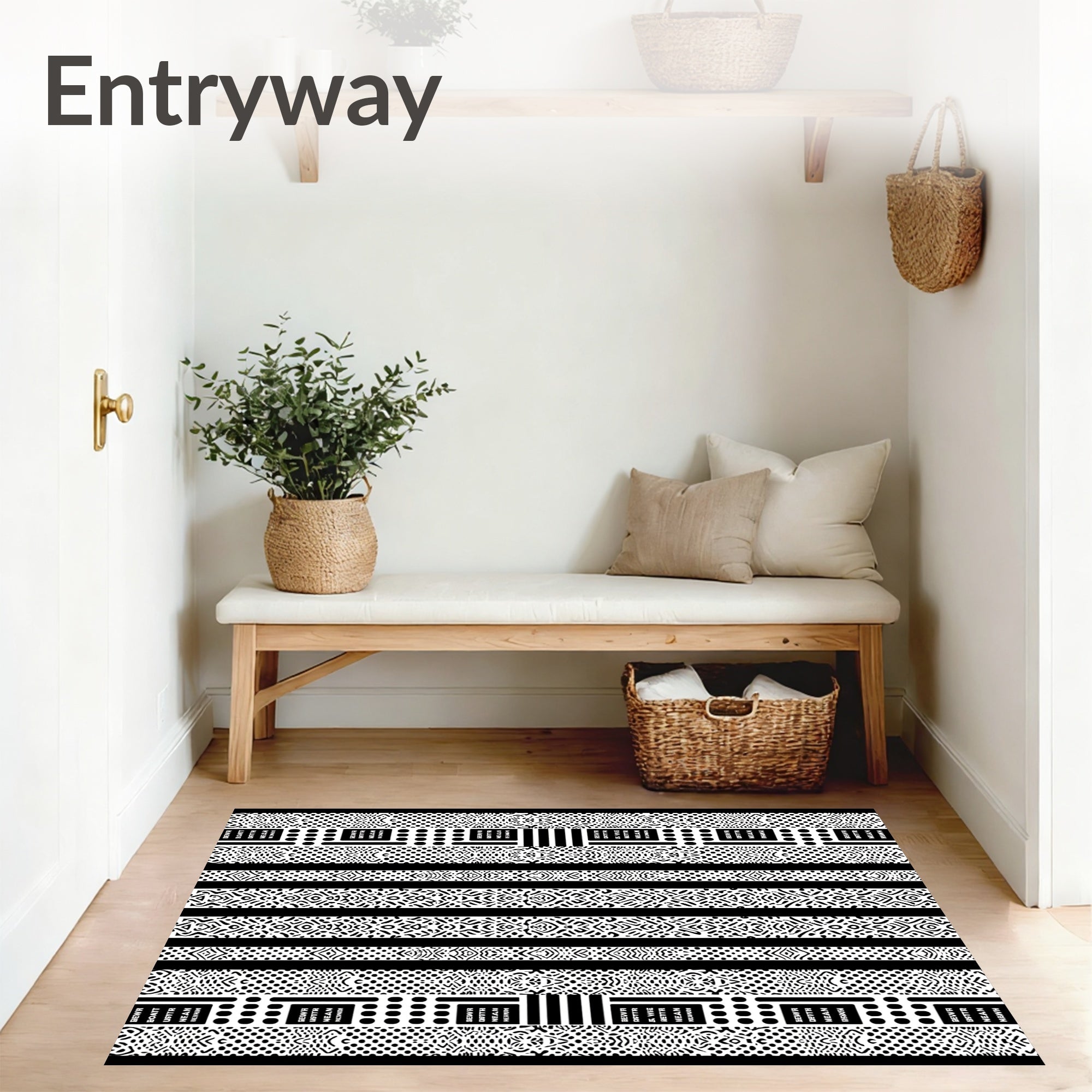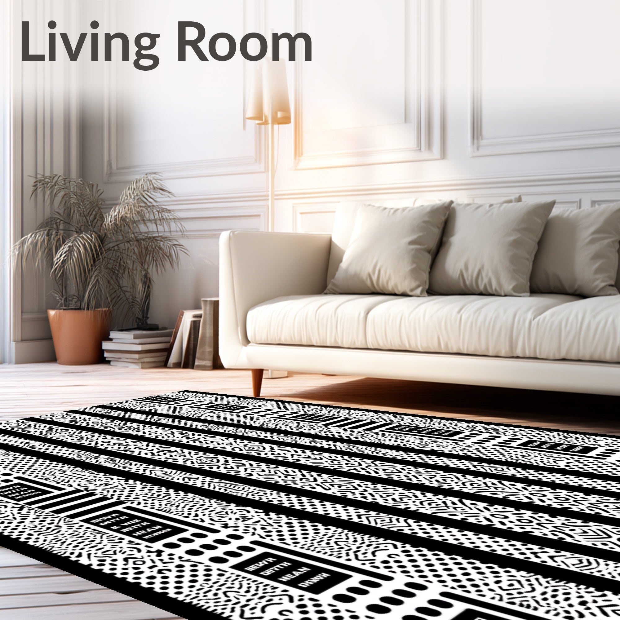 Ultra Soft Area Rug, Non Slip, Stain Resistant, Washable Area Rugs for Living Room, Bedroom, Striped Modern with Abstract Polka Motifs(Black) Overview: