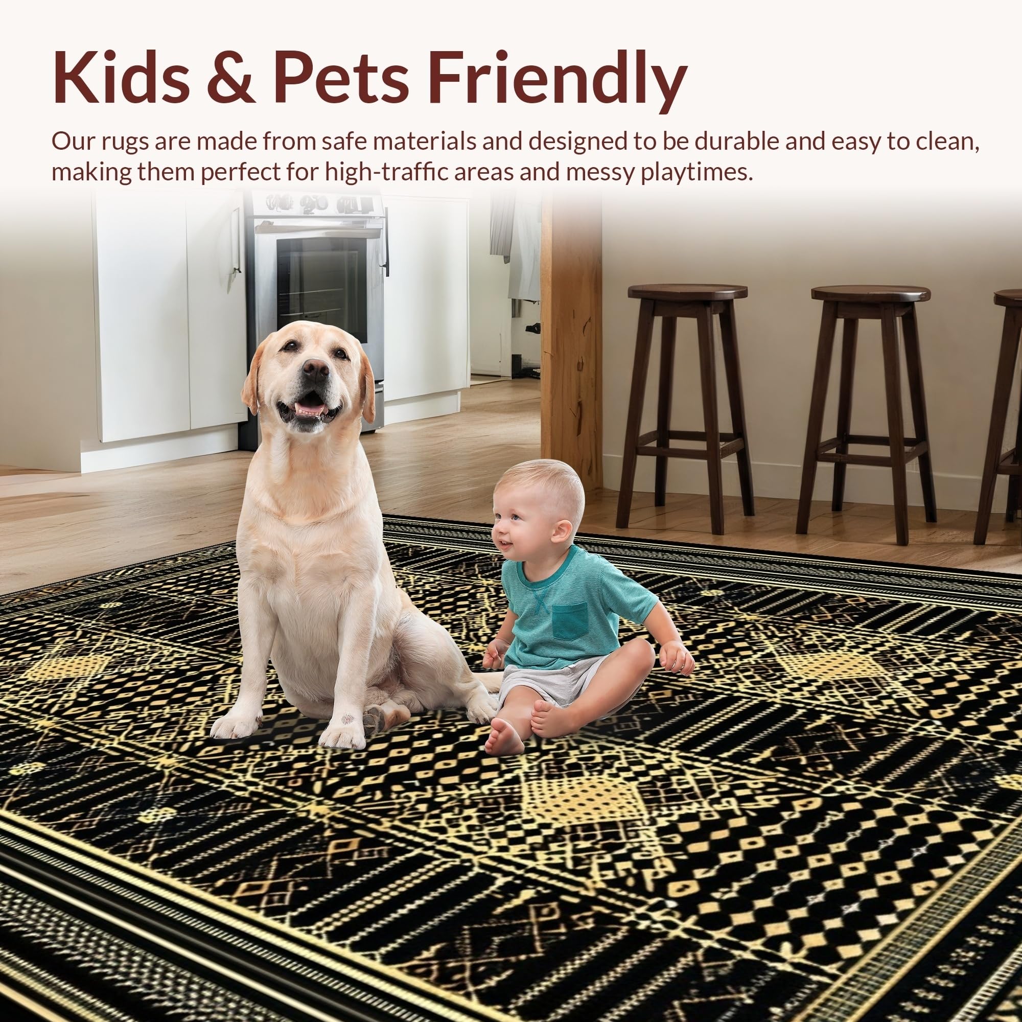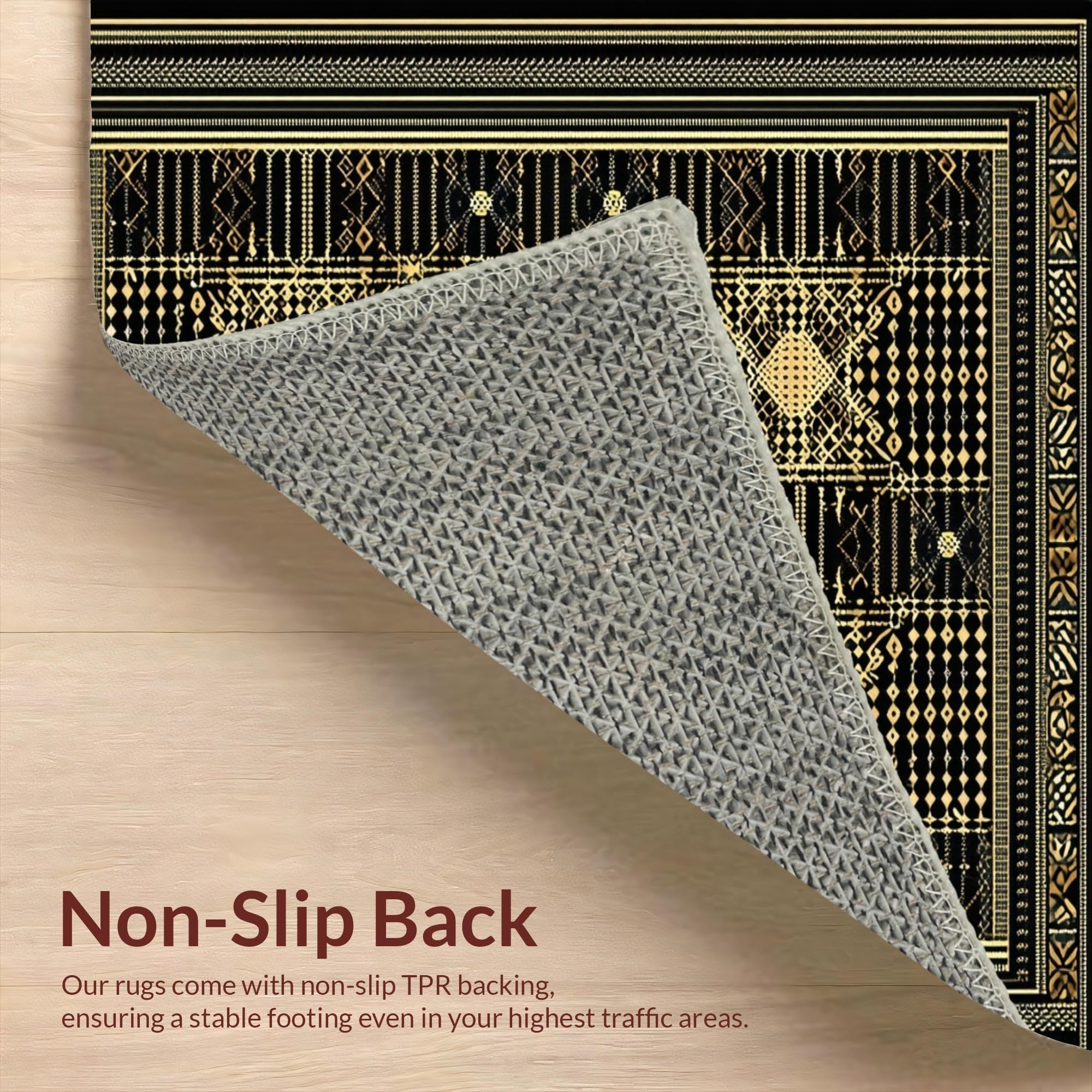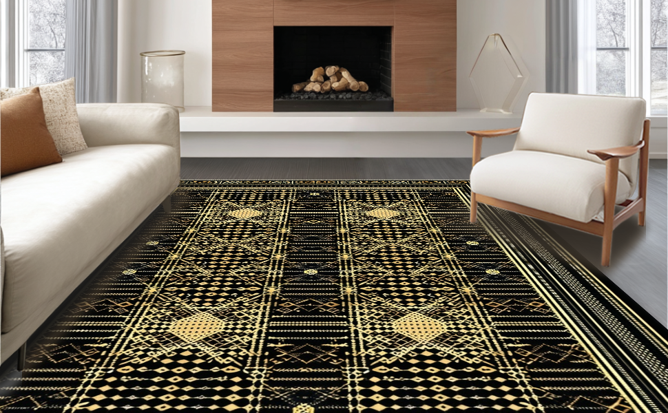 Ultra Soft Area Rug, Non Slip, Stain Resistant, Washable Area Rugs for Living Room, Bedroom, Stylish Abstract Black and Gold Motif(Black) Overview: