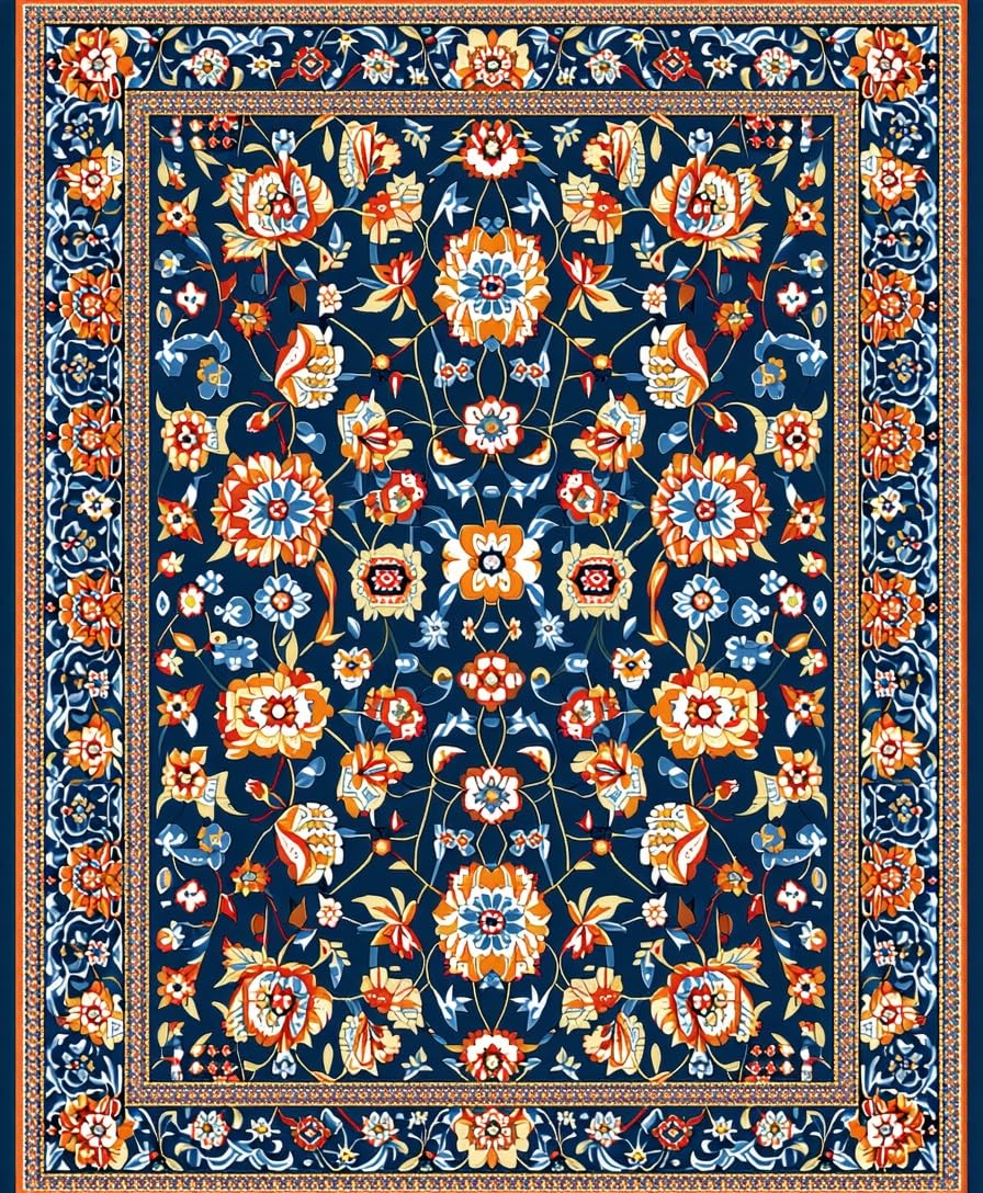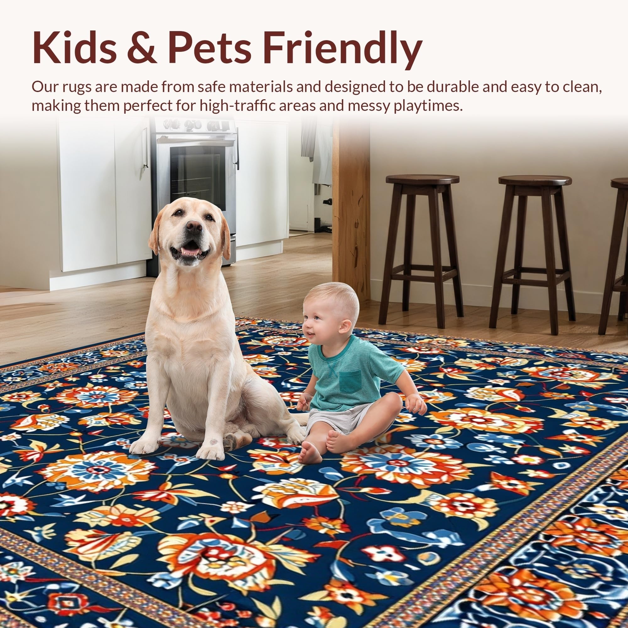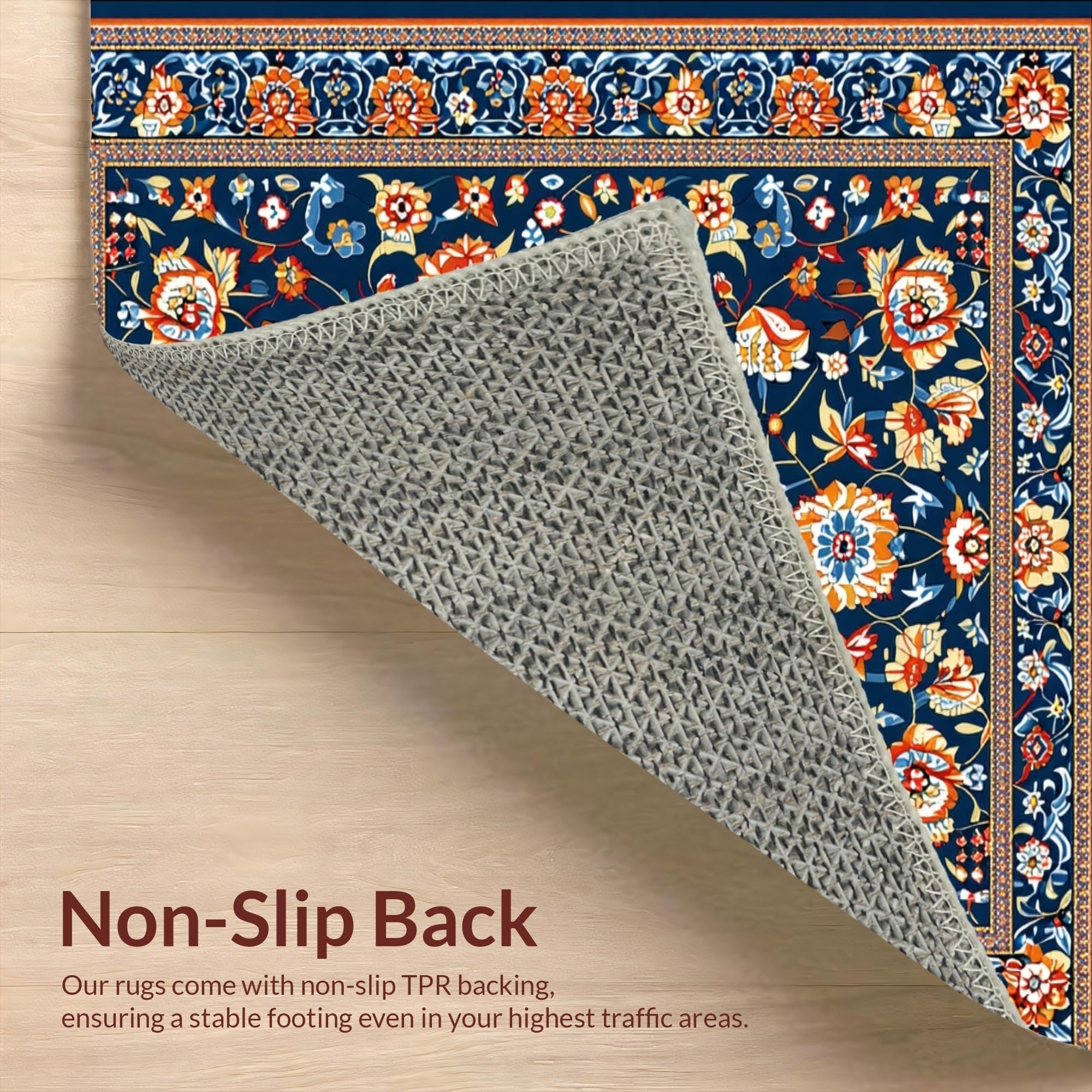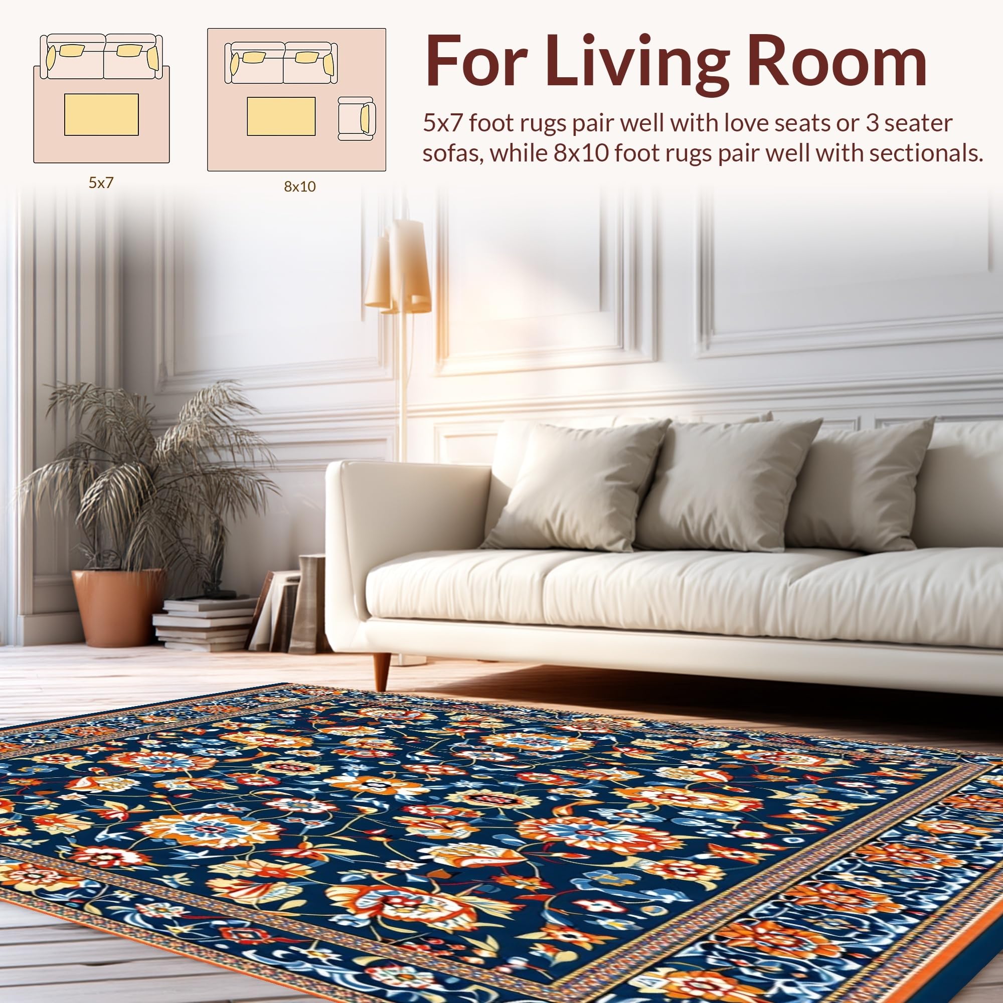 Ultra Soft Area Rug, Non Slip, Stain Resistant, Washable Area Rugs for Living Room, Bedroom, Stylish Area with Elegant Dual Tone Blue and Orange Floral(Blue) Overview: