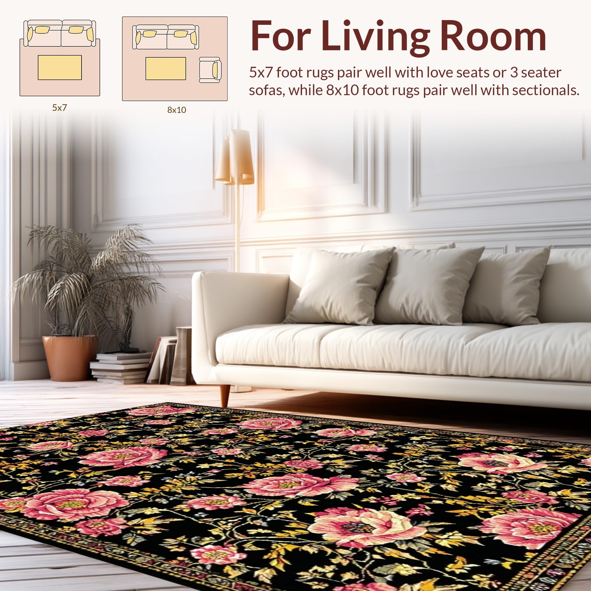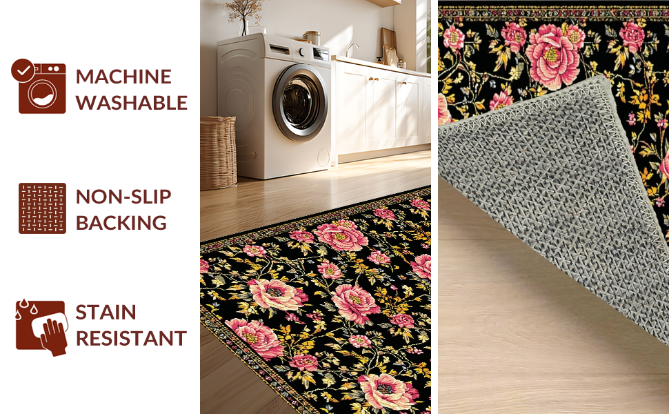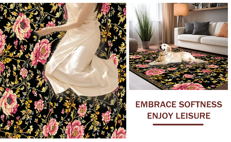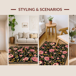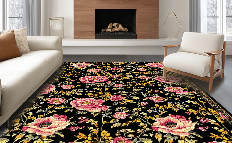 Ultra Soft Area Rug, Non Slip, Stain Resistant, Washable Area Rugs for Living Room, Bedroom, Stylish Earthy Floral Arrangement(Black) Overview: