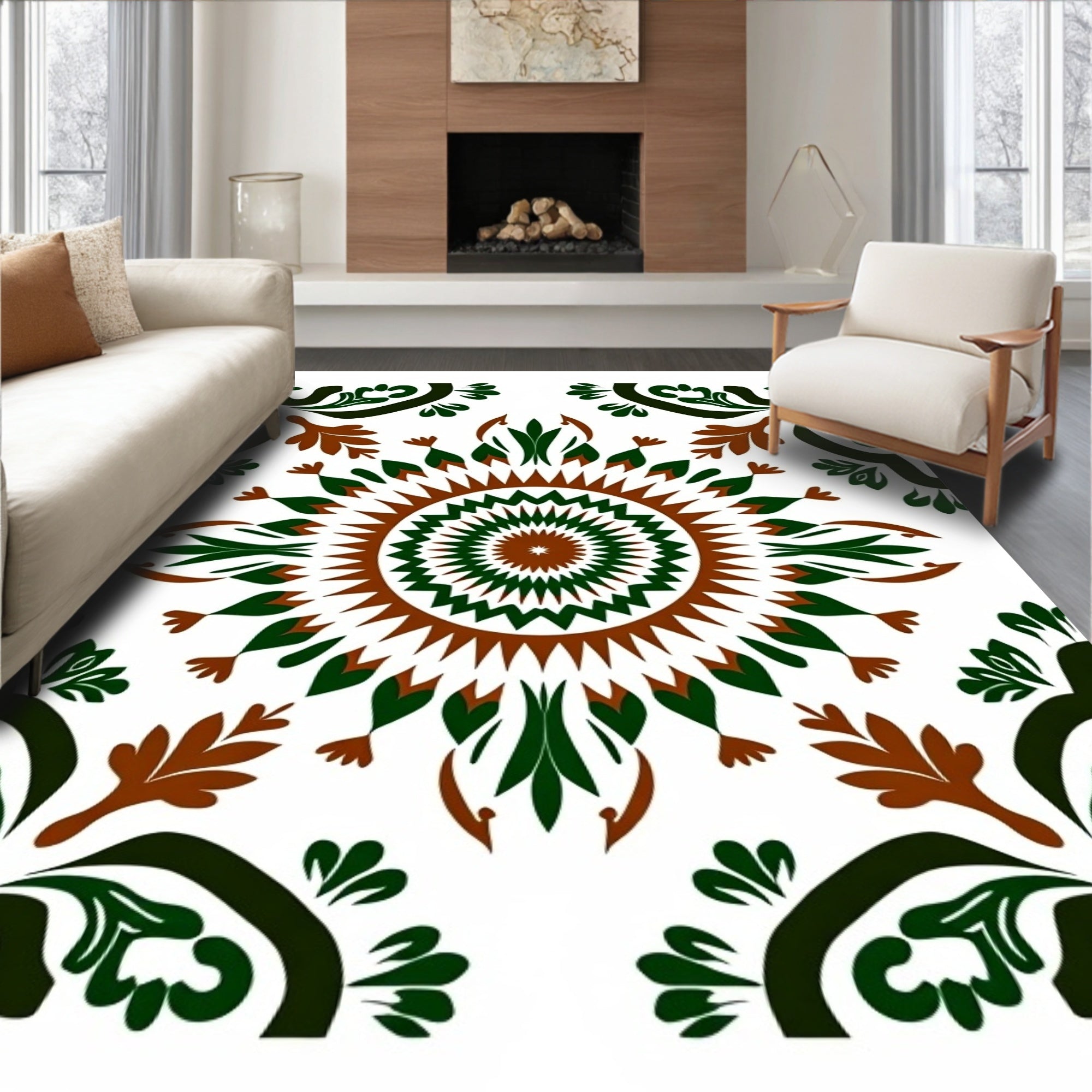 Elevate your living room with this striking Radial Floral Pattern Area Rug, featuring a bold fusion of forest green and earthen terracotta on a crisp white backdrop. This vintage-inspired piece combines traditional symmetry with a modern, high-contrast palette to create a captivating focal point in any home. Designed for the demands of modern life, the rug is exceptionally durable and features a low-maintenance, low pile height that easily fits under doors. For ultimate convenience, it is machine washable and certified to OEKO-TEX Standard 100, ensuring your space remains both healthy and stylish. Whether scaling up to a large area rug or accenting a cozy corner, its timeless motif offers lasting beauty for high-traffic areas.