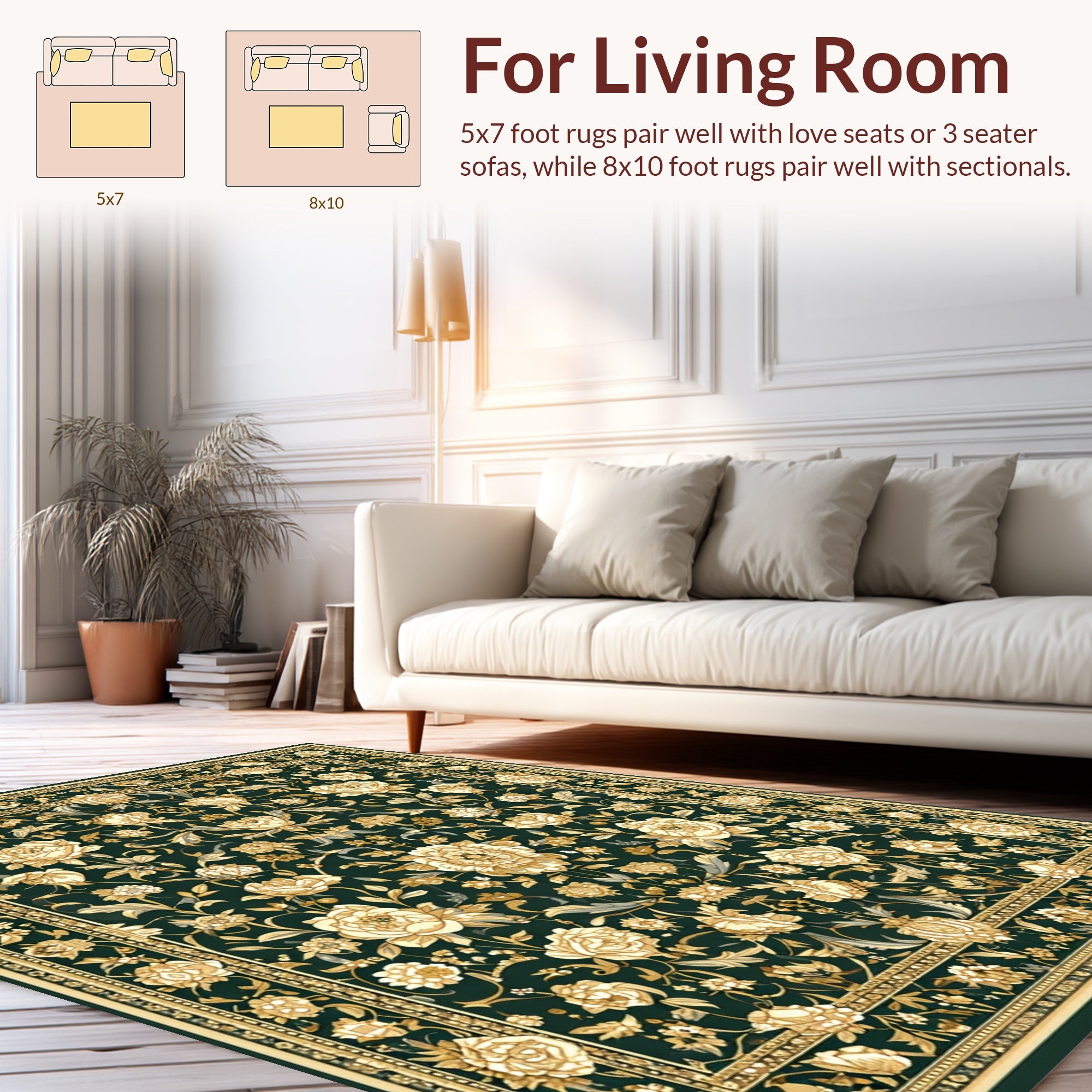 Flatwoven High Traffic Area Rug, Timeless Heritage Floral Artistry, Non Slip, Stain Resistant, Washable Area Rugs for Living Room, Bedroom (Green) Overview: