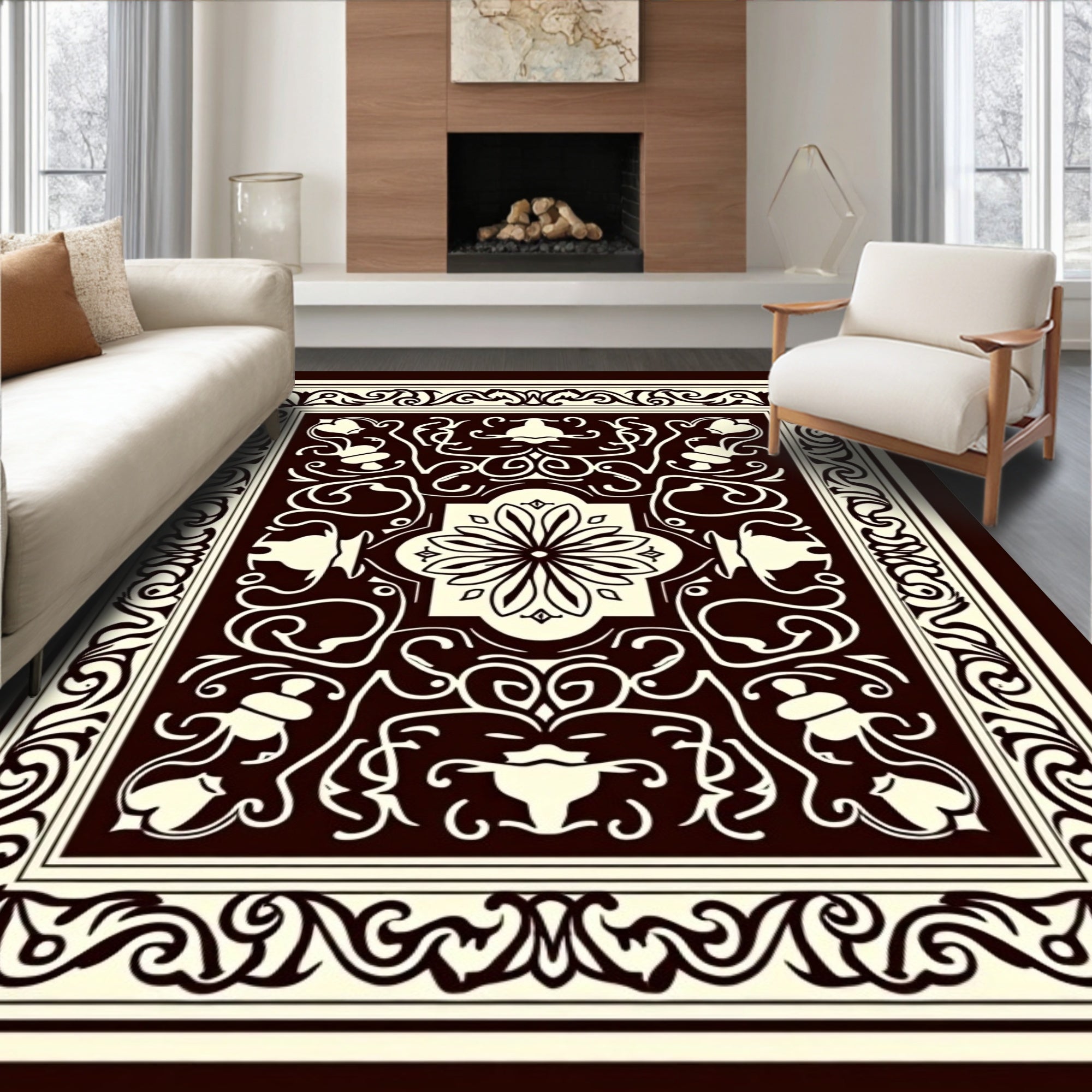 Flatwoven High Traffic Area Rug, Traditional Coffeehouse Damask with Intricate Brewing Vessel Motifs, Non Slip, Stain Resistant, Washable Area Rugs for Living Room, Bedroom (Brown) Overview: