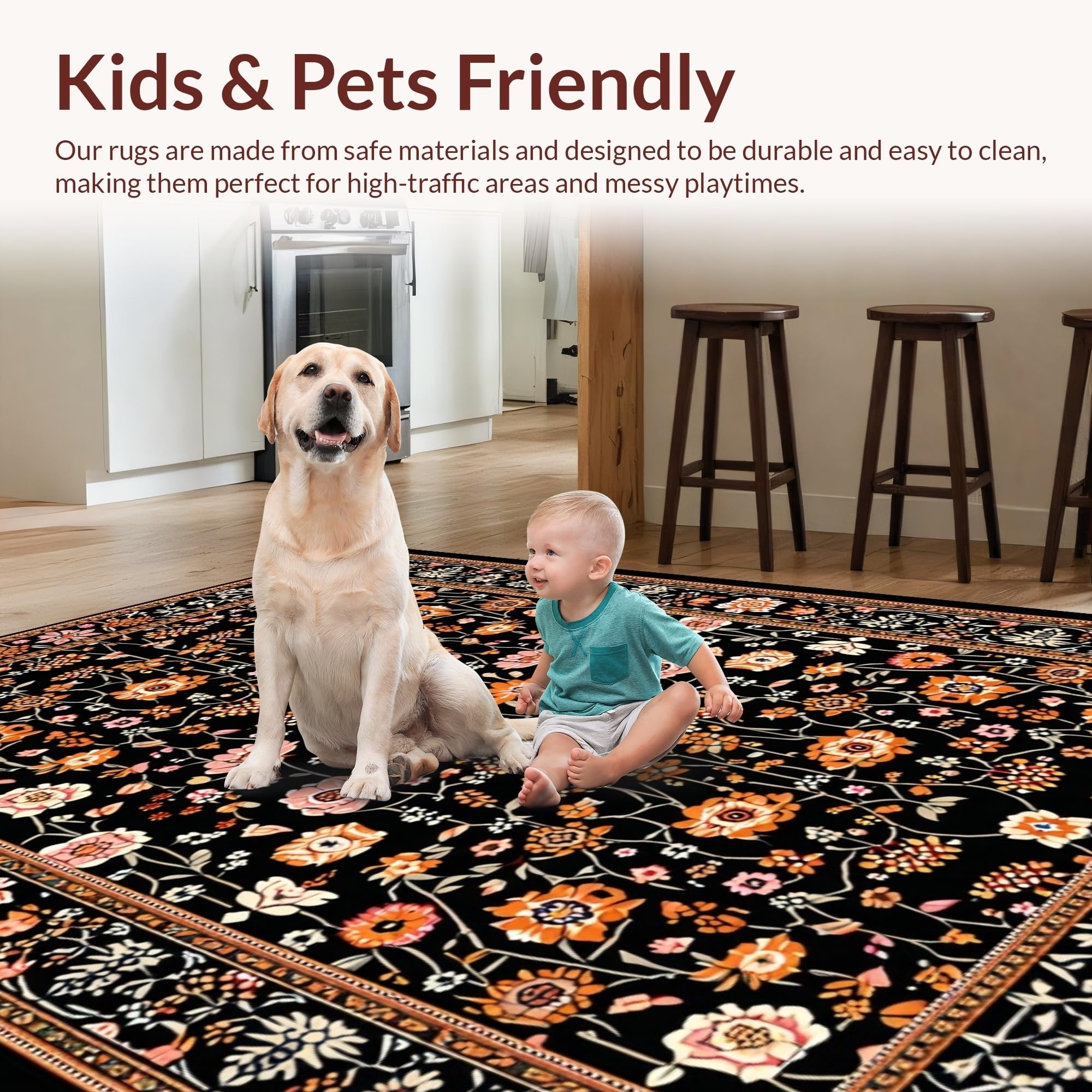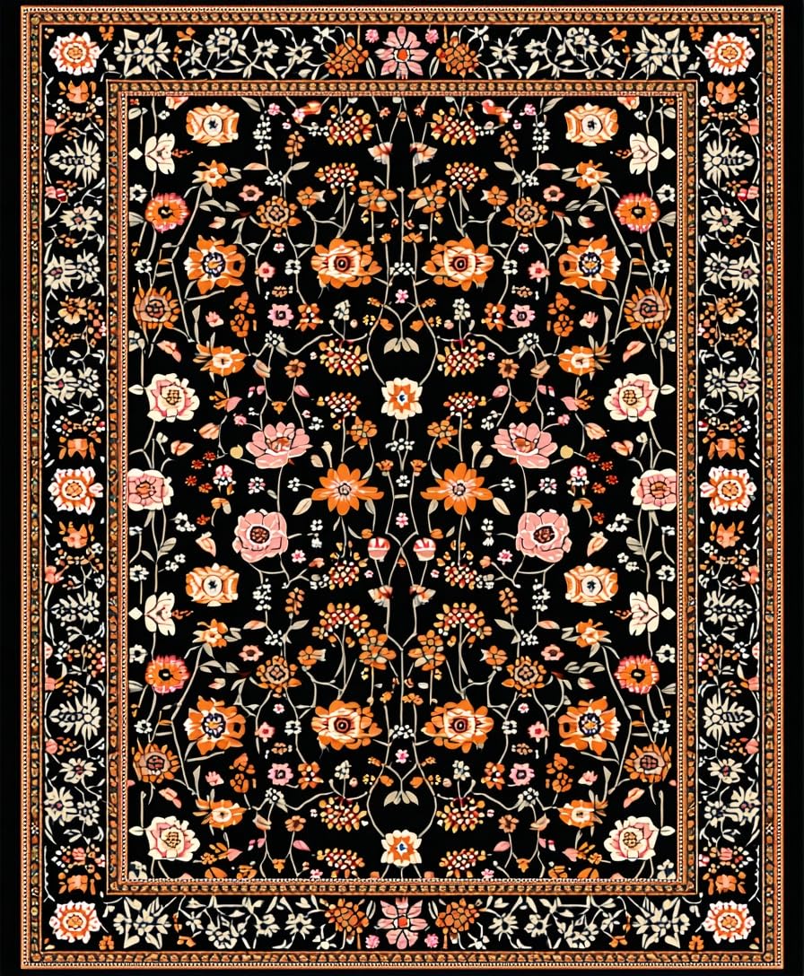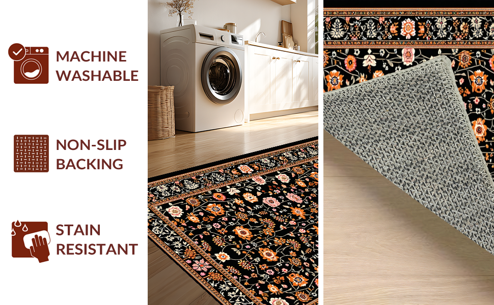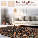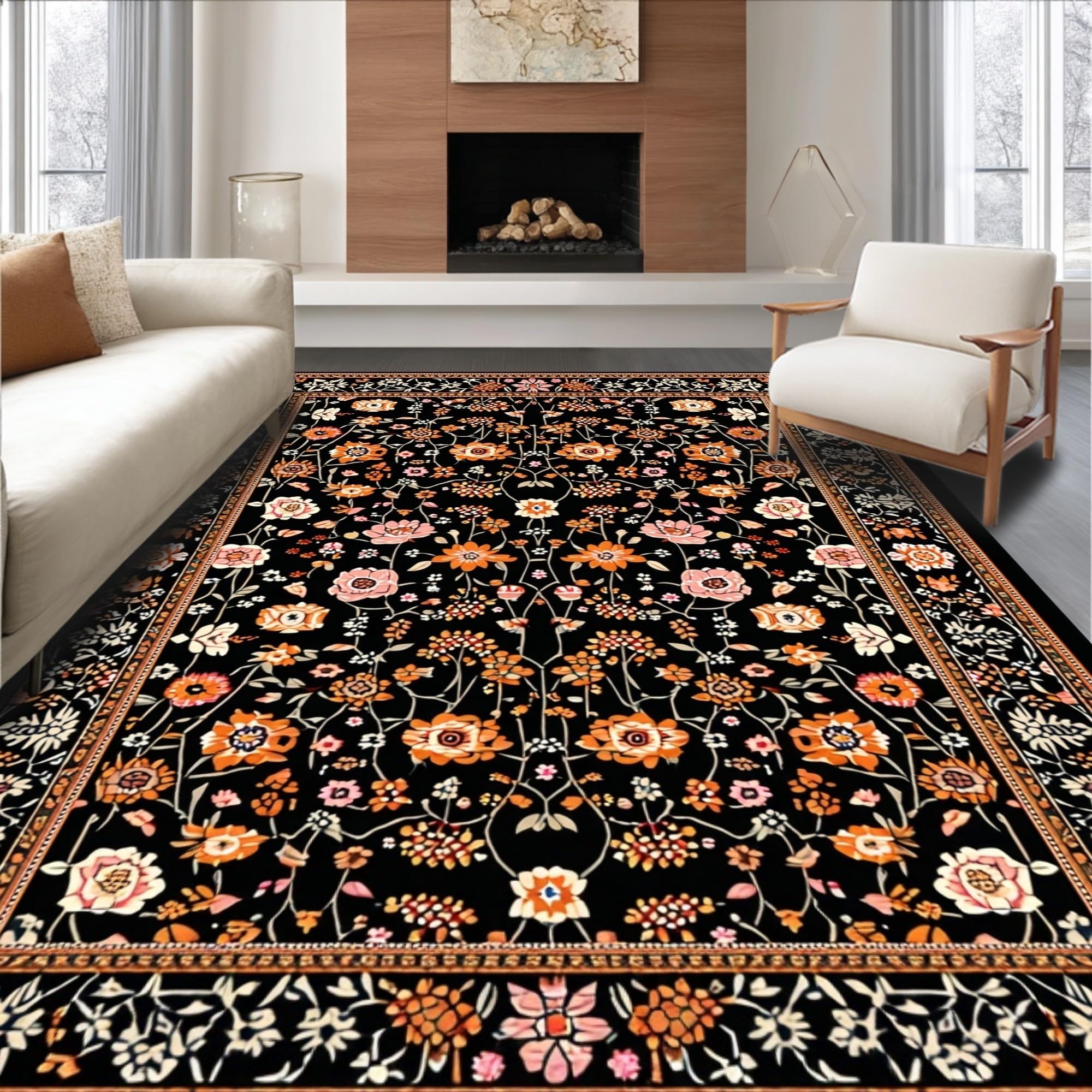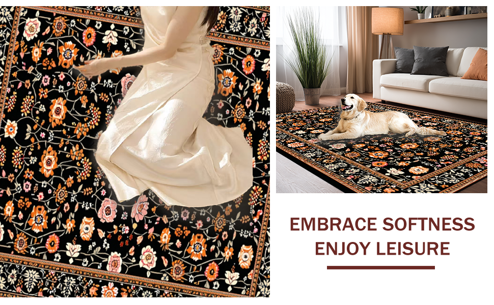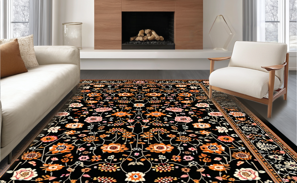 Ultra Soft Area Rug, Non Slip, Stain Resistant, Washable Area Rugs for Living Room, Bedroom, Transitional Cozy Floral Elements(Black) Overview: