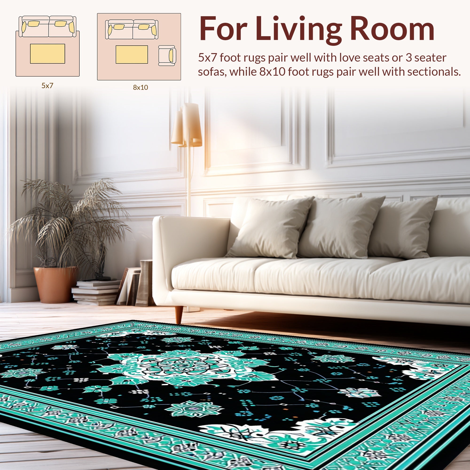 Flatwoven High Traffic Area Rug, Trendy Black Teal Geometric Blend, Non Slip, Stain Resistant, Washable Area Rugs for Living Room, Bedroom (Black) Overview: