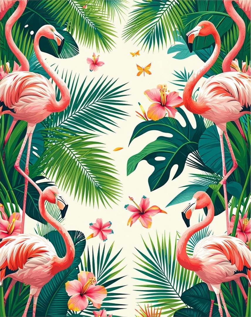 Tropical Flamingo Green Palm Leaves with Vibrant Jungle Flora Motif(Pink)