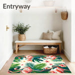 Flatwoven High Traffic Area Rug, Tropical Flamingo Green Palm Leaves with Vibrant Jungle Flora Motif, Non Slip, Stain Resistant, Washable Area Rugs for Living Room, Bedroom (Pink) Overview: