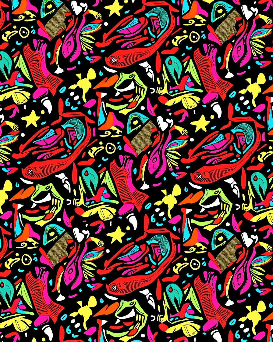 Tropical Reptile Mosaic with Exotic Fish and Motifs(Red)