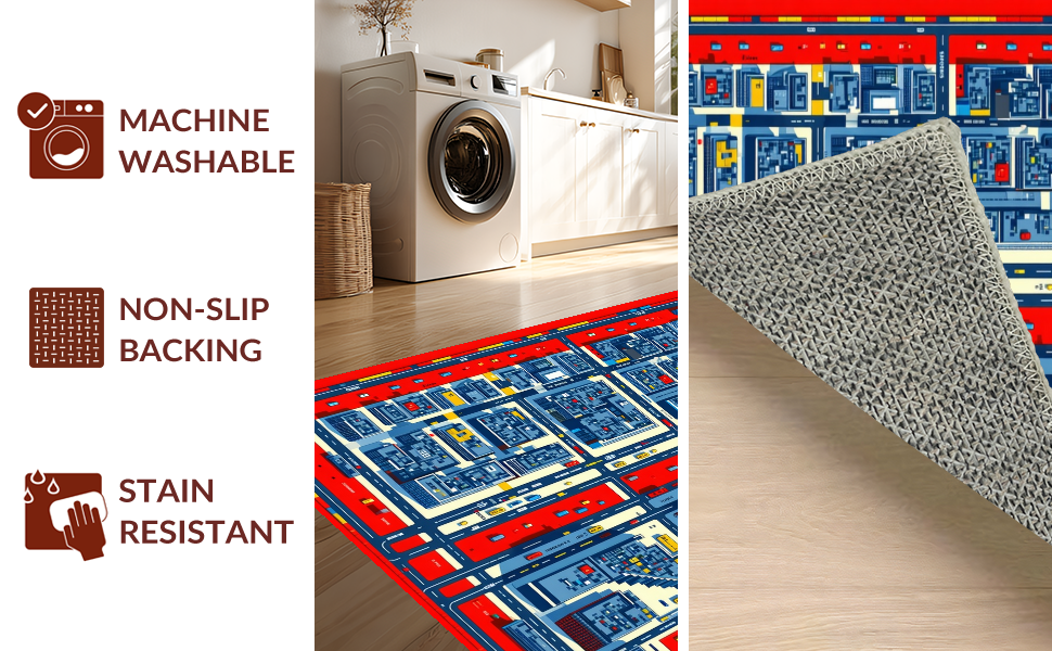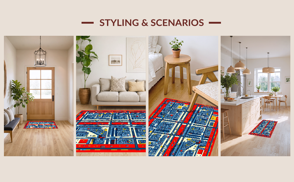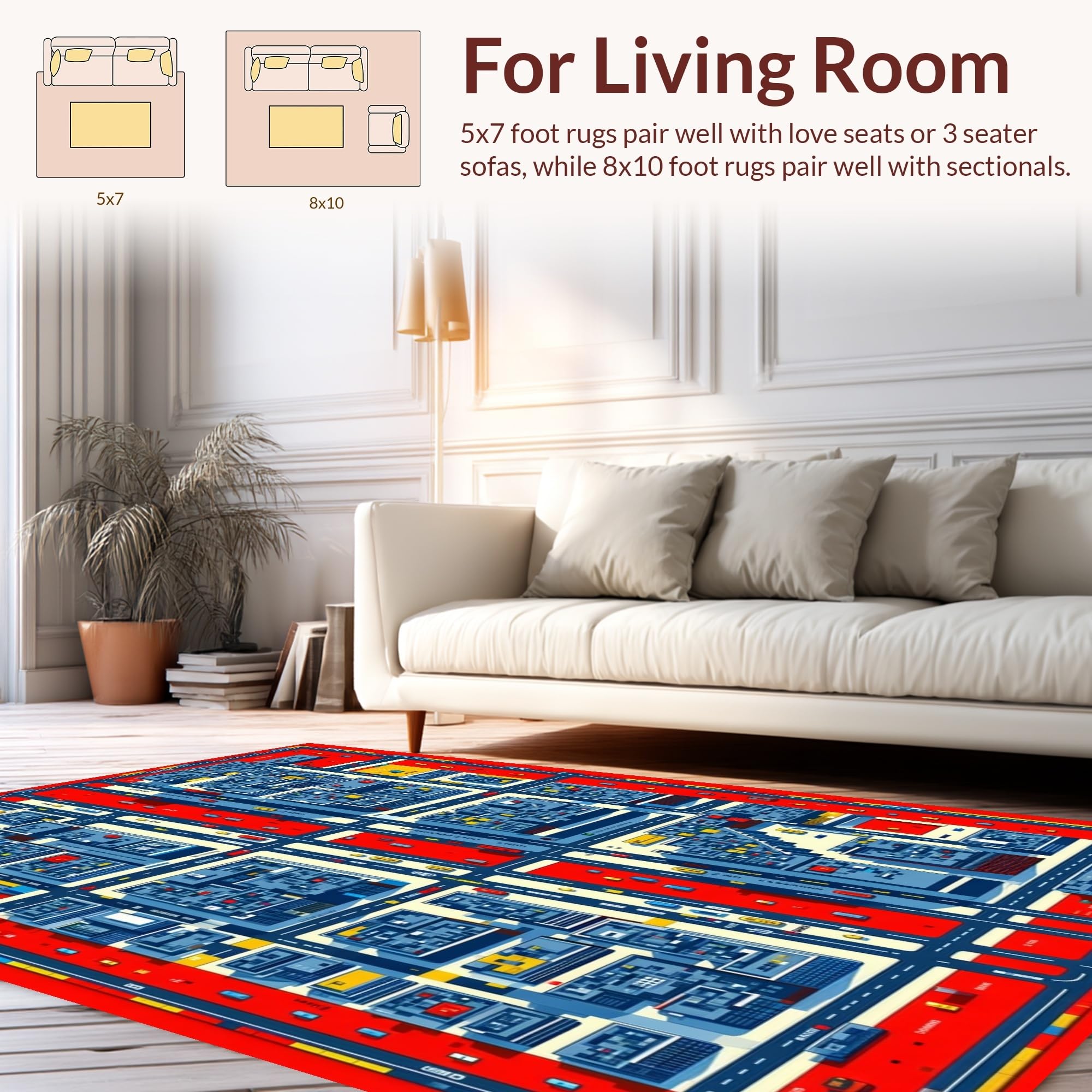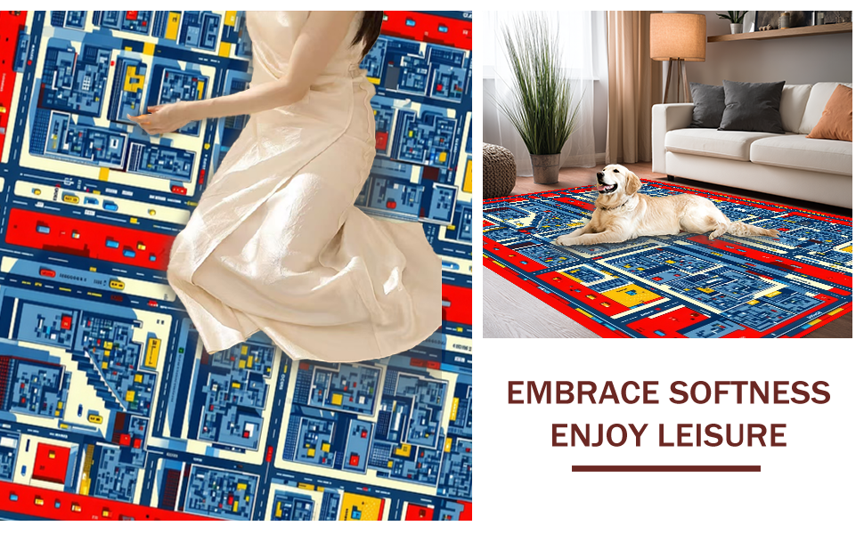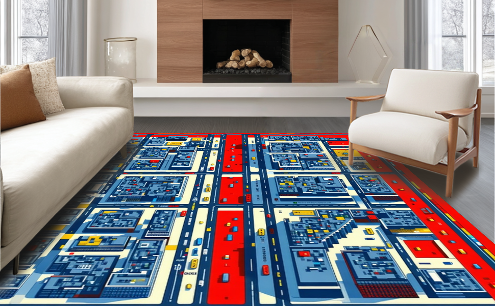 Ultra Soft Area Rug, Non Slip, Stain Resistant, Washable Area Rugs for Living Room, Bedroom, Vibrant Cityscape Adventure Design(Blue) Overview:
